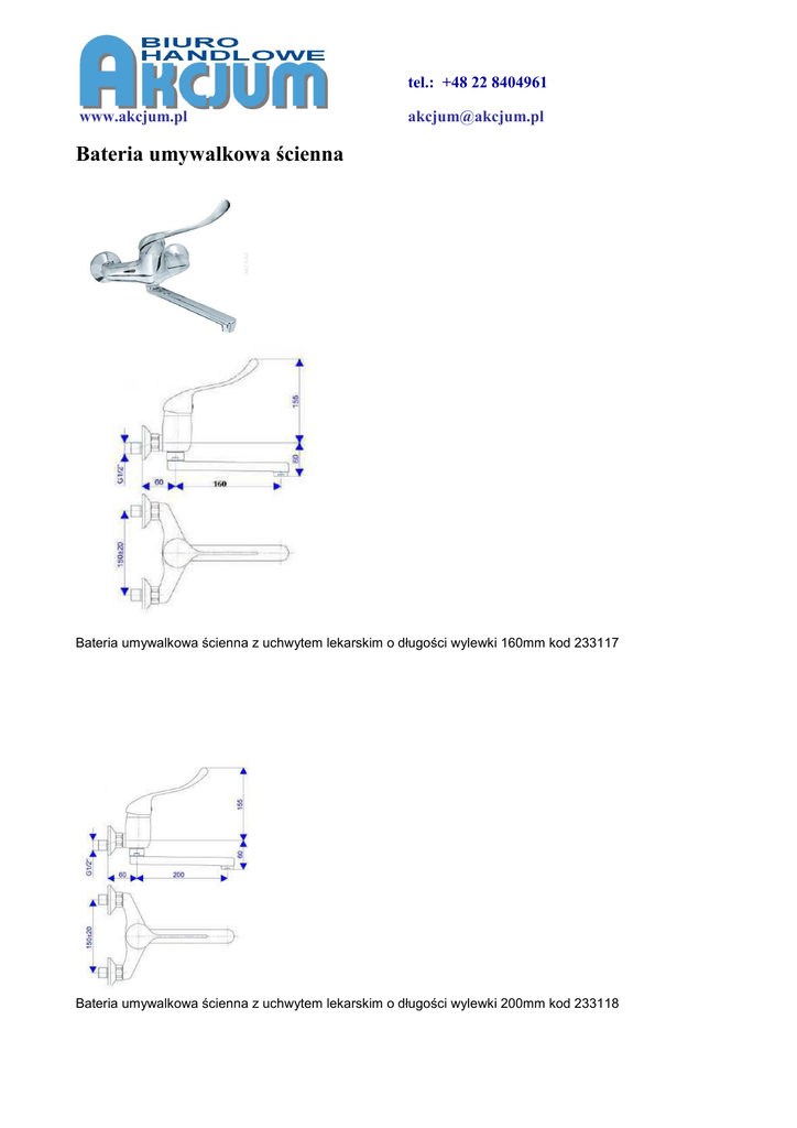 tel.: +48 22 8404961 www.akcjum.pl [email protected] Bateria umywalkowa ścienna Bateria umywalkowa ścienna z uchwytem lekarskim o długości wylewki 160mm kod 233117 Bateria umywalkowa ścienna z uchwytem lekarskim o długości wylewki 200mm kod 233118 tel.: +48 22 8404961 www.akcjum.pl [email protected] Bateria umywalkowa ścienna z uchwytem lekarskim o długości wylewki 300mm kod 233119
