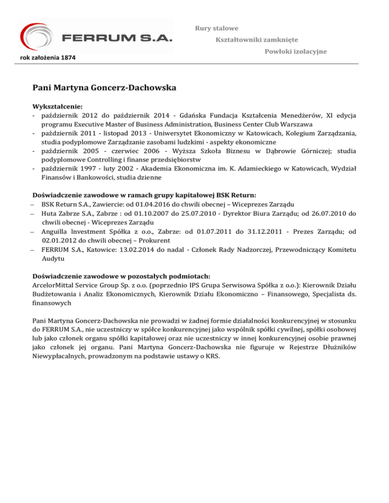 Rury stalowe Kształtowniki zamknięte rok założenia 1874 Powłoki izolacyjne Pani Martyna Goncerz-Dachowska Wykształcenie: - październik 2012 do październik 2014 - Gdańska Fundacja Kształcenia Menedżerów, XI edycja programu Executive Master of Business Administration, Business Center Club Warszawa - październik 2011 - listopad 2013 - Uniwersytet Ekonomiczny w Katowicach, Kolegium Zarządzania, studia podyplomowe Zarządzanie zasobami ludzkimi - aspekty ekonomiczne - październik 2005 - czerwiec 2006 - Wyższa Szkoła Biznesu w Dąbrowie Górniczej; studia podyplomowe Controlling i finanse przedsiębiorstw - październik 1997 - luty 2002 - Akademia Ekonomiczna im. K. Adamieckiego w Katowicach, Wydział Finansów i Bankowości, studia dzienne Doświadczenie zawodowe w ramach grupy kapitałowej BSK Return: BSK Return S.A., Zawiercie: od 01.04.2016 do chwili obecnej – Wiceprezes Zarządu Huta Zabrze S.A., Zabrze : od 01.10.2007 do 25.07.2010 - Dyrektor Biura Zarządu; od 26.07.2010 do chwili obecnej - Wiceprezes Zarządu Anguilla lnvestment Spółka z o.o., Zabrze: od 01.07.2011 do 31.12.2011 - Prezes Zarządu; od 02.01.2012 do chwili obecnej – Prokurent FERRUM S.A., Katowice: 13.02.2014 do nadal - Członek Rady Nadzorczej, Przewodniczący Komitetu Audytu Doświadczenie zawodowe w pozostałych podmiotach: ArcelorMittal Service Group Sp. z o.o. (poprzednio IPS Grupa Serwisowa Spółka z o.o.): Kierownik Działu Budżetowania i Analiz Ekonomicznych, Kierownik Działu Ekonomiczno – Finansowego, Specjalista ds. finansowych Pani Martyna Goncerz-Dachowska nie prowadzi w żadnej formie działalności konkurencyjnej w stosunku do FERRUM S.A., nie uczestniczy w spółce konkurencyjnej jako wspólnik spółki cywilnej, spółki osobowej lub jako członek organu spółki kapitałowej oraz nie uczestniczy w innej konkurencyjnej osobie prawnej jako członek jej organu. Pani Martyna Goncerz-Dachowska nie figuruje w Rejestrze Dłużników Niewypłacalnych, prowadzonym na podstawie ustawy o KRS.