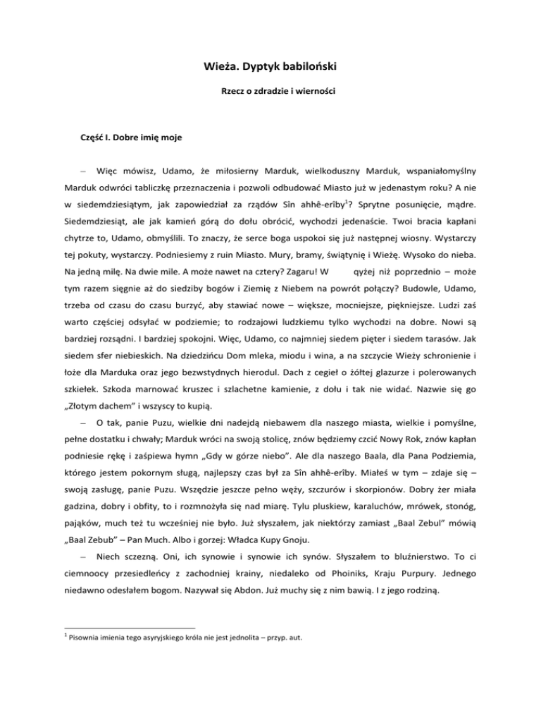 Wieża. Dyptyk babiloński Rzecz o zdradzie i wierności Część I. Dobre imię moje – Więc mówisz, Udamo, że miłosierny Marduk, wielkoduszny Marduk, wspaniałomyślny Marduk odwróci tabliczkę przeznaczenia i pozwoli odbudować Miasto już w jedenastym roku? A nie w siedemdziesiątym, jak zapowiedział za rządów Sîn ahhê-erîby1? Sprytne posunięcie, mądre. Siedemdziesiąt, ale jak kamień górą do dołu obrócić, wychodzi jedenaście. Twoi bracia kapłani chytrze to, Udamo, obmyślili. To znaczy, że serce boga uspokoi się już następnej wiosny. Wystarczy tej pokuty, wystarczy. Podniesiemy z ruin Miasto. Mury, bramy, świątynię i Wieżę. Wysoko do nieba. Na jedną milę. Na dwie mile. A może nawet na cztery? Zagaru! W qyżej niż poprzednio – może tym razem sięgnie aż do siedziby bogów i Ziemię z Niebem na powrót połączy? Budowle, Udamo, trzeba od czasu do czasu burzyć, aby stawiać nowe – większe, mocniejsze, piękniejsze. Ludzi zaś warto częściej odsyłać w podziemie; to rodzajowi ludzkiemu tylko wychodzi na dobre. Nowi są bardziej rozsądni. I bardziej spokojni. Więc, Udamo, co najmniej siedem pięter i siedem tarasów. Jak siedem sfer niebieskich. Na dziedzińcu Dom mleka, miodu i wina, a na szczycie Wieży schronienie i łoże dla Marduka oraz jego bezwstydnych hierodul. Dach z cegieł o żółtej glazurze i polerowanych szkiełek. Szkoda marnować kruszec i szlachetne kamienie, z dołu i tak nie widać. Nazwie się go „Złotym dachem” i wszyscy to kupią. – O tak, panie Puzu, wielkie dni nadejdą niebawem dla naszego miasta, wielkie i pomyślne, pełne dostatku i chwały; Marduk wróci na swoją stolicę, znów będziemy czcić Nowy Rok, znów kapłan podniesie rękę i zaśpiewa hymn „Gdy w górze niebo”. Ale dla naszego Baala, dla Pana Podziemia, którego jestem pokornym sługą, najlepszy czas był za Sîn ahhê-erîby. Miałeś w tym – zdaje się – swoją zasługę, panie Puzu. Wszędzie jeszcze pełno węży, szczurów i skorpionów. Dobry żer miała gadzina, dobry i obfity, to i rozmnożyła się nad miarę. Tylu pluskiew, karaluchów, mrówek, stonóg, pająków, much też tu wcześniej nie było. Już słyszałem, jak niektórzy zamiast „Baal Zebul” mówią „Baal Zebub” – Pan Much. Albo i gorzej: Władca Kupy Gnoju. – Niech sczezną. Oni, ich synowie i synowie ich synów. Słyszałem to bluźnierstwo. To ci ciemnoocy przesiedleńcy z zachodniej krainy, niedaleko od Phoiniks, Kraju Purpury. Jednego niedawno odesłałem bogom. Nazywał się Abdon. Już muchy się z nim bawią. I z jego rodziną. 1 Pisownia imienia tego asyryjskiego króla nie jest jednolita – przyp. aut. – O tak, niech sczezną, ale może z tym robactwem jest coś na rzeczy? Przylatuje tu od paru dni w świątynne ruiny wielka mucha ze srebrnymi skrzydłami. Nisan u progu, wiatr już suchy wieje, to piasek i owady ruszyły po zimie. Siada ta mucha na ołtarzu i patrzy. Siada i patrzy. Nawet nóg nie pociera ni głowy. Zaraz się pewnie pojawi, bo już na południe idzie. Może powinienem oddać jej pokłon? Może to jego służka? Na wszelki wypadek rozsypuję jej okruchy. Tę garść mąki, którą mi przyniosłeś, też tam położę. Powiedziane jest przecież: „Nie jedz chleba przed możnym”. Ale powiedz wreszcie, Puzu, z czym do mnie przychodzisz, co cię sprowadza do aszipu-uzdrowiciela. Twarz u ciebie niezwyczajnie ziemista, bladyś jak ścięty tamaryszek i worki jak stare, zatęchłe daktyle nosisz pod oczami. Smutek i melancholię widzę w twych źrenicach. Czyżbyś był niezdrów, mój Puzu? Czy zgrzeszyłeś, że cię nawiedziła choroba? Czy urok ktoś na ciebie rzucił? Czy dręczą cię edimmu-upiory? Inkuby? Sukkuby? Twoje kłopoty są zmartwieniem Pana naszego. I moim. …jak tu ciemno, Udamo, jakby w mysiej dziurze. I brudno. Ściek spada wprost pod twoje drzwi. Pomyśleć, że stała tu kiedyś dumna Esagila, Świątynia z Wzniosłą Głową. Wlej do kaganka oliwę, przyniosłem ci świeży zapas, zapal nowy knot i wyjmij z torby jedzenie. Pewno jesteś głodny. Masz tam cebulę, ogórka, trochę sera, suszoną rybę z sosem szikkum, kilka ciastek z sezamem i figi. Posil się nieco, długa cię czeka opowieść. Bo prawdę rzekłeś, Udamo. Nie czuję się zdrowy, siły mnie opuszczają. I nie jest to melancholia, Udamo. Krew mam w moczu prawie codziennie, boli mnie, gdy sikam, a w nocy wstaję co chwila. Najgorzej, że nie mogę już, jak dawniej, zaspokoić mojej Shiptu, nierządnicy, którą zeszłej zimy wziąłem w końcu do siebie. Mówią wprawdzie: „Nie poślubiaj kurtyzany, która mężów miała bez liku”, ale na starość ktoś ci przecież musi ogrzać kości. Kiedyś mogłem przez sześć dni i sześć nocy bez ustanku i jeszcze siódmego dnia także, a teraz… szkoda gadać. Próbowałem kataplazmów, masaży leczniczych, nawet tych zabawnych ćwiczeń, i nic. Poszedłem pod Bramę Zaprzestania Skarg, by mój lament ustał, by w bramie cudów moje znaki nabrały znów blasku. Ale krew nadal kapała, nawet jeszcze bardziej. Kazałem sprowadzić młodego chłopca o czarnej skórze i też nie pomogło. Kobietę o czerwonych włosach. To samo. Czyli – to musi być demon. Który mnie okrywa jak szata. Wyjątkowo złośliwy. Ale jeśli Baal, Pan Choroby, zrodził go przed wiekami, ten sam Baal może demona ode mnie zabrać precz. W tym nadzieja, Udamo. Brat mój zapadł kiedyś na żółtą boleść i to był demon Ahhâzu. Z całą pewnością stwierdził tak uczony egzorcysta. Sam widziałem, jak demon uciekał w popłochu z ciała mego brata. Już po jego śmierci, niestety. Zatem, tylko w tobie ratunek, Udamo, aszipuuzdrowicielu. I do ciebie się zwracam, Mucho, wierna służko Baala. Jeśli nie pomożecie, czeka mnie śmierć w okropnych męczarniach i potwory ciało moje pożrą. A może to nie jeden upiór, a Utukku, Siedmiu? Już na samą myśl o nich krew mi się znów puszcza. Bardziej pr