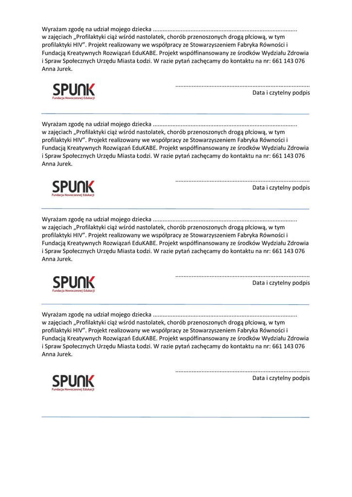Wyrażam zgodę na udział mojego dziecka ........................................................................................ w zajęciach „Profilaktyki ciąż wśród nastolatek, chorób przenoszonych drogą płciową, w tym profilaktyki HIV”. Projekt realizowany we współpracy ze Stowarzyszeniem Fabryka Równości i Fundacją Kreatywnych Rozwiązań EduKABE. Projekt współfinansowany ze środków Wydziału Zdrowia i Spraw Społecznych Urzędu Miasta Łodzi. W razie pytań zachęcamy do kontaktu na nr: 661 143 076 Anna Jurek. .................................................................................. Data i czytelny podpis Wyrażam zgodę na udział mojego dziecka ........................................................................................ w zajęciach „Profilaktyki ciąż wśród nastolatek, chorób przenoszonych drogą płciową, w tym profilaktyki HIV”. Projekt realizowany we współpracy ze Stowarzyszeniem Fabryka Równości i Fundacją Kreatywnych Rozwiązań EduKABE. Projekt współfinansowany ze środków Wydziału Zdrowia i Spraw Społecznych Urzędu Miasta Łodzi. W razie pytań zachęcamy do kontaktu na nr: 661 143 076 Anna Jurek. .................................................................................. Data i czytelny podpis Wyrażam zgodę na udział mojego dziecka ........................................................................................ w zajęciach „Profilaktyki ciąż wśród nastolatek, chorób przenoszonych drogą płciową, w tym profilaktyki HIV”. Projekt realizowany we współpracy ze Stowarzyszeniem Fabryka Równości i Fundacją Kreatywnych Rozwiązań EduKABE. Projekt współfinansowany ze środków Wydziału Zdrowia i Spraw Społecznych Urzędu Miasta Łodzi. W razie pytań zachęcamy do kontaktu na nr: 661 143 076 Anna Jurek. .................................................................................. Data i czytelny podpis Wyrażam zgodę na udział mojego dziecka ........................................................................................ w zajęciach „Profilaktyki ciąż wśród nastolatek, chorób przenoszonych drogą płciową, w tym profilaktyki HIV”. Projekt realizowany we współpracy ze Stowarzyszeniem Fabryka Równości i Fundacją Kreatywnych Rozwiązań EduKABE. Projekt współfinansowany ze środków Wydziału Zdrowia i Spraw Społecznych Urzędu Miasta Łodzi. W razie pytań zachęcamy do kontaktu na nr: 661 143 076 Anna Jurek. .................................................................................. Data i czytelny podpis