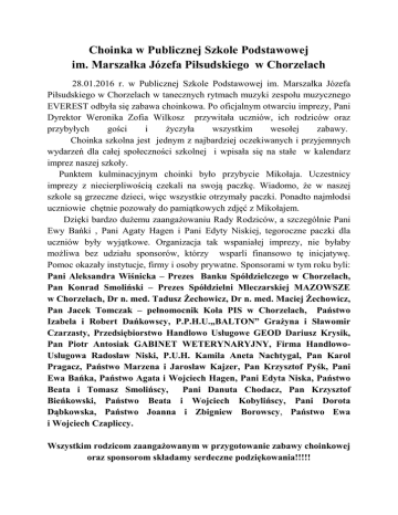 Choinka w Publicznej Szkole Podstawowej im. Marszałka Józefa Piłsudskiego w Chorzelach 28.01.2016 r. w Publicznej Szkole Podstawowej im. Marszałka Józefa Piłsudskiego w Chorzelach w tanecznych rytmach muzyki zespołu muzycznego EVEREST odbyła się zabawa choinkowa. Po oficjalnym otwarciu imprezy, Pani Dyrektor Weronika Zofia Wilkosz przywitała uczniów, ich rodziców oraz przybyłych gości i życzyła wszystkim wesołej zabawy. Choinka szkolna jest jednym z najbardziej oczekiwanych i przyjemnych wydarzeń dla całej społeczności szkolnej i wpisała się na stałe w kalendarz imprez naszej szkoły. Punktem kulminacyjnym choinki było przybycie Mikołaja. Uczestnicy imprezy z niecierpliwością czekali na swoją paczkę. Wiadomo, że w naszej szkole są grzeczne dzieci, więc wszystkie otrzymały paczki. Ponadto najmłodsi uczniowie chętnie pozowały do pamiątkowych zdjęć z Mikołajem. Dzięki bardzo dużemu zaangażowaniu Rady Rodziców, a szczególnie Pani Ewy Bańki , Pani Agaty Hagen i Pani Edyty Niskiej, tegoroczne paczki dla uczniów były wyjątkowe. Organizacja tak wspaniałej imprezy, nie byłaby możliwa bez udziału sponsorów, którzy wsparli finansowo tę inicjatywę. Pomoc okazały instytucje, firmy i osoby prywatne. Sponsorami w tym roku byli: Pani Aleksandra Wiśnicka – Prezes Banku Spółdzielczego w Chorzelach, Pan Konrad Smoliński – Prezes Spółdzielni Mleczarskiej MAZOWSZE w Chorzelach, Dr n. med. Tadusz Żechowicz, Dr n. med. Maciej Żechowicz, Pan Jacek Tomczak – pełnomocnik Koła PIS w Chorzelach, Państwo Izabela i Robert Dańkowscy, P.P.H.U.„BALTON” Grażyna i Sławomir Czarzasty, Przedsiębiorstwo Handlowo Usługowe GEOD Dariusz Krysik, Pan Piotr Antosiak GABINET WETERYNARYJNY, Firma HandlowoUsługowa Radosław Niski, P.U.H. Kamila Aneta Nachtygal, Pan Karol Pragacz, Państwo Marzena i Jarosław Kajzer, Pan Krzysztof Pyśk, Pani Ewa Bańka, Państwo Agata i Wojciech Hagen, Pani Edyta Niska, Państwo Beata i Tomasz Smolińscy, Pani Danuta Chodacz, Pan Krzysztof Bieńkowski, Państwo Beata i Wojciech Kobylińscy, Pani Dorota Dąbkowska, Państwo Joanna i Zbigniew Borowscy, Państwo Ewa i Wojciech Czapliccy. Wszystkim rodzicom zaangażowanym w przygotowanie zabawy choinkowej oraz sponsorom składamy serdeczne podziękowania!!!!!