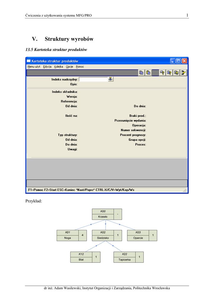 Ćwiczenia z użytkowania systemu MFG/PRO V. Struktury wyrobów 13.5 Kartoteka struktur produktów Przykład: dr inż. Adam Wasilewski, Instytut Organizacji i Zarządzania, Politechnika Wrocławska 1 Ćwiczenia z użytkowania systemu MFG/PRO 2 pole komentarz indeks nadrzędny identyfikator indeksu, który jest wytwarzany z komponentów Strukturę wprowadza się dla każdego poziomu osobno (np. rozpoczynając od produktu końcowego). pole indeks składnika referencja od dnia komentarz identyfikator składnika wybranego indeksu nadrzędnego opis składnika (pole do dowolnego wykorzystania) data, od której składnik wchodzi w skład indeksu nadrzędnego; pole może zostać puste (niewypełnione) dr inż. Adam Wasilewski, Instytut Organizacji i Zarządzania, Politechnika Wrocławska Ćwiczenia z użytkowania systemu MFG/PRO pole ilość na typ struktury od dnia do dnia uwagi braki produkcyjne przesunięcie wydania 3 komentarz ilość jednostek składnika wchodząca w skład jednostki indeksu nadrzędnego kod określający jak składnik jest używany w strukturze (np. A – składnik alternatywny, P – składnik planistyczny, O – składnik opcjonalny itd.); pole może zostać puste (niewypełnione) data, od której składnik wchodzi w skład indeksu nadrzędnego; pole może zostać puste (niewypełnione) data, do której składnik wchodzi w skład indeksu nadrzędnego; pole może zostać puste (niewypełnione) opis(pole do dowolnego wykorzystania) określenie ile procent składnika jest tracone podczas produkcji liczba dni od rozpoczęcia produkcji indeksu nadrzędnego do czasu, w którym składnik będzie wykorzystany w produkcji numer identyfikujący operację w procesie produkcyjnym odnoszącą się operacja do składnika numer sekwencji numer opcjonalnego procesu produkcyjnego procentowe określenie prognozy dla komponentu (może być procent prognozy wykorzystywane przez MRP) grupa opcji opcjonalny kod grupowania komponentów w strukturze dr inż. Adam Wasilewski, Instytut Organizacji i Zarządzania, Politechnika Wrocławska Ćwiczenia z użytkowania systemu MFG/PRO proces 4 opcjonalny kod grupowania komponentów w strukturze według procesów Analogicznie wprowadza się składniki dla pozostałych poziomów struktury wyrobu. Zadanie: 1. Wprowadzić własną strukturę produktu w oparciu o wprowadzone indeksy. 2. Wykonać przegląd i raport sprawdzając, czy nowe dane zostały zapamiętane w systemie. 13.12.13 Zwijanie kosztów struktury produktów „Zwinięcie” kosztów jest niezbędne do wyliczenia kosztów niższego poziomu dla produkowanych indeksów (por. ekran „Dane kosztowe indeksu” 1.4.9, koszty niższego poziomu). dr inż. Adam Wasilewski, Instytut Organizacji i Zarządzania, Politechnika Wrocławska Ćwiczenia z użytkowania systemu MFG/PRO 5 Zadanie: 1. „Zwinąć” (przeliczyć) koszty dla wprowadzonej struktury, podając zakład, odpowiedni zestaw kosztów (standard/current) i numer indeksu nadrzędnego. 13.12.5 Zbiorczy koszt struktury produktu dr inż. Adam Wasilewski, Instytut Organizacji i Zarządzania, Politechnika Wrocławska Ćwiczenia z użytkowania systemu MFG/PRO 6 Zadanie: 1. Wygenerować raport kosztów niższego poziomu, podając numer indeksu nadrzędnego, zakład i zestaw kosztów (standard/current). 2. Sprawdzić, czy w kartotece indeksów zostały naliczone koszty niższego poziomu. VI. Kontrahenci 2.1.1. Kartoteka klientów dr inż. Adam Wasilewski, Instytut Organizacji i Zarządzania, Politechnika Wrocławska Ćwiczenia z użytkowania systemu MFG/PRO pole sort nazwa agent 1 wiele wysyłka przez konto RO odsprzedaż uwagi typ region waluta zakład język 7 komentarz skrócona nazwa klienta, którą można wykorzystywać do szybkiego wyszukiwania przedstawiciel (agent), który utrzymuje kontakt z klientem czy jest wielu przedstawicieli (agentów) – jeśli tak, wówczas pojawi się dodatkowy ekran umożliwiający wpisanie następnych przedstawicieli identyfikator domyślnego przewoźnika obsługującego danego klienta domyślne konto księgowe RO (rozrachunków z odbiorcami) pole do dowolnego wykorzystania w warunkach polskich uwagi na temat klienta opcjonalny kod typu klienta (definiowany w 36.2.13 jako pole Cm_type) opcjonalny kod identyfikujący region, z którego pochodzi klient (definiowany w 36.2.13 jako pole Cm_region) waluta rozliczeń z klientem zakład, z którego zazwyczaj obsługuje się klienta język używany przez klienta dr inż. Adam Wasilewski, Instytut Organizacji i Zarządzania, Politechnika Wrocławska Ćwiczenia z użytkowania systemu MFG/PRO pole tabela cen tabela rabatów cena stała klasa ST SIC w etapach faktura według autoryzacji rejestr VAT kod operacji 8 komentarz domyślna tabela cen dla klienta (-> 1.10.1.1, 1.10.2.1) domyślna tabela rabatów dla klienta (-> 1.10.13) czy ceny dla tego klienta są stałe, czy mogą być dodatkowo modyfikowane przy wprowadzeniu zleceń sprzedaży (Tak/Nie) klasa klienta, określająca kolejność obsługi (definiowana w 36.2.13 jako pole Cm_class) Kod SIC (standard industrial classification) klienta, można wykorzystać np. na wpisanie kodów działalności klienta wg. EKD/PKD czy zamówienia klienta można realizować w etapach (Tak/Nie) czy faktury dla klienta wymagają autoryzacji (Tak/Nie) rejestr VAT sprzedaży (-> 2.13.1.9) kod operacji w rejestrze VAT dr inż. Adam Wasilewski, Instytut Organizacji i Zarządzania, Politechnika Wrocławska Ćwiczenia z użytkowania systemu MFG/PRO pole podatek strefa podatkowa klasa podatkowa użycie podatku VAT w cenie ID podatku federalnego NIP Regon Kod organu celnego ID VAT różne 3 w mieście bank metoda płatności 9 komentarz określenie, czy firma podlega opodatkowaniu (wartość: Tak), czy też nie (wartość: Nie) oznaczenie strefy podatkowej (dla Polski – PL) oznaczenie klasy podatkowej (-> 2.13.13.1, powiązane z 2.13.1.1, 2.13.1.5) oznaczenie rejestru VAT w kontaktach z firmą (-> 2.13.1.9) określenie, czy w kontaktach z firm