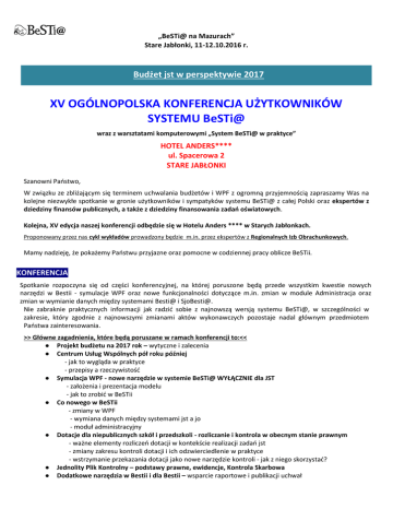 „BeSTi@ na Mazurach” Stare Jabłonki, 11-12.10.2016 r. Budżet jst w perspektywie 2017 XV OGÓLNOPOLSKA KONFERENCJA UŻYTKOWNIKÓW SYSTEMU BeSTi@ wraz z warsztatami komputerowymi „System BeSTi@ w praktyce” HOTEL ANDERS**** ul. Spacerowa 2 STARE JABŁONKI Szanowni Państwo, W związku ze zbliżającym się terminem uchwalania budżetów i WPF z ogromną przyjemnością zapraszamy Was na kolejne niezwykłe spotkanie w gronie użytkowników i sympatyków systemu BeSTi@ z całej Polski oraz ekspertów z dziedziny finansów publicznych, a także z dziedziny finansowania zadań oświatowych. Kolejna, XV edycja naszej konferencji odbędzie się w Hotelu Anders **** w Starych Jabłonkach. Proponowany przez nas cykl wykładów prowadzony będzie m.in. przez ekspertów z Regionalnych Izb Obrachunkowych. Mamy nadzieję, że pokażemy Państwu przyjazne oraz pomocne w codziennej pracy oblicze BeSTii. KONFERENCJA Spotkanie rozpoczyna się od części konferencyjnej, na której poruszone będą przede wszystkim kwestie nowych narzędzi w Bestii - symulacje WPF oraz nowe funkcjonalności dotyczące m.in. zmian w module Administracja oraz zmian w wymianie danych między systemami Besti@ i SjoBesti@. Nie zabraknie praktycznych informacji jak radzić sobie z najnowszą wersją systemu BeSTi@, w szczególności w zakresie, który zgodnie z najnowszymi zmianami aktów wykonawczych pozostaje nadal głównym przedmiotem Państwa zainteresowania. >> Główne zagadnienia, które będą poruszane w ramach konferencji to:<< ● Projekt budżetu na 2017 rok – wytyczne i zalecenia ● Centrum Usług Wspólnych pół roku później - jak to wygląda w praktyce - przepisy a rzeczywistość ● Symulacja WPF - nowe narzędzie w systemie BeSTi@ WYŁĄCZNIE dla JST - założenia i prezentacja modelu - jak to zrobić w BeSTii ● Co nowego w BeSTii - zmiany w WPF - wymiana danych między systemami jst a jo - moduł administracyjny ● Dotacje dla niepublicznych szkół i przedszkoli - rozliczanie i kontrola w obecnym stanie prawnym - ważne elementy rozliczeń dotacji w kontekście realizacji zadań jst - zmiany zakresu kontroli dotacji i ich odzwierciedlenie w praktyce - wstrzymanie przekazania dotacji jako nowe narzędzie kontroli - jak z niego skorzystać? ● Jednolity Plik Kontrolny – podstawy prawne, ewidencje, Kontrola Skarbowa ● Dodatkowe narzędzia w Bestii i dla Bestii – wsparcie raportowe i publikacji uchwał „BeSTi@ na Mazurach” Stare Jabłonki, 11-12.10.2016 r. ● ● ● ● ● Sposoby finansowania przedsięwzięć samorządowych poza dotacja unijną – jak nie wpaść w pułapkę zadłużania Badanie satysfakcji klienta i konsultacje społeczne - po co badać satysfakcję? jakie korzyści płyną z tego badania? - po co konsultować? jakie przepisy prawa wymuszają konsultacje? Bezpieczeństwo i zagrożenia informatyczne System Informacji Przestrzennej - mapa jako narzędzie analizy, wsparcia i zarządzania danymi w Jednostce Samorządu Terytorialnego Bezpieczeństwo w obszarach zabudowanych – komunikaty, systemy ostrzegania i oświetlania Gościem specjalnym XV konferencji będzie Pan Adam Głębski członek zespołu merytorycznego Ministerstwa Finansów. DODATKOWO W RAMACH KONFERENCJI – JAKO WYDARZENIA TOWARZYSZĄCE - PRZEWIDUJEMY: ● ● ● ● UROCZYSTĄ KOLACJĘ - chcąc umożliwić integrację uczestników konferencji oraz sposobność indywidualnej wymiany poglądów i doświadczeń przygotowaliśmy dla Państwa uroczystą kolację pierwszego dnia spotkania. Ponadto do Państwa dyspozycji przez cały wieczór zapewniamy: profesjonalnego DJ oraz najlepszych barmanów serwujących kolorowe napoje, którzy umilą Państwu wieczór niesamowitymi pokazami. ATRAKCJE HOTELOWE - 16-metrowy basen z atrakcjami, sauna sucha, łaźnia parowa, kompleks SPA, kręgielnia, sqash, bilard. PANELE DYSKUSYJNE - oprócz cyklu wykładów poświęconych zagadnieniom merytorycznym, przeznaczonych głównie dla skarbników i głównych księgowych, przewidujemy także osobny panel dyskusyjny dla osób bezpośrednio pracujących w systemie BeSTi@ w tym także dla informatyków administrujących systemem, podczas którego omawiane będą zagadnienia techniczne, znajdujące się zwykle poza obszarami zainteresowania kadry kierowniczej. Ponadto użytkownicy systemu będą mogli swobodnie wymienić się spostrzeżeniami i poglądami na temat systemu z przedstawicielami Wykonawcy i Zespołu Testowego. PORADY EKSPERCKIE, w ramach których będą Państwo mogli uzyskać odpowiedź na konkretne nurtujące Państwa pytania dotyczące systemu BeSTi@. ▪ ▪ Próbujesz zrobić własny raport, ale coś nie działa? Masz problemy z wysyłką w BeSTii? ⇨ skonsultuj to z ekspertem na konferencji! Osoby zainteresowane rozwiązaniem konkretnych problemów z systemem BeSTi@ proszone są o przywiezienie ze sobą na konferencję kopii własnej bazy danych. WARSZTATY KOMPUTEROWE PO ZAKOŃCZENIU KONFERENCJI (DODATKOWO PŁATNE). W tej edycji mamy dla Państwa promocję: cena warsztatów: 450 zł 370 zł Warsztaty dadzą Państwu możliwość praktycznej nauki obsługi programu BeSTi@ oraz przećwiczenia zdobytej w czasie konferencji wiedzy w zakresie następujących modułów systemu BeSTi@: „Uchwały z WPF”, „Sprawozdania”, „Raporty”. Warsztaty odbędą się również z systemu „Legislator” i „SJO BeSTi@”. Warsztaty odbywają się równolegle, można więc wybrać tylko jeden rodzaj. Zajęcia odbywają się w grupach do max. 16 osób pod okiem doświadczonych trenerów. RAMOWY HARMONOGRAM KONFERENCJI I WARSZTATÓW 11 października 09:30-10:30 Rejestracja uczestników 10:30-18:30 Panel merytoryczny konferencji 17:00-18:00 19:30 Panele dyskusyjne i porady eksperckie Kolacja 12 października Panel merytoryczny 10:30-15:00 konferencji 15:00-16:00 Samodzielne ćwiczenia na sali komputerowej 16:00-18:30 Pierwsza część warsztatów 19:00 Kolacja 13 października Druga część 10:00 - 13:00 warsztat