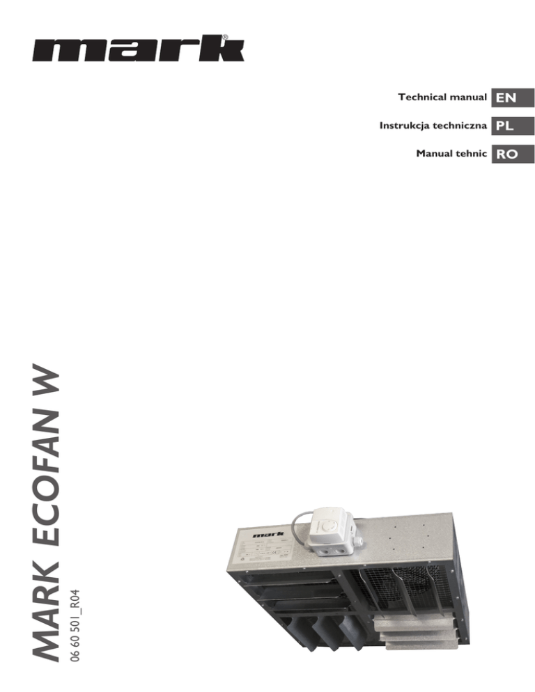 Technical manual EN Instrukcja techniczna PL 06 60 501_R04 MARK ECOFAN W Manual tehnic RO 2 Read this document before installing the appliance Warning EN Incorrect installation, adjustment, alteration, repair or maintenance work may lead to material damage or injury. All work must be carried out by certified, qualified professionals. If the appliance is not positioned in accordance with the instructions, the warranty shall be rendered void. This appliance is not intended for use by children or persons with a physical, sensory or mental handicap, or who lack the required experience or expertise, unless they are supervised or have been instructed in the use of the appliance by somebody who is responsible for their safety. Children must be supervised to ensure that they do not play with the appliance. If the manual refers to an image or table, a number will be shown between square brackets, for example [3].The number refers to images and tables at the back of the manual with the stated number. 1.0General 1.1 All rights reserved The manufacturer has a policy of continuous product improvement and reserves the right to make changes to the specifications without prior notice. The technical details are considered correct but do not form the basis for a contract or warranty. All orders are accepted subject to the standard terms and conditions of sale and delivery (which will be sent to you at your request). 1.2 General warnings Installation must comply with the relevant local and/or national regulations. You must therefore have the Ecofan installed by a professionally qualified installer in accordance with all applicable national and international regulations. Faulty installation, adjustment, alteration, maintenance activity or repair shall render the warranty void. 2.0 Technical information You can find the following information on page 7 to 11. [1] [2] [3] [4] [5] Application Technical information Electrical diagram Ecofan W42-W82 Electrical diagram Ecofan W142* Electrical components * Do not use a 5-step transformer based controller. 3 Proszę przeczytać niniejszy dokument przed instalacją urządzenia Ostrzeżenie Nieprawidłowy montaż, regulacja, modyfikacje, naprawa lub konserwacja mogą prowadzić do strat materialnych, obrażeń ciała lub wybuchu. Wszystkie czynności muszą być wykonywane przez upoważnionych, kwalifikowanych specjalistów. Gwarancja traci ważność w przypadku, gdy urządzenie nie zostanie zainstalowane zgodnie ze wskazówkami. Niniejsze urządzenie nie jest przeznaczone do użytku przez dzieci lub osoby o obniżonych możliwościach fizycznych, sensorycznych czy umysłowych ani też osoby nieposiadające odpowiedniego doświadczenia czy wiedzy, chyba że osoby takie pozostają pod nadzorem lub zostały przeszkolone w zakresie użytkowania urządzenia przez osobę odpowiedzialną za ich bezpieczeństwo. Należy dopilnować, aby dzieci nie używały tego urządzenia do zabawy. PL Jeżeli niniejsza instrukcja techniczna odnosi się do ilustracji czy tabeli, w nawiasach kwadratowych będzie to oznaczone w postaci numeru, na przykład [3]. Numer odnosi się do ilustracji i tabel na końcu podręcznika, które mają ustaloną numerację. 1.0 Opis ogólny 1.1 Zastrzeżone prawo do modyfikacji Producent zobowiązany jest stale ulepszać swoje produkty i zastrzega sobie prawo do dokonywania zmian w specyfikacji urządzeń bez wcześniejszego powiadomienia. Szczegóły techniczne są uważane za poprawne, ale nie stanowią podłoża dla umowy czy gwarancji. Wszystkie zamówienia są akceptowane według standardowych warunków sprzedaży i dostaw (dostępne na życzenie). 1.2 Ostrzeżenia ogólne Instalacja musi być zgodna z odpowiednimi przepisami lokalnymi i/lub krajowymi. Oznacza to, że instalacja urządzenia Ecofan może być przeprowadzana tylko przez odpowiednio kwalifikowanego instalatora z zachowaniem zgodności ze wszelkimi krajowymi I międzynarodowymi przepisami mającymi zastosowanie. Nieprawidłowy montaż, regulacja, modyfikacje, naprawa lub konserwacja będą prowadzić do unieważnienia gwarancji. 2.0 Informacje techniczne Informacje dotyczące poniższych zagadnień znaleźć można na stronach od 7 do 11. [1] [2] [3] [4] [5] Zastosowanie Dane techniczne Schemat elektryczny Ecofan W42-W82 Schemat elektryczny Ecofan W142* Komponenty zasilane elektrycznie * Nie należy używać 5-stopniowego regulatora prędkości obrotu. 4 Cititi acest document inainte de instalarea aparatului Avertizare Instalarea incorecta, reglarea, deteriorarea, activitatiile de intretinere sau reparatie pot duce la daune materiale sau raniri. Toate lucrarile trebuie sa fie efectuate de catre profesionisti calificati si certificati. Daca aparatul nu este pozitionat in conformitate cu instructiunile, garantia va fi considerata nula. Acest aparat nu este destinat utilizarii de catre copii sau persoane cu un handicap fizic, senzorial sau mental, sau care nu dispun de experienta sau expertiza necesara, cu exceptia cazului in care acestea sunt supravegheate sau au fost instruite in utilizarea aparatului de catre cineva care este responsabil pentru siguranta lor. Copiii trebuie sa fie supravegheati pentru a se asigura ca nu se joaca cu aparatul. RO In cazul in care manualul se refera la o imagine sau un tabel, un numar va fi afisat intre paranteze drepte, de exemplu [3]. Numarul se refera la imagini si tabele la partea din spate a manualului cu numarul indicat. 1.0General 1.1 Toate drepturile rezervate Producatorul are o politica de imbunatatire continua a produselor si isi rezerva dreptul de a face modificari ale specificatiilor, fara notificare prealabila. Detaliile tehnice sunt considerate corecte, dar nu formeaza baza unui contract sau garantie. Toate comenzile sunt acceptate in conformitate cu termenii si conditiile de vanzare si de livrare (care va fi trimis, la cerere) standard. 1.2 Avertismente generale Instalarea trebuie sa respecte reglementarile locale si / sau nationale relevante.
