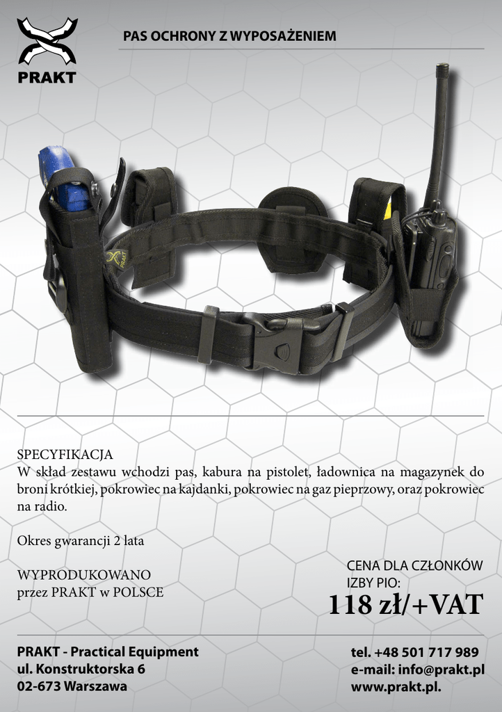PAS OCHRONY Z WYPOSAŻENIEM SPECYFIKACJA W skład zestawu wchodzi pas, kabura na pistolet, ładownica na magazynek do broni krótkiej, pokrowiec na kajdanki, pokrowiec na gaz pieprzowy, oraz pokrowiec na radio. Okres gwarancji 2 lata WYPRODUKOWANO przez PRAKT w POLSCE PRAKT - Practical Equipment ul. Konstruktorska 6 02-673 Warszawa CENA DLA CZŁONKÓW IZBY PIO: 118 zł/+VAT tel. +48 501 717 989 e-mail: [email protected] www.prakt.pl.