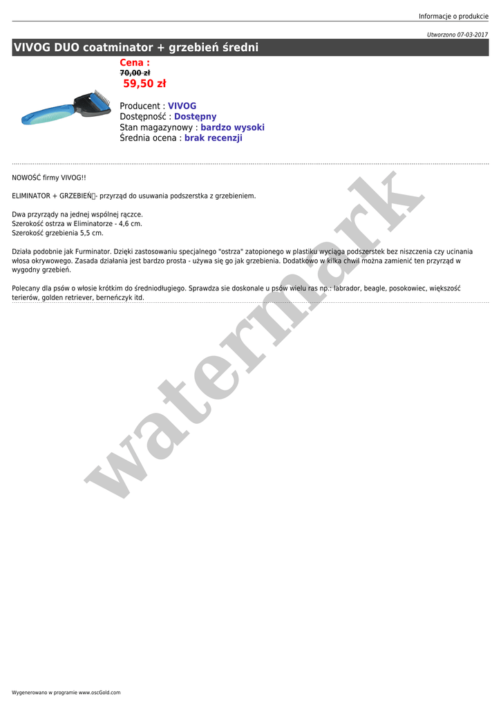 Informacje o produkcie Utworzono 07-03-2017 VIVOG DUO coatminator + grzebień średni Cena : 70,00 zł 59,50 zł Producent : VIVOG Dostępność : Dostępny Stan magazynowy : bardzo wysoki Średnia ocena : brak recenzji NOWOŚĆ firmy VIVOG!! er m ar k ELIMINATOR + GRZEBIEŃ- przyrząd do usuwania podszerstka z grzebieniem. Dwa przyrządy na jednej wspólnej rączce. Szerokość ostrza w Eliminatorze - 4,6 cm. Szerokość grzebienia 5,5 cm. Działa podobnie jak Furminator. Dzięki zastosowaniu specjalnego "ostrza" zatopionego w plastiku wyciąga podszerstek bez niszczenia czy ucinania włosa okrywowego. Zasada działania jest bardzo prosta - używa się go jak grzebienia. Dodatkowo w kilka chwil można zamienić ten przyrząd w wygodny grzebień. w at Polecany dla psów o włosie krótkim do średniodługiego. Sprawdza sie doskonale u psów wielu ras np.: labrador, beagle, posokowiec, większość terierów, golden retriever, berneńczyk itd. Wygenerowano w programie www.oscGold.com