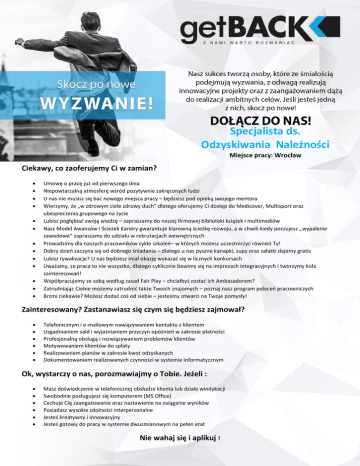 Specjalista ds. Odzyskiwania Należności Miejsce pracy: Wrocław Ciekawy, co zaoferujemy Ci w zamian? Umowę o pracę już od pierwszego dnia Niepowtarzalną atmosferę wśród pozytywnie zakręconych ludzi U nas nie musisz się bać nowego miejsca pracy – będziesz pod opieką swojego mentora Wierzymy, że „w zdrowym ciele zdrowy duch” dlatego oferujemy Ci dostęp do Medicover, Multisport oraz ubezpieczenia grupowego na życie Lubisz pogłębiać swoją wiedzę – zapraszamy do naszej firmowej biblioteki książek i multimediów Nasz Model Awansów i Ścieżek Kariery gwarantuje klarowną ścieżkę rozwoju, a w chwili kiedy poczujesz ,,wypalenie zawodowe” zapraszamy do udziału w rekrutacjach wewnętrznych Prowadzimy dla naszych pracowników cykle szkoleń– w których możesz uczestniczyć również Ty! Dobry dzień zaczyna się od dobrego śniadania – dlatego u nas pyszne kanapki, zupy oraz sałatki dajemy gratis Lubisz rywalizacje? U nas będziesz miał okazję wykazać się w licznych konkursach Uważamy, ze praca to nie wszystko, dlatego cyklicznie bawimy się na imprezach integracyjnych i tworzymy koła zainteresowań! Współpracujemy ze sobą według zasad Fair Play – chciałbyś zostać ich Ambasadorem? Zatrudniając Ciebie możemy zatrudnić także Twoich znajomych – poznaj nasz program poleceń pracowniczych Brzmi ciekawie? Możesz dodać coś od siebie – jesteśmy otwarci na Twoje pomysły! Zainteresowany? Zastanawiasz się czym się będziesz zajmował? Telefonicznym i e-mailowym nawiązywaniem kontaktu z klientem Uzgadnianiem sald i wyjaśnianiem przyczyn opóźnień w zakresie płatności Profesjonalną obsługą i rozwiązywaniem problemów klientów Motywowaniem klientów do spłaty Realizowaniem planów w zakresie kwot odzyskanych Dokumentowaniem realizowanych czynności w systemie informatycznym Ok, wystarczy o nas, porozmawiajmy o Tobie. Jeżeli : Masz doświadczenie w telefonicznej obsłudze klienta lub dziale windykacji Swobodnie posługujesz się komputerem (MS Office) Cechuje Cię zaangażowanie oraz nastawienie na osiąganie wyników Posiadasz wysokie zdolności interpersonalne Jesteś kreatywny i innowacyjny Jesteś gotowy do pracy w systemie dwuzmianowym na pełen etat Nie wahaj się i aplikuj ! Wyślij swoje CV na adres: [email protected] *Informujemy, że skontaktujemy się z wybranymi kandydatami. Prosimy o dopisanie klauzuli: "Oświadczam, że wyrażam zgodę na przetwarzanie danych osobowych zawartych w przedstawionych przeze mnie dokumentach w mojej ofercie pracy dla potrzeb niezbędnych do realizacji procedury aktualnych i przyszłych procesów rekrutacji GetBack S.A. oraz Kancelarii Prawnej GetBack Mariusz Brysik Sp.k. zgodnie z Ustawą z dnia 29.08.1997 r. O Ochronie Danych Osobowych, (tj. Dz. U. 2014 poz. 1182)". Informujemy, że Spółka GetBack S. A. z siedzibą we Wrocławiu, ul. Powstańców Śląskich 2-4, 53 – 333 Wrocław, KRS 0000413997, NIP 8992733884, REGON 021829989 jest administratorem dotyczących Pana/Pani danych osobowych. Celem przetwarzania danych jest realizacja procesów związanych z rekrutacją i są one przetwarzane w zakresie niezbędnym do realizacji tego celu. Jednocześnie informujemy, że Spółka jako administrator danych prowadzi rekrutację również na rzecz Kancelaria Prawna GetBack Mariusz Brysik Sp. k. z siedzibą we Wrocławiu, ul. Powstańców Śląskich 2-4, 53 – 333 Wrocław, KRS 0000510748, NIP 8992743799, REGON 022136722, Kandydatowi przysługują uprawnienia wynikające z art. 32-35 Ustawy z dnia 29 sierpnia 1997 r. o ochronie danych osobowych (t.j. Dz.U. z 2014 r., poz. 1182) w szczególności prawo dostępu do treści swoich danych oraz ich poprawiania.