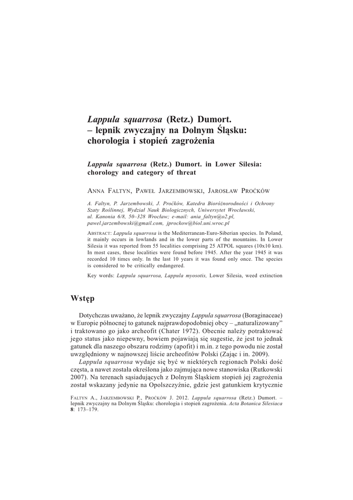 173 Lappula-squarrosa-(Retz.)-Dumort.--lepnik-zwyczajny-na-Dolnym-l¹sku 173 Lappula squarrosa (Retz.) Dumort. lepnik zwyczajny na Dolnym l¹sku: chorologia i stopieñ zagro¿enia Lappula squarrosa (Retz.) Dumort. in Lower Silesia: chorology and category of threat ANNA FALTYN, PAWE£ JARZEMBOWSKI, JAROS£AW PROÆKÓW A. Faltyn, P. Jarzembowski, J. Proæków, Katedra Bioró¿norodnoci i Ochrony Szaty Rolinnej, Wydzia³ Nauk Biologicznych, Uniwersytet Wroc³awski, ul. Kanonia 6/8, 50328 Wroc³aw; e-mail: [email protected], [email protected], [email protected] ABSTRACT: Lappula squarrosa is the Mediterranean-Euro-Siberian species. In Poland, it mainly occurs in lowlands and in the lower parts of the mountains. In Lower Silesia it was reported from 55 localities comprising 25 ATPOL squares (10x10 km). In most cases, these localities were found before 1945. After the year 1945 it was recorded 10 times only. In the last 10 years it was found only once. The species is considered to be critically endangered. Key words: Lappula squarrosa, Lappula myosotis, Lower Silesia, weed extinction Wstêp Dotychczas uwa¿ano, ¿e lepnik zwyczajny Lappula squarrosa (Boraginaceae) w Europie pó³nocnej to gatunek najprawdopodobniej obcy naturalizowany i traktowano go jako archeofit (Chater 1972). Obecnie nale¿y potraktowaæ jego status jako niepewny, bowiem pojawiaj¹ siê sugestie, ¿e jest to jednak gatunek dla naszego obszaru rodzimy (apofit) i m.in. z tego powodu nie zosta³ uwzglêdniony w najnowszej licie archeofitów Polski (Zaj¹c i in. 2009). Lappula squarrosa wydaje siê byæ w niektórych regionach Polski doæ czêsta, a nawet zosta³a okrelona jako zajmuj¹ca nowe stanowiska (Rutkowski 2007). Na terenach s¹siaduj¹cych z Dolnym l¹skiem stopieñ jej zagro¿enia zosta³ wskazany jedynie na Opolszczynie, gdzie jest gatunkiem krytycznie FALTYN A., J ARZEMBOWSKI P., P ROÆKÓW J. 2012. Lappula squarrosa (Retz.) Dumort. lepnik zwyczajny na Dolnym l¹sku: chorologia i stopieñ zagro¿enia. Acta Botanica Silesiaca 8: 173179. 174 Anna-Faltyn,-Pawe³-Jarzembowski,-Jaros³aw-Proæków 174 zagro¿onym CR (Nowak i in. 2008). W Wielkopolsce nie by³a dotychczas ujmowana na licie rolin zagro¿onych (Jackowiak i in. 2007). Na obszarze Dolnego l¹ska posiada³a kategoriê DD (K¹cki i in. 2003), poniewa¿ dotychczasowe dane by³y niewystarczaj¹ce do oceny stopnia jej zagro¿enia. Niniejsza praca ma na celu przedstawienie stanowisk gatunku na Dolnym l¹sku oraz ocenê jego stopnia zagro¿enia. 1. Charakterystyka gatunku Synonimy: Echinospermum lappula (L.) Sm., Echinospermum squarrosum Rchb., Lappula echinata Gilib., Lappula myosotis Moench, Myosotis squarrosa Retz. (BfN FloraWeb DB 2003). Uwagi taksonomiczne: wyró¿niono dwa podgatunki: subsp. squarrosa, charakteryzuj¹cy siê wolnymi, osadzonymi na zgrubia³ym brzegu roz³upek kolcami wewnêtrznego rzêdu o d³ugoci 11,5 mm oraz subsp. heteracantha (Ledeb.) Chater, posiadaj¹cy kolce wewnêtrznego rzêdu przynajmniej po czêci zroniête nasadami, o d³ugoci 1,52,5 mm (Rutkowski 2007; Chater 1972). Wszystkie zrewidowane okazy z Dolnego l¹ska nale¿¹ do podgatunku typowego (mimo ró¿nych wczeniejszych oznaczeñ). Podobne gatunki: Lappula deflexa (Wahlenb.) Garcke to gatunek zawlekany, o szypu³kach w czasie owocowania odgiêtych, 315 mm d³ugich; kolce na owocu w jednym rzêdzie, w dole zroniête w b³oniaste skrzyde³ko, kielich krótszy od owocu. Lappula marginata (Bieb.) Gürke, dawniej bardzo rzadko zawlekany. Kolce na owocu w 1 rzêdzie, wolne, niezroniête nasadami, kielich w czasie owocowania 34 mm d³ugoci, w czasie kwitnienia 23 mm, szypu³ki do 1,5 mm d³ugoci (Rutkowski 2007). Siedlisko: Suche i kamienne zbocza, suche murawy, przydro¿a, ugory, miejsca ruderalne (Pancer-Kotejowa 1963; Chater 1972). Rozmieszczenie geograficzne: Gatunek ródziemnomorsko-euro-syberyjski (Pancer-Kotejowa 1963). W Europie wystêpuje na wiêkszoci obszarów poza najdalej wysuniêtymi terenami na pó³noc oraz na zachód (Chater 1972). W Polsce lepnik zwyczajny generalnie wystêpuje na ca³ym ni¿u, a w górach tylko w ni¿szych po³o¿eniach (Pancer-Kotejowa 1963). 2. Materia³ i metody Przeprowadzono szczegó³ow¹ analizê literatury oraz wykonano rewizjê taksonomiczn¹ dostêpnych materia³ów zielnikowych, które zosta³y wypo¿yczone z herbariów KTU, KRAM i WRSL. Szczegó³owe lokalizacje (w podrozdziale pt. Wystêpowanie w regionie) uzupe³niono o numery kwadratów ATPOL 10x10 km (Zaj¹c, Zaj¹c 2001), które zosta³y podane w nawiasie kwadratowym. 175 Lappula-squarrosa-(Retz.)-Dumort.--lepnik-zwyczajny-na-Dolnym-l¹sku 175 Status zagro¿enia lepnika zwyczajnego na Dolnym l¹sku okrelono przy u¿yciu metodyki opisanej w pracy K¹ckiego i in. (2009). 3. Wystêpowanie na Dolnym l¹sku Na Dolnym l¹sku lepnik zwyczajny wystêpowa³ przede wszystkim na przychaciach (w tym na murach miejskich i przy m³ynach), przydro¿ach, gruzowiskach, towarowych dworcach kolejowych, na mostach i wa³ach oraz wyj¹tkowo w kamienio³omie, niejednokrotnie efemerycznie (Schube 1903; Schalow 1931, 1932; Meyer 1931, 1933; KTU). Jako chwast polny najprawdopodobniej nie by³ zbyt czêsty. Podawany by³ z 55 lokalizacji w 25 kwadratach ATPOL (ryc. 1). G³ówny obszar wystêpowania to Nizina l¹ska (23 stanowiska), a przede wszystkim okolice Wroc³awia: Wroc³aw (na wa³ach) [BE49]; przed dworcem Wroc³aw Nadodrze [BE49]; most na Odrze, ul. B. Krzywoustego (= Most Warszawski) [BE49]; Wroc³aw ródmiecie (Brücke am Ohlauer Stadtgraben) [BE49]; Wroc³aw Tarnogaj [BE59] (Schube 1903); Wroc³aw Miko³ajów, na gruzie [BE48] (Schube 1903, 1930); Wroc³aw na dworcu towarowym wschodnim (obecnie nieistniej¹cym znajdowa³ siê w rejonie ulic Pu³askiego, Pr¹dzyñskiego i wistackiego), ze zbo¿em [BE49] (Meyer 1931; Schalow 1931); Wroc³aw G¹dów dworzec towarowy zachodni [BE48] (Schalow 1932; Meyer 1933); Wroc³aw Borek (Am Schachtloch bei der Kürassier-Kaserne, Kleinburg Breslau Schube 1903; R