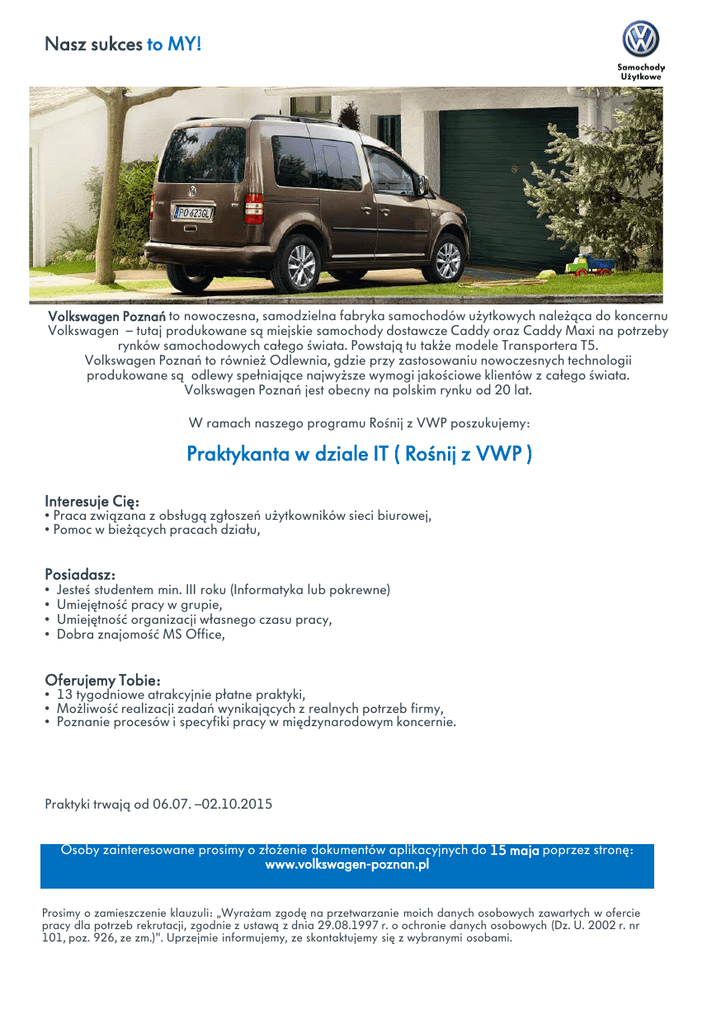 Nasz sukces to MY! Volkswagen Poznań to nowoczesna, samodzielna fabryka samochodów użytkowych należąca do koncernu Volkswagen – tutaj produkowane są miejskie samochody dostawcze Caddy oraz Caddy Maxi na potrzeby rynków samochodowych całego świata. Powstają tu także modele Transportera T5. Volkswagen Poznań to również Odlewnia, gdzie przy zastosowaniu nowoczesnych technologii produkowane są odlewy spełniające najwyższe wymogi jakościowe klientów z całego świata. Volkswagen Poznań jest obecny na polskim rynku od 20 lat. W ramach naszego programu Rośnij z VWP poszukujemy: Praktykanta w dziale IT ( Rośnij z VWP ) Interesuje Cię: • Praca związana z obsługą zgłoszeń użytkowników sieci biurowej, • Pomoc w bieżących pracach działu, Posiadasz: • • • • Jesteś studentem min. III roku (Informatyka lub pokrewne) Umiejętność pracy w grupie, Umiejętność organizacji własnego czasu pracy, Dobra znajomość MS Office, Oferujemy Tobie: • 13 tygodniowe atrakcyjnie płatne praktyki, • Możliwość realizacji zadań wynikających z realnych potrzeb firmy, • Poznanie procesów i specyfiki pracy w międzynarodowym koncernie. Praktyki trwają od 06.07. –02.10.2015 Osoby zainteresowane prosimy o złożenie dokumentów aplikacyjnych do 15 maja poprzez stronę: www.volkswagen-poznan.pl Prosimy o zamieszczenie klauzuli: „Wyrażam zgodę na przetwarzanie moich danych osobowych zawartych w ofercie pracy dla potrzeb rekrutacji, zgodnie z ustawą z dnia 29.08.1997 r. o ochronie danych osobowych (Dz. U. 2002 r. nr 101, poz. 926, ze zm.)". Uprzejmie informujemy, ze skontaktujemy się z wybranymi osobami.