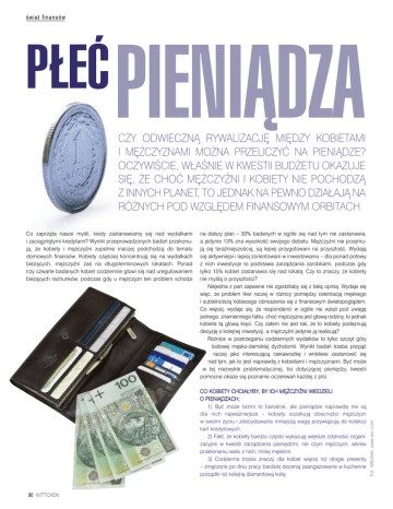 świat finansów PŁEĆ PIENIĄDZA CZY ODWIECZNĄ RYWALIZACJĘ MIĘDZY KOBIETAMI I MĘŻCZYZNAMI MOŻNA PRZELICZYĆ NA PIENIĄDZE? OCZYWIŚCIE, WŁAŚNIE W KWESTII BUDŻETU OKAZUJE SIĘ, ŻE CHOĆ MĘŻCZYŹNI I KOBIETY NIE POCHODZĄ Z INNYCH PLANET, TO JEDNAK NA PEWNO DZIAŁAJĄ NA RÓŻNYCH POD WZGLĘDEM FINANSOWYM ORBITACH. na dalszy plan – 30% badanych w ogóle się nad tym nie zastanawia, a jedynie 13% zna wysokość swojego debetu. Mężczyźni nie przejmują się teraźniejszością, są lepiej przygotowani na przyszłość. Wydają się aktywniejsi i lepiej zorientowani w inwestowaniu – dla ponad połowy z nich inwestycje to podstawa zarządzania zarobkami, podczas gdy tylko 15% kobiet zastanawia się nad lokatą. Czy to znaczy, że kobiety nie myślą o przyszłości? Niejedna z pań zapewne nie zgodziłaby się z taką opinią. Wydaje się więc, że problem tkwi raczej w różnicy pomiędzy ostentacją męskiego i subtelnością kobiecego obnoszenia się z finansowym światopoglądem. Co więcej, wydaje się, że respondenci w ogóle nie wzięli pod uwagę jednego, znamiennego faktu: choć mężczyzna jest głową rodziny, to jednak kobieta tą głową kręci. Czy zatem nie jest tak, że to kobiety podejmują decyzję o kolejnej inwestycji, a mężczyźni jedynie ją realizują? Różnice w postrzeganiu codziennych wydatków to tylko szczyt góry lodowej męsko-damskiej dychotomii. Wyniki badań trzeba przyjąć raczej jako interesującą ciekawostkę i wnikliwie zastanowić się nad tym, jak to jest naprawdę z kobietami i mężczyznami. Być może w tej niezwykle problematycznej, bo dotyczącej pieniędzy, kwestii pomocne okaże się poznanie oczekiwań każdej z płci. CO KOBIETY CHCIAŁYBY, BY ICH MĘŻCZYŹNI WIEDZIELI O PIENIĄDZACH: 1) Być może brzmi to banalnie, ale pieniądze naprawdę nie są dla nich najważniejsze – kobiety oczekują obecności mężczyzn w swoim życiu i zdecydowanie mniejszą wagę przywiązują do kolekcji kart kredytowych. 2) Fakt, że kobiety bardzo często wykazują większe zdolności organizacyjne w kwestii zarządzania pieniędzmi, nie czyni mężczyzn, wbrew przekonaniu wielu z nich, mniej męskimi. 3) Codzienna troska znaczy dla kobiet więcej niż drogie prezenty – zmęczone po dniu pracy bardziej docenią zaangażowanie w kuchenne porządki niż kolejną diamentową kolię. 90 WITTCHEN Fot. Wittchen, www.sxc.com Co zaprząta nasze myśli, kiedy zastanawiamy się nad wydatkami i zaciągniętymi kredytami? Wyniki przeprowadzonych badań przekonują, że kobiety i mężczyźni zupełnie inaczej podchodzą do tematu domowych finansów. Kobiety częściej koncentrują się na wydatkach bieżących, mężczyźni zaś na długoterminowych lokatach. Ponad trzy czwarte badanych kobiet codziennie głowi się nad uregulowaniem bieżących rachunków, podczas gdy u mężczyzn ten problem schodzi 4) Dekorując mieszkanie, kobiety nie dbają o koszta. Nie jest to jednak zbędna rozrzutność. Nowoczesny design salonu ma dla kobiet takie samo znaczenie jak dla większości mężczyzn opływowe kształty i siła silnika nowoczesnego kabrioletu. 5) Nawet jeśli kobieta sprawuje pieczę nad codziennym budżetem, docenia zaangażowanie mężczyzn w planowanie bieżących wydatków. Potrzebuje wsparcia i akceptacji powziętych decyzji – z pewnością bycie nadzorcą orzekającym o konieczności zredukowania kosztów codziennego lunchu na mieście nie leży w jej naturze. 6) Stanowcze „nie” od czasu do czasu skutecznie przyhamuje niekiedy zbyt kosztowne pomysły kobiet. Przesadnie emocjonalne traktowanie wielu kwestii to ich największa słabość. Do mężczyzn należy zatem obowiązek jednoznacznego wskazania prawdziwych potrzeb i odgrodzenie ich od nieprzemyślanych zachcianek. CO MĘŻCZYŹNI CHCIELIBY, BY ICH KOBIETY WIEDZIAŁY O PIENIĄDZACH: 1) Mężczyźni nie znają odpowiedzi na wszystkie pytania, jakie stawia przed nimi świat finansów. Być może niekiedy trudno im się do tego przyznać, ale ma on dla nich wiele tajemnic. Niejednokrotnie wbrew temu, co twierdzą, kiedy do głosu dochodzi męska duma, nie wiedzą, która z lokat będzie najodpowiedniejsza dla dziecka, która z inwestycji – najkorzystniejsza. Pomoc kobiet w tych kwestiach jest zatem zawsze niezbędna. 2) Myśl o bezpiecznej emeryturze zaprząta ich myśli niemal codziennie. Oszczędność to ich domena – przecież jedna zaoszczędzona złotówka równa się dwóm złotówkom zarobionym. Dostatnia, pewna przyszłość to ich główny cel – miło jest czuć, że i kobiety o niej myślą, dbając o ekonomię codziennych wydatków. 3) Choć rozrzutność nie leży w męskiej naturze, panowie nie chcą być postrzegani jako skąpcy. Lubią zabierać swoje partnerki do restauracji, chcą obsypywać je kwiatami i rozczulać pudełkami czekoladek. Umiejętność dokonywania słusznych finansowych wyborów, wyczucie chwili, okazji i możliwości nie są im obce – zbędne są zatem pytania kobiet o to, czy „na pewno nas na to stać?”. Owszem, oszczędność to ich domena, ale mężczyźni wiedzą, jak zaoszczędzić, a jednocześnie zasłużyć na miano dżentelmena. 4) Mężczyźni bardzo nie lubią, kiedy kobiety wprowadzają ich w zakłopotanie publiczną dyskusją o problemach finansowych. Nic ich tak nie zrani, jak litość na twarzy słuchaczy dowiadujących się, że ich inwestycja poniosła fiasko, a status materialny zawdzięczają dobroduszności rodziców. Nie zniosą myśli, że w kwestii pieniądza są nieudolni. Przecież każda porażka mobilizuje do wzmożonej aktywności – mężczyźni wiedzą, jak przekuć ją w zwycięstwo. Najlepiej więc, żeby kobiety nie podcinały im skrzydeł, podkreślając chwilowe trudności w dosiadaniu finansowego rumaka sukcesu. Marcin Pacho Tekst powstał dzięki uprzejmości użytkowników portali Thewinsdomjournal.com i Beingfrugal.net REKLAMA W. Eichelberger