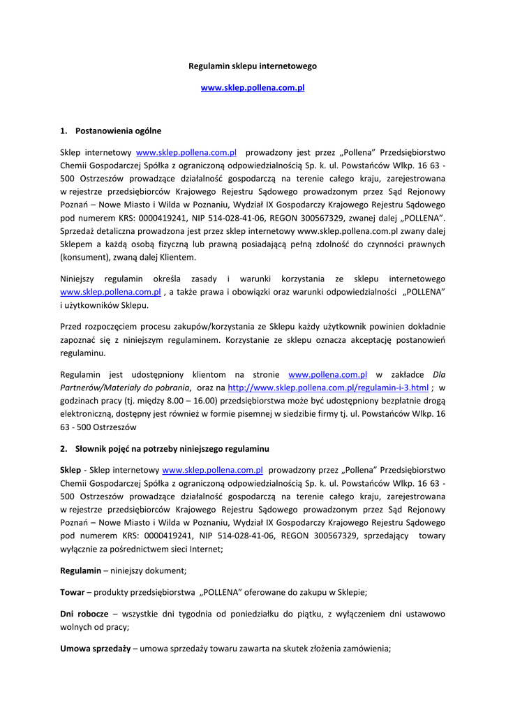 Regulamin sklepu internetowego www.sklep.pollena.com.pl 1. Postanowienia ogólne Sklep internetowy www.sklep.pollena.com.pl prowadzony jest przez „Pollena” Przedsiębiorstwo Chemii Gospodarczej Spółka z ograniczoną odpowiedzialnością Sp. k. ul. Powstańców Wlkp. 16 63 500 Ostrzeszów prowadzące działalność gospodarczą na terenie całego kraju, zarejestrowana w rejestrze przedsiębiorców Krajowego Rejestru Sądowego prowadzonym przez Sąd Rejonowy Poznań – Nowe Miasto i Wilda w Poznaniu, Wydział IX Gospodarczy Krajowego Rejestru Sądowego pod numerem KRS: 0000419241, NIP 514-028-41-06, REGON 300567329, zwanej dalej „POLLENA”. Sprzedaż detaliczna prowadzona jest przez sklep internetowy www.sklep.pollena.com.pl zwany dalej Sklepem a każdą osobą fizyczną lub prawną posiadającą pełną zdolność do czynności prawnych (konsument), zwaną dalej Klientem. Niniejszy regulamin określa zasady i warunki korzystania ze sklepu internetowego www.sklep.pollena.com.pl , a także prawa i obowiązki oraz warunki odpowiedzialności „POLLENA” i użytkowników Sklepu. Przed rozpoczęciem procesu zakupów/korzystania ze Sklepu każdy użytkownik powinien dokładnie zapoznać się z niniejszym regulaminem. Korzystanie ze sklepu oznacza akceptację postanowień regulaminu. Regulamin jest udostępniony klientom na stronie www.pollena.com.pl w zakładce Dla Partnerów/Materiały do pobrania, oraz na http://www.sklep.pollena.com.pl/regulamin-i-3.html ; w godzinach pracy (tj. między 8.00 – 16.00) przedsiębiorstwa może być udostępniony bezpłatnie drogą elektroniczną, dostępny jest również w formie pisemnej w siedzibie firmy tj. ul. Powstańców Wlkp. 16 63 - 500 Ostrzeszów 2. Słownik pojęć na potrzeby niniejszego regulaminu Sklep - Sklep internetowy www.sklep.pollena.com.pl prowadzony przez „Pollena” Przedsiębiorstwo Chemii Gospodarczej Spółka z ograniczoną odpowiedzialnością Sp. k. ul. Powstańców Wlkp. 16 63 500 Ostrzeszów prowadzące działalność gospodarczą na terenie całego kraju, zarejestrowana w rejestrze przedsiębiorców Krajowego Rejestru Sądowego prowadzonym przez Sąd Rejonowy Poznań – Nowe Miasto i Wilda w Poznaniu, Wydział IX Gospodarczy Krajowego Rejestru Sądowego pod numerem KRS: 0000419241, NIP 514-028-41-06, REGON 300567329, sprzedający towary wyłącznie za pośrednictwem sieci Internet; Regulamin – niniejszy dokument; Towar – produkty przedsiębiorstwa „POLLENA” oferowane do zakupu w Sklepie; Dni robocze – wszystkie dni tygodnia od poniedziałku do piątku, z wyłączeniem dni ustawowo wolnych od pracy; Umowa sprzedaży – umowa sprzedaży towaru zawarta na skutek złożenia zamówienia; Klient - osoba fizyczna lub prawna posiadająca pełną zdolność do czynności prawnych (konsument); Zamówienie – dyspozycja zakupu towaru/towarów złożona przez klienta za pomocą środków komunikacji elektronicznej; Środki komunikacji elektronicznej – rozwiązania techniczne, w tym urządzenia teleinformatyczne i współpracujące z nimi narzędzia umożliwiające porozumiewanie się na odległość przy wykorzystaniu transmisji danych między systemami teleinformatycznymi, w tym poczta elektroniczna; Konto Klienta – baza danych zawierających informacje o Kliencie służące do realizacji składanych zamówień, dane kontaktowe, historię zamówień, dane dotyczące wpłat z tytułu zamówień; Przelew tradycyjny – płatność dokonana przez Klienta przez konto internetowe, stacjonarnie w banku lub na poczcie; Przelew elektroniczny – płatność dokonana przez Klienta z konta bankowego on-line, kartą kredytową, za pośrednictwem centrum rozliczeniowego dotpay: http://dotpay.pl 3. Informacje techniczne Administratorem sklepu jest „Pollena” Przedsiębiorstwo Chemii Gospodarczej Spółka z ograniczoną odpowiedzialnością Sp. k. ul. Powstańców Wlkp. 16 63 - 500 Ostrzeszów prowadzące działalność gospodarczą na terenie całego kraju, zarejestrowana w rejestrze przedsiębiorców Krajowego Rejestru Sądowego prowadzonym przez Sąd Rejonowy Poznań – Nowe Miasto i Wilda w Poznaniu, Wydział IX Gospodarczy Krajowego Rejestru Sądowego pod numerem KRS: 0000419241, NIP 514-028-41-06, REGON 300567329zwanej dalej „POLLENA” Kontakt do Sklepu - e-mail: [email protected]; tel: 62 7323284 (do godz. 14-tej) Sklep oferuje następujący rodzaj usług świadczonych drogą elektroniczną: Sklep internetowy Korzystanie ze Sklepu jest możliwe za pośrednictwem komputera oraz innych urządzeń umożliwiających przeglądanie sieci Internet, posiadających odpowiednie oprogramowanie, w tym przeglądarkę internetową. Sklep został zoptymalizowany dla następujących parametrów technicznych: przeglądarka: Google Chrome, Internet Explorer, Mozilla, Firefox; system operacyjny: MS Windows, Mac OS, Android rozdzielczość: 1024x68 wymagania sprzętowe: komputer lub urządzenie mobilne posiadające procesor o taktowaniu co najmniej 1 GHz oraz pamięć RAM co najmniej 512 Mb; Sklep zawiera treści informacyjne (oferta handlowa) i handlowe 4. Oferta i cena towarów Sklep internetowy prowadzi sprzedaż towarów na terenie Polski wyłącznie za pośrednictwem sieci Internet. Wszystkie ceny w ofercie Sklepu podane są w złotych polskich i zawierają podatek VAT. Cena podana przy każdym towarze jest wiążąca w chwili złożenia przez klienta zamówienia i jest ceną towaru. Koszt dostawy dostępny jest pod adresem: http://www.sklep.pollena.com.pl/koszty-dostawy-i7.html Sklep zastrzega sobie prawo do zmiany cen towarów i kosztu transportu znajdujących się w ofercie, wprowadzania nowych towarów do oferty Sklepu, przeprowadzania i odwoływania akcji promocyjnych na stronach Sklepu bądź wprowadzania w nich zmian. Wskazane zmiany będą miały zastosowanie jedynie do zamówień złożonych już po ich wprowadzeniu. Oferty promocyjne i rabaty co do zasady nie łączą się, chyba że regulamin promocji stanowi inac