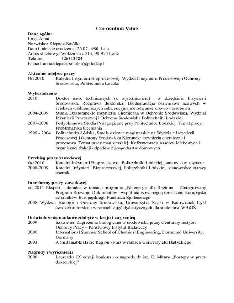 Curriculum Vitae Dane ogólne Imię: Anna Nazwisko: Klepacz-Smółka Data i miejsce urodzenia: 26.07.1980, Łask Adres służbowy: Wólczańska 213, 90-924 Łódź Telefon: 426313704 E-mail: [email protected] Aktualne miejsce pracy Od 2010 Katedra Inżynierii Bioprocesowej, Wydział Inżynierii Procesowej i Ochrony Środowiska, Politechnika Łódzka Wykształcenie 2010 Doktor nauk technicznych (z wyróżnieniem) w dziedzinie Inżynierii Środowiska. Rozprawa doktorska: Biodegradacja barwników azowych w ściekach włókienniczych sekwencyjną metodą anaerobowo / aerobową 2004-2009 Studia Doktoranckie Inżynieria Chemiczna w Ochronie Środowiska, Wydział Inżynierii Procesowej i Ochrony Środowiska Politechniki Łódzkiej 2007-2008 Podyplomowe Studia Pedagogiczne przy Politechnice Łódzkiej. Temat pracy: Problematyka Oceniania 1999 - 2004 Politechnika Łódzka, Studia dzienne magisterskie na Wydziale Inżynierii Procesowej i Ochrony Środowiska Kierunek: inżynieria chemiczna i procesowa. Temat pracy magisterskiej: Kofermentacja osadów ściekowych i organicznej frakcji odpadów z gospodarstw domowych Przebieg pracy zawodowej Od 2010 Katedra Inżynierii Bioprocesowej, Politechniki Łódzkiej, stanowisko: asystent 2008-2009 Katedra Inżynierii Bioprocesowej, Politechniki Łódzkiej, stanowisko: starszy chemik Inne formy pracy zawodowej od 2011 Ekspert – doradca w ramach programu „Bioenergia dla Regionu – Zintegrowany Program Rozwoju Doktorantów” współfinansowanego przez Unię Europejską ze środków Europejskiego Funduszu Społecznego 2008 Wydział Biologii i Ochrony Środowiska, Uniwersytet Śląski w Katowicach Cykl ćwiczeń autorskich w ramach zajęć dydaktycznych dla studentów WBiOŚ Doświadczenia naukowe zdobyte w kraju i za granicą 2009 Szkolenie: Zagrożenia biologiczne w środowisku pracy Centralny Instytut Ochrony Pracy – Państwowy Instytut Badawczy 2006 International Summer School of Chemical Engineering, Dortmund University, Germany 2003 A Sustainable Baltic Region - kurs w ramach Uniwersytetu Bałtyckiego Nagrody i wyróżnienia 2006 Laureatka IX edycji konkursu o nagrodę dr inż. E. Mitury „Postępy w pracy doktorskiej” Znajomość języków obcych angielski - zaawansowany niemiecki - podstawowy Udział w projektach badawczych 2011-2015 projekt rozwojowy NCBiR „Opracowanie zautomatyzowanych procedur do monitoringu osadu czynnego w oczyszczalniach ścieków” nr N R14 0004 10 2007 - 2010 projekt badawczy promotorski „Biodegradacja barwników azowych w ściekach włókienniczych metodą sekwencyjną anaerobowo / aerobową” nr N N208 3008 33 2008 - 2009 projekt europejski 6-ego Programu Ramowego 018525 REMOVALS Reduction, modification and valorisation of sludge 2007 - 2008 projekt celowy Dekoloryzacja barwników azowych w warunkach beztlenowych. Mechanizmu Wspierania Innowacyjnej Działalności Doktorantów 2005 - 2008 projekt badawczy „Integracja procesów membranowych i biologicznych w oczyszczaniu ścieków włókienniczych” nr 3 T09D 030 29 Inne formy działalności organizacyjnej 2012 Członek komitetu organizacyjnego XI ogólnopolskiej konferencji naukowej „Postępy Inżynierii Bioreaktorowej” 2011 – 2012 Opiekun młodzieżowego koła naukowego z ramienia uczelni w ramach programu „Z Nauką Ścisłą za Pan Brat” 2010 – 2011 Pełnomocnik Dziekana ds. Pomocy Materialnej Studentów i Doktorantów 2009 Członek komitetu organizacyjnego X Ogólnopolskiej Konferencji Naukowej „Postępy Inżynierii Bioreaktorowej”