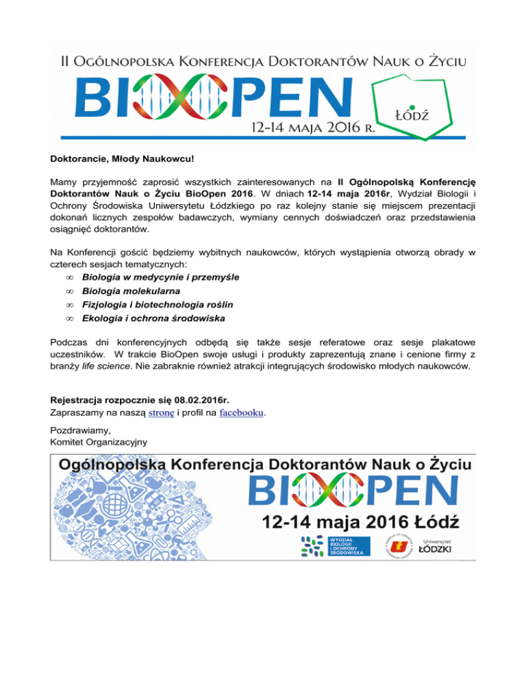 Doktorancie, Młody Naukowcu! Mamy przyjemność zaprosić wszystkich zainteresowanych na II Ogólnopolską Konferencję Doktorantów Nauk o Życiu BioOpen 2016. W dniach 12-14 maja 2016r, Wydział Biologii i Ochrony Środowiska Uniwersytetu Łódzkiego po raz kolejny stanie się miejscem prezentacji dokonań licznych zespołów badawczych, wymiany cennych doświadczeń oraz przedstawienia osiągnięć doktorantów. Na Konferencji gościć będziemy wybitnych naukowców, których wystąpienia otworzą obrady w czterech sesjach tematycznych: • Biologia w medycynie i przemyśle • • • Biologia molekularna Fizjologia i biotechnologia roślin Ekologia i ochrona środowiska Podczas dni konferencyjnych odbędą się także sesje referatowe oraz sesje plakatowe uczestników. W trakcie BioOpen swoje usługi i produkty zaprezentują znane i cenione firmy z branży life science. Nie zabraknie również atrakcji integrujących środowisko młodych naukowców. Rejestracja rozpocznie się 08.02.2016r. Zapraszamy na naszą stronę i profil na facebooku. Pozdrawiamy, Komitet Organizacyjny