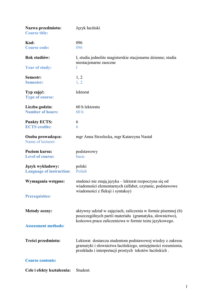 1 Nazwa przedmiotu: Język łaciński Course title: Kod: 096 Course
