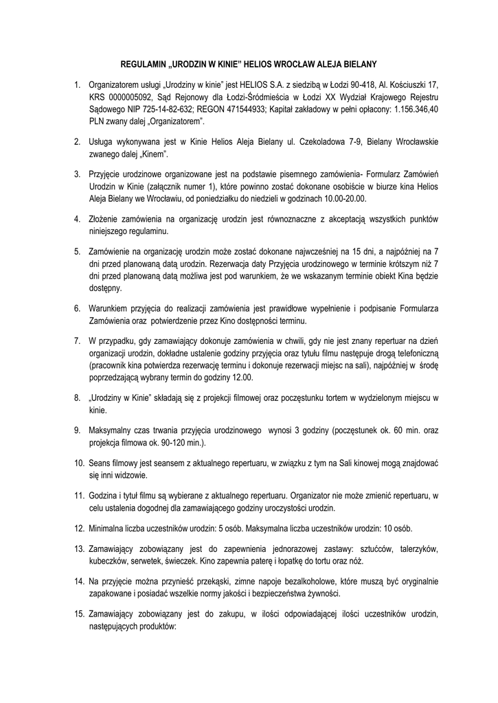 REGULAMIN „URODZIN W KINIE” HELIOS WROCŁAW ALEJA BIELANY 1. Organizatorem usługi „Urodziny w kinie” jest HELIOS S.A. z siedzibą w Łodzi 90-418, Al. Kościuszki 17, KRS 0000005092, Sąd Rejonowy dla Łodzi-Śródmieścia w Łodzi XX Wydział Krajowego Rejestru Sądowego NIP 725-14-82-632; REGON 471544933; Kapitał zakładowy w pełni opłacony: 1.156.346,40 PLN zwany dalej „Organizatorem”. 2. Usługa wykonywana jest w Kinie Helios Aleja Bielany ul. Czekoladowa 7-9, Bielany Wrocławskie zwanego dalej „Kinem”. 3. Przyjęcie urodzinowe organizowane jest na podstawie pisemnego zamówienia- Formularz Zamówień Urodzin w Kinie (załącznik numer 1), które powinno zostać dokonane osobiście w biurze kina Helios Aleja Bielany we Wrocławiu, od poniedziałku do niedzieli w godzinach 10.00-20.00. 4. Złożenie zamówienia na organizację urodzin jest równoznaczne z akceptacją wszystkich punktów niniejszego regulaminu. 5. Zamówienie na organizację urodzin może zostać dokonane najwcześniej na 15 dni, a najpóźniej na 7 dni przed planowaną datą urodzin. Rezerwacja daty Przyjęcia urodzinowego w terminie krótszym niż 7 dni przed planowaną datą możliwa jest pod warunkiem, że we wskazanym terminie obiekt Kina będzie dostępny. 6. Warunkiem przyjęcia do realizacji zamówienia jest prawidłowe wypełnienie i podpisanie Formularza Zamówienia oraz potwierdzenie przez Kino dostępności terminu. 7. W przypadku, gdy zamawiający dokonuje zamówienia w chwili, gdy nie jest znany repertuar na dzień organizacji urodzin, dokładne ustalenie godziny przyjęcia oraz tytułu filmu następuje drogą telefoniczną (pracownik kina potwierdza rezerwację terminu i dokonuje rezerwacji miejsc na sali), najpóźniej w środę poprzedzającą wybrany termin do godziny 12.00. 8. „Urodziny w Kinie” składają się z projekcji filmowej oraz poczęstunku tortem w wydzielonym miejscu w kinie. 9. Maksymalny czas trwania przyjęcia urodzinowego wynosi 3 godziny (poczęstunek ok. 60 min. oraz projekcja filmowa ok. 90-120 min.). 10. Seans filmowy jest seansem z aktualnego repertuaru, w związku z tym na Sali kinowej mogą znajdować się inni widzowie. 11. Godzina i tytuł filmu są wybierane z aktualnego repertuaru. Organizator nie może zmienić repertuaru, w celu ustalenia dogodnej dla zamawiającego godziny uroczystości urodzin. 12. Minimalna liczba uczestników urodzin: 5 osób. Maksymalna liczba uczestników urodzin: 10 osób. 13. Zamawiający zobowiązany jest do zapewnienia jednorazowej zastawy: sztućców, talerzyków, kubeczków, serwetek, świeczek. Kino zapewnia paterę i łopatkę do tortu oraz nóż. 14. Na przyjęcie można przynieść przekąski, zimne napoje bezalkoholowe, które muszą być oryginalnie zapakowane i posiadać wszelkie normy jakości i bezpieczeństwa żywności. 15. Zamawiający zobowiązany jest do zakupu, w ilości odpowiadającej ilości uczestników urodzin, następujących produktów: 1) BILET urodzinowy - na BILET urodzinowy w rozumieniu regulaminu składają się: bilet na seans oraz voucher (Voucher „urodziny”). Dopiero zakup obu tych produktów umożliwia uczestnictwo w imprezie. Na cenę BILETU urodzinowego składają się cena biletu na seans i cena vouchera. Na seanse 2D w tygodniu obowiązuje jedna cena BILETU urodzinowego bez podziału na kategorie wiekowe w wysokości 23,00 zł. Na seanse 2D w weekend obowiązuje jedna cena BILETU urodzinowego bez podziału na kategorie wiekowe w wysokości 25,00 zł. Na seanse 3D w tygodniu obowiązuje jedna cena BILETU bez podziału na kategorie wiekowe w wysokości 25,00zł. przy czym w cenie nie jest zawarta dopłata za okulary 3D w wysokości 3 zł. (niezbędnych do właściwego odbioru projekcji trójwymiarowych). Na seanse 3D w weekend obowiązuje jedna cena BILETU bez podziału na kategorie wiekowe w wysokości 27,00zł. przy czym w cenie nie jest zawarta dopłata za okulary 3D w wysokości 3 zł. (niezbędnych do właściwego odbioru projekcji trójwymiarowych). 2) tort urodzinowy - Kino dokonuje zamówienia tortu urodzinowego (rodzaj, smak, napis na torcie) wg deklaracji Zamawiającego złożonej na Formularzu Zamówienia Urodzin w Kinie. Waga tortu może się wahać od zamówionej +/- 10dag. Cena tortu wynosi: - z bitą śmietaną i owocami 55,00 zł /kg - czekoladowy 55,00zł /kg Zamawiający zobowiązany jest do poinformowania osoby przyjmującej rezerwacje o wszelkich alergiach oraz produktach nieprzyswajalnych przez dzieci, które zjawią się na Przyjęciu Urodzinowym. Ponadto zamawiający może dla uczestników urodzin zakupić Urodzinowy Zestaw Barowy w promocyjnej ceniejest to opcja dodatkowa zawarta w Formularzu Zamówienia Urodzin w Kinie. 16. Każdy z uczestników, podczas trwania urodzin, może nabyć dodatkowe produkty na własny koszt. 17. Przez cały czas trwania urodzin uczestnicy urodzin muszą pozostawać pod opieką jednej osoby pełnoletniej (opiekuna). 18. Organizator nie sprawuje pieczy nad uczestnikami urodzin. Wyłączną odpowiedzialność za sprawowanie opieki nad uczestnikami urodzin ponosi opiekun. Opiekunowi przysługuje bezpłatny wstęp na seans w ramach imprezy urodzinowej. 19. Ze względu na brak szatni Organizator nie ponosi odpowiedzialności za rzeczy pozostawione przez uczestników urodzin.