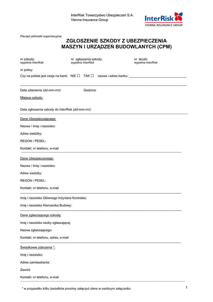 InterRisk Towarzystwo Ubezpieczeń S.A. Vienna Insurance Group Pieczęć jednostki organizacyjnej ZGŁOSZENIE SZKODY Z UBEZPIECZENIA MASZYN I URZĄDZEŃ BUDOWLANYCH (CPM) nr szkody: nr zgłoszenia szkody: nr teczki: wypełnia InterRisk wypełnia InterRisk wypełnia InterRisk nr polisy: Czy na polisie jest cesja na bank: NIE □ TAK □ nazwa i adres banku: ________________________________ _____________________________________________________________________________________________ Data zdarzenia (dd-mm-rrrr): Godzina: Miejsce szkody: Data zgłoszenia szkody do InterRisk (dd-mm-rrrr): Dane Ubezpieczającego: Nazwa / Imię i nazwisko: Adres siedziby: REGON / PESEL: Kontakt: nr telefonu, e-mail Dane Ubezpieczonego: Nazwa / Imię i nazwisko: Adres siedziby: REGON / PESEL: Kontakt: nr telefonu, e-mail __________________________________________________________________________________________ Imię i nazwisko Głównego Inżyniera Kontraktu: Imię i nazwisko Kierownika Budowy: __________________________________________________________________________________________ Dane zgłaszającego szkodę: Imię i nazwisko osoby zgłaszającej: Nazwa zgłaszającego: Kontakt: nr telefonu, adres, e-mail __________________________________________________________________________________________ Świadkowie zdarzenia *: Imię i nazwisko: Adres zamieszkania: Zawód: Kontakt: nr telefonu, e-mail __________________________________________________________________________________________________________________________________________ * w przypadku kilku świadków prosimy załączyć dane w osobnym załączniku 1 InterRisk Towarzystwo Ubezpieczeń S.A. Vienna Insurance Group Dokładny opis okoliczności zdarzenia (załączyć szkic sytuacyjny, zdjęcia itp.) *: Przyczyna powstania szkody: O zdarzeniu poinformowano TAK NIE Dokładny adres i telefon Policję Straż Pożarną Producenta / serwisanta maszyny Inne Kto powiadomił o szkodzie? Imię i nazwisko: Adres zamieszkania: Zawód: Kontakt: nr telefonu, e-mail _____________________________________________________________________________________________ Dane uszkodzonego elementu **: Pozycja z wykazu do polisy, która uległa uszkodzeniu: Suma ubezpieczenia: Nazwa producenta, typ, model urządzenia: Rok produkcji, nr seryjny (prosimy o podanie szczegółów zgodnie z tabliczką znamionową): Opis uszkodzonego elementu (wydajność, prędkość obrotowa, masa itd.): Jakie części zostały uszkodzone? Wysokość roszczeń (wstępna wycena strat): * w przypadku niewystarczającej ilości miejsca, prosimy dołączyć opis jako załącznik ** jeżeli więcej niż jeden element z wykazu do polisy uległ uszkodzeniu prosimy wypełnić formularz dla każdego elementu lub dołączyć opis jako załącznik 2 InterRisk Towarzystwo Ubezpieczeń S.A. Vienna Insurance Group W jaki sposób będzie przeprowadzona naprawa / remont / wymiana, przez kogo i gdzie? Prosimy o podanie przewidywanego czasu naprawy: Jaki jest przewidywany koszt naprawy? Czy upłynął okres gwarancji udzielonej przez producenta na uszkodzony element? Jeżeli tak, to kiedy? NIE □ TAK □ Dane osoby, która w chwili zdarzenia obsługiwała maszynę / urządzenie budowlane (operatora maszyny): Imię i nazwisko: Adres zamieszkania: Zawód: Kontakt: nr telefonu, e-mail Czy podczas prowadzenia napraw wprowadzono jakiekolwiek zmiany lub modernizacje / ulepszenia projektu, metod prowadzenia robót lub materiałów budowlanych? NIE □ TAK Czy wystąpiły szkody w istniejących budynkach lub mieniu otaczającym? jakim zakresie stwierdzono uszkodzenia i przez co spowodowane? □ NIE Jeżeli tak, to w jakim zakresie? □ TAK □ Jeżeli tak to w Prosimy podać wstępną wycenę strat: Dane sprawcy szkody: Nazwa / Imię i nazwisko: Adres siedziby / zamieszkania: REGON / PESEL: Kontakt: nr telefonu, e-mail Czy w sprawie wdrożono postępowanie karne? komu oraz organ prowadzący sprawę: NIE □ TAK □ TAK □ NIE □ Jeżeli tak to prosimy wskazać przeciwko Dane osoby kontaktowej: Imię i nazwisko: Nazwa: Kontakt: nr telefonu, adres, e-mail: Czy Ubezpieczony jest płatnikiem podatku VAT? Czy Ubezpieczony z tytułu zaistniałej szkody otrzymał odszkodowanie z innego zakładu ubezpieczeń lub czy zgłosił szkodę do innego zakładu ubezpieczeń NIE □ TAK □ Nazwa i adres zakładu ubezpieczeń: ____________________________________________________________________________________________ 3 InterRisk Towarzystwo Ubezpieczeń S.A. Vienna Insurance Group Do zgłoszenia załączono następujące dokumenty (oryginał / kopia) *: Dokument potwierdzający posiadanie ubezpieczone mienia Wykaz uszkodzonego / skradzionego mienia Rachunek wysokości strat / dokumenty, na podstawie których został sporządzony Zdjęcia z miejsca zdarzenia / zdjęcia przedmiotu szkody Dokument z Policji / Straży Miejskiej / Straży Pożarnej dotyczący zdarzenia Dokumentacja techniczna uszkodzonej maszyny / urządzenia budowlanego Kopia uprawnień operatora maszyny do obsługi maszyny Oświadczenie operatora maszyny o stanie trzeźwości / pozostawania pod wpływem środków odurzających □ □ □ □ □ □ □ □ □ Inne (wymienić jakie?) Uwagi: Zgodnie z ustawą z dnia 29 sierpnia 1997 r. o ochronie danych osobowych (Dz. U. Nr 133 późn. zm.) informujemy, że Pani/Pana dane osobowe będą przetwarzane przez InterRisk TU S.A. Vienna Insurance Group z siedzibą przy ul. Noakowskiego 22 00-668 Warszawa w celu i zakresie realizacji procesu likwidacji szkody. Ma Pani/Pan prawo wglądu do swoich danych osobowych i ich poprawiania. OŚWIADCZENIA ZGŁASZAJĄCEGO 1. Oświadczam, że zgłoszone przeze mnie dane w niniejszym zgłoszeniu są prawdziwe 2. W związku z tym, że likwidacja szkody może wymagać współpracy InterRisk TU S.A. Vienna Insurance Group z profesjonalnymi rzeczoznawcami zewnętrznymi, zgodnie z art. 23.1.1 ustawy z dnia 29 sierpnia 1997 r. o ochronie danych osobowych (Dz. U. z 2002r. Nr 101 poz. 926 z późn. zm.) wyr