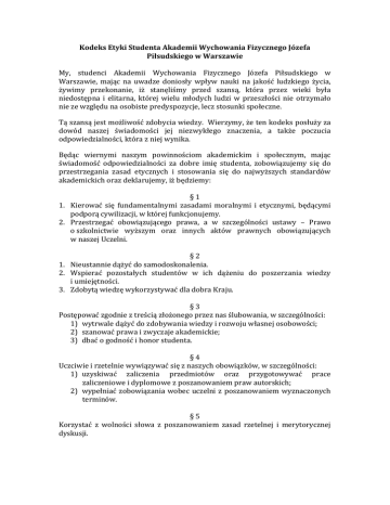 Kodeks Etyki Studenta Akademii Wychowania Fizycznego Józefa Piłsudskiego w Warszawie My, studenci Akademii Wychowania Fizycznego Józefa Piłsudskiego w Warszawie, mając na uwadze doniosły wpływ nauki na jakość ludzkiego życia, żywimy przekonanie, iż stanęliśmy przed szansą, która przez wieki była niedostępna i elitarna, której wielu młodych ludzi w przeszłości nie otrzymało nie ze względu na osobiste predyspozycje, lecz stosunki społeczne. Tą szansą jest możliwość zdobycia wiedzy. Wierzymy, że ten kodeks posłuży za dowód naszej świadomości jej niezwykłego znaczenia, a także poczucia odpowiedzialności, która z niej wynika. Będąc wiernymi naszym powinnościom akademickim i społecznym, mając świadomość odpowiedzialności za dobre imię studenta, zobowiązujemy się do przestrzegania zasad etycznych i stosowania się do najwyższych standardów akademickich oraz deklarujemy, iż będziemy: §1 1. Kierować się fundamentalnymi zasadami moralnymi i etycznymi, będącymi podporą cywilizacji, w której funkcjonujemy. 2. Przestrzegać obowiązującego prawa, a w szczególności ustawy – Prawo o szkolnictwie wyższym oraz innych aktów prawnych obowiązujących w naszej Uczelni. §2 1. Nieustannie dążyć do samodoskonalenia. 2. Wspierać pozostałych studentów w ich dążeniu do poszerzania wiedzy i umiejętności. 3. Zdobytą wiedzę wykorzystywać dla dobra Kraju. §3 Postępować zgodnie z treścią złożonego przez nas ślubowania, w szczególności: 1) wytrwale dążyć do zdobywania wiedzy i rozwoju własnej osobowości; 2) szanować prawa i zwyczaje akademickie; 3) dbać o godność i honor studenta. §4 Uczciwie i rzetelnie wywiązywać się z naszych obowiązków, w szczególności: 1) uzyskiwać zaliczenia przedmiotów oraz przygotowywać prace zaliczeniowe i dyplomowe z poszanowaniem praw autorskich; 2) wypełniać zobowiązania wobec uczelni z poszanowaniem wyznaczonych terminów. §5 Korzystać z wolności słowa z poszanowaniem zasad rzetelnej i merytorycznej dyskusji. §6 Postępować dla dobra wspólnoty akademickiej, dbać o dobre imię i pozytywny wizerunek Uczelni oraz szanować jej tradycje. §7 1. Szanować godność wszystkich członków społeczności akademickiej. 2. Odnosić się do pracowników Uczelni z należnym im szacunkiem. §8 Współdziałać na rzecz krzewienia i upowszechniania niniejszego Kodeksu wśród studentów oraz innych członków społeczności akademickiej Uczelni.