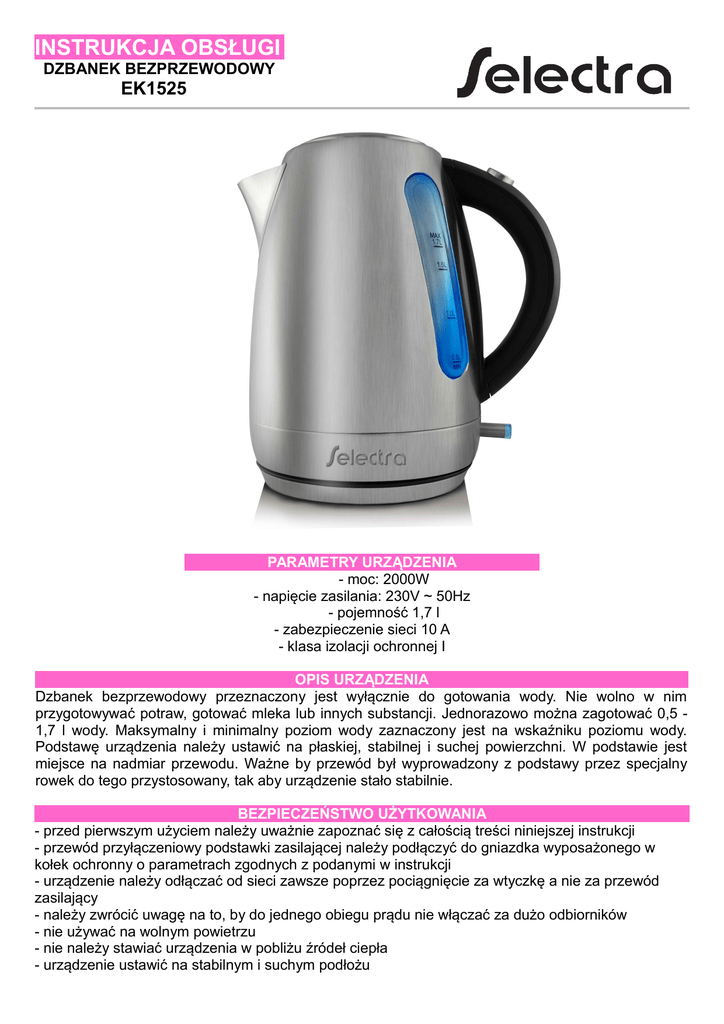 INSTRUKCJA OBSŁUGI DZBANEK BEZPRZEWODOWY EK1525 PARAMETRY URZĄDZENIA - moc: 2000W - napięcie zasilania: 230V ~ 50Hz - pojemność 1,7 l - zabezpieczenie sieci 10 A - klasa izolacji ochronnej I OPIS URZĄDZENIA Dzbanek bezprzewodowy przeznaczony jest wyłącznie do gotowania wody. Nie wolno w nim przygotowywać potraw, gotować mleka lub innych substancji. Jednorazowo można zagotować 0,5 1,7 l wody. Maksymalny i minimalny poziom wody zaznaczony jest na wskaźniku poziomu wody. Podstawę urządzenia należy ustawić na płaskiej, stabilnej i suchej powierzchni. W podstawie jest miejsce na nadmiar przewodu. Ważne by przewód był wyprowadzony z podstawy przez specjalny rowek do tego przystosowany, tak aby urządzenie stało stabilnie. BEZPIECZEŃSTWO UŻYTKOWANIA - przed pierwszym użyciem należy uważnie zapoznać się z całością treści niniejszej instrukcji - przewód przyłączeniowy podstawki zasilającej należy podłączyć do gniazdka wyposażonego w kołek ochronny o parametrach zgodnych z podanymi w instrukcji - urządzenie należy odłączać od sieci zawsze poprzez pociągnięcie za wtyczkę a nie za przewód zasilający - należy zwrócić uwagę na to, by do jednego obiegu prądu nie włączać za dużo odbiorników - nie używać na wolnym powietrzu - nie należy stawiać urządzenia w pobliżu źródeł ciepła - urządzenie ustawić na stabilnym i suchym podłożu - przed włączeniem trzeba upewnić się czy w dzbanku jest woda (nie należy uruchamiać dzbanka bez wody) - nie wolno nalewać powyżej poziomu max na wskaźniku dzbanka. Przepełnienie dzbanka grozi niekontrolowanym wypływem gorącej wody na zewnątrz (grozi to zalaniem połączeń elektrycznych i zwarciem) - wyłączyć urządzenie z sieci, jeśli nie jest już ono używane oraz przed jego czyszczeniem - nie przenosić ani nie przesuwać w trakcie użytkowania - nie napełniać dzbanka ustawionego na podstawie - niniejszy sprzęt nie jest przeznaczony do użytku przez osoby (w tym dzieci) o ograniczonej zdolności fizycznej, czuciowej lub psychicznej, lub osoby nie mające doświadczenia lub znajomości sprzętu, chyba że odbywa się to pod nadzorem lub zgodnie z instrukcją użytkowania sprzętu, przekazanej przez osoby odpowiedzialne za ich bezpieczeństwo. - należy zwracać uwagę aby dzieci nie bawiły się sprzętem - nie pozostawiać urządzenia bez nadzoru - dzbanek włączony do sieci lub zawierający gorącą wodę pozostawiony bez nadzoru może być niebezpieczny dla dzieci - nie chwytać urządzenia mokrymi rękami - podczas mycia nie wolno zanurzać dzbanka w wodzie - dzbanek może być używany tylko z dołączoną, oryginalną podstawą - należy uważać na wydobywającą się z dzbanka podczas gotowania gorącą parę - sprzęt tylko do użytku domowego, przy eksploatacji przemysłowej, niezgodnej z przeznaczeniem lub wbrew niniejszej instrukcji sprzedawca nie ponosi żadnej odpowiedzialności a uprawnienia z tytułu gwarancji wygasają - jeżeli przewód zasilający ulegnie uszkodzeniu, aby zapobiec niebezpieczeństwu musi on zostać wymieniony przez osoby do tego uprawnione - napraw sprzętu może dokonać jedynie autoryzowany punkt serwisowy, a wszelkie modernizacje lub stosowanie innych niż oryginalne części zamiennych lub elementów urządzenia jest zabronione i zagraża bezpieczeństwu użytkowania - producent nie ponosi odpowiedzialności za ewentualne szkody powstałe w wyniku niewłaściwego używania urządzenia UŻYTKOWANIE URZĄDZENIA Przed pierwszym użyciem dzbanka należy 2-3 krotnie zagotować wodę i wylać. Urządzenie można napełniać bezpośrednio przez wylewkę lub po otwarciu pokrywy. W celu otwarcia pokrywy należy wcisnąć przycisk zwalniający pokrywę. Nie należy napełniać dzbanka kiedy stoi na podstawie. Dzbanek rozpoczyna pracę po włączeniu przycisku w pozycję „1”. Praca urządzenia sygnalizowana jest podświetleniem włącznika. Dzbanek wyłącza się automatycznie po zagotowaniu wody. Pracę urządzenia można przerwać w dowolnym momencie ustawiając przełącznik w pozycję „0”. FILTR SIATKOWY Zamontowany w dzbanku filtr jest zbudowany z siatki zatrzymującej cząsteczki kamienia. Filtr nie usuwa kamienia z wody, zapobiega jedynie jego przedostawaniu się do naczynia przy wlewaniu wody. Filtr należy regularnie czyścić. Twarda woda może spowodować zatkanie filtra już po kilkunastu gotowaniach. PRACA PODSTAWOWA Dzbanek po zagotowaniu wody automatycznie się wyłączy. Przed ponownym włączeniem dzbanka należy odczekać aż dzbanek ostygnie. BRAK WODY Nie wolno włączać dzbanka bez wody. Dzbanek posiada zabezpieczenie przed włączeniem go bez wody. CZYSZCZENIE I KONSERWACJA - przed czyszczeniem odłączyć dzbanek od sieci - dzbanek wolno czyścić dopiero, kiedy ostygnie - podczas mycia nie wolno zanurzać dzbanka w wodzie - zewnętrzne powierzchnie można czyścić przy pomocy wilgotnej ściereczki z dodatkiem płynu do mycia naczyń - osad z wody na wewnętrznych powierzchniach należy usuwać ściereczką zwilżoną w occie, po czym dzbanek wypłukać czystą wodą - w przypadku osadzania się kamienia wapiennego na płycie grzejnej należy go regularnie usuwać stosując w tym celu dostępne na rynku odkamieniacze do dzbanków - zaniechanie usuwania kamienia z grzałki powoduje przyśpieszone zużycie elementu grzejnego dzbanka i utratę gwarancji - szkody wynikłe w przypadku stosowania zbyt agresywnych środków do usuwania kamienia dostępnych w handlu nie są objęte gwarancją producenta dzbanka OCHRONA ŚRODOWISKA Urządzenie jest zbudowane z materiałów, które mogą być poddane ponownemu przetwarzaniu lub recyklingowi. Należy je przekazać do odpowiedniego punktu, który zajmuje się zbieraniem i recyklingiem urządzeń elektrycznych i elektronicznych. GWARANCJA Urządzenie przeznaczone jest do użytku prywatnego w gospodarstwie domowym,nie może być używane do celów zawodowych. Gwarancja traci ważno