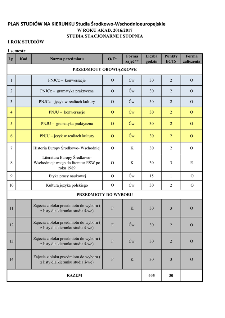 PLAN STUDIÓW NA KIERUNKU Studia Środkowo-Wschodnioeuropejskie W ROKU AKAD. 2016/2017 STUDIA STACJONARNE I STOPNIA I ROK STUDIÓW I semestr Lp. Kod Nazwa przedmiotu O/F* Forma zajęć** Liczba godzin Punkty ECTS Forma zaliczenia PRZEDMIOTY OBOWIĄZKOWE 1 PNJCz – konwersacje O Ćw. 30 2 O 2 PNJCz – gramatyka praktyczna O Ćw. 30 2 O 3 PNJCz – język w realiach kultury O Ćw. 30 2 O 4 PNJU – konwersacje O Ćw. 30 2 O 5 PNJU – gramatyka praktyczna O Ćw. 30 2 O 6 PNJU – język w realiach kultury O Ćw. 30 2 O 7 Historia Europy Środkowo- Wschodniej O K 30 2 O 8 Literatura Europy ŚrodkowoWschodniej: wstęp do literatur EŚW po roku 1989 O K 30 3 E 9 Etyka pracy naukowej O Ćw. 15 1 O 10 Kultura języka polskiego O Ćw. 30 2 O PRZEDMIOTY DO WYBORU 11 Zajęcia z bloku przedmiotu do wyboru ( z listy dla kierunku studia ś-we) F K 30 3 O 12 Zajęcia z bloku przedmiotu do wyboru ( z listy dla kierunku studia ś-we) F Ćw. 30 2 O 13 Zajęcia z bloku przedmiotu do wyboru ( z listy dla kierunku studia ś-we) F Ćw. 30 2 O 14 Zajęcia z bloku przedmiotu do wyboru ( z listy dla kierunku studia ś-we) F K 30 3 O 405 30 RAZEM PLAN STUDIÓW NA KIERUNKU Studia Środkowo-Wschodnioeuropejskie W ROKU AKAD. 2016/2017 STUDIA STACJONARNE I STOPNIA I ROK STUDIÓW II semestr Lp. Kod Nazwa przedmiotu O/F* Forma zajęć** Liczba godzin Punkty ECTS Forma zaliczenia O PRZEDMIOTY OBOWIĄZKOWE 1 PNJCz – konwersacje O Ćw. 30 2 2 PNJCz – gramatyka praktyczna O Ćw. 30 2 3 PNJCz – język w realiach kultury O Ćw. 30 2 4 PNJU – konwersacje O Ćw. 30 2 O 5 PNJCU – gramatyka praktyczna O Ćw. 30 2 O 6 PNJU – język w realiach kultury O Ćw. 30 2 O 7 Historia Europy ŚrodkowoWschodniej O K 30 4 E 8 Literatura Europy ŚrodkowoWschodniej: czeska i słowacka O K 30 3 E 9 Lektorat języka zachodniego O Ćw. 60 0 O PRZEDMIOTY DO WYBORU 10 11 12 13 Zajęcia z bloku przedmiotu do wyboru ( z listy dla kierunku studia śwe) Zajęcia z bloku przedmiotu do wyboru ( z listy dla kierunku studia śwe) Zajęcia z bloku przedmiotu do wyboru ( z listy dla kierunku studia śwe) Zajęcia z bloku przedmiotu do wyboru ( z listy dla kierunku studia śwe) RAZEM F K 30 3 O F K 30 3 O F K 30 3 O F Ćw. 30 2 O 420 30 PLAN STUDIÓW NA KIERUNKU Studia Środkowo-Wschodnioeuropejskie W ROKU AKAD. 2017/2018 STUDIA STACJONARNE I STOPNIA II ROK STUDIÓW III semestr Lp. Kod Nazwa przedmiotu O/F* Forma zajęć** Liczba godzin Punkty ECTS Forma zaliczenia PRZEDMIOTY OBOWIĄZKOWE 1 PNJCz – konwersacje O Ćw. 30 2 O 2 PNJCz – gramatyka praktyczna O Ćw. 30 2 O 3 PNJCz – język w realiach kultury O Ćw. 30 2 O 4 PNJU – konwersacje O Ćw. 30 2 O 5 PNJU – gramatyka praktyczna O Ćw. 30 2 O 6 PNJU – język w realiach kultury O Ćw. 30 2 O 7 Literatura Europy ŚrodkowoWschodniej: ukraińska O K 30 3 E 8 Polityka językowa w EŚW O W 30 3 E 9 Komunikacja międzykulturowa O Ćw. 30 2 O 10 Lektorat języka zachodniego O Ćw. 60 0 Z PRZEDMIOTY DO WYBORU 11 12 13 Zajęcia z bloku przedmiotu do wyboru ( z listy dla kierunku studia śwe) Zajęcia z bloku przedmiotu do wyboru ( z listy dla kierunku studia śwe) Zajęcia z bloku przedmiotu do wyboru ( z listy dla kierunku studia śwe) RAZEM F W 30 4 E F K 30 3 O F K 30 3 O 420 30 PLAN STUDIÓW NA KIERUNKU Studia Środkowo-Wschodnioeuropejskie W ROKU AKAD. 2017/2018 STUDIA STACJONARNE I STOPNIA II ROK STUDIÓW IV semestr Lp. Kod Nazwa przedmiotu O/F* Forma zajęć** Liczba godzin Punkty ECTS Forma zaliczenia PRZEDMIOTY OBOWIĄZKOWE 1 PNJCz – konwersacje O Ćw. 30 2 O 2 PNJCz – gramatyka praktyczna O Ćw. 30 2 O 3 PNJCz – język w realiach kultury O Ćw. 30 2 O 4 PNJU – konwersacje O Ćw. 30 2 O 5 PNJU – gramatyka praktyczna O Ćw. 30 2 O 6 PNJU – język w realiach kultury O Ćw. 30 2 O 7 Literatura Europy ŚrodkowoWschodniej: węgierska O K 30 3 E 8 Lektorat języka zachodniego O Ćw. 60 0 Z PRZEDMIOTY DO WYBORU 9 10 11 12 Zajęcia z bloku przedmiotu do wyboru ( z listy dla kierunku studia śwe) Zajęcia z bloku przedmiotu do wyboru ( z listy dla kierunku studia śwe) Zajęcia z bloku przedmiotu do wyboru ( z listy dla kierunku studia śwe) Zajęcia z bloku przedmiotu do wyboru ( z listy dla kierunku studia śwe) F K 30 3 O F K 30 3 O F K 30 3 O F Ćw. 30 2 O 60 4 O 450 30 PRZEDMIOTY OGRANICZONEGO WYBORU 13 Lektorat języka EŚW** RAZEM F Ćw. **Student po III semestrze studiów dokonuje wyboru lektoratu jednego z języków EŚW (węgierski lub słowacki – w zależności od możliwości jednostki), który obowiązkowo realizuje w semestrach IV, V, VI. Lektorat raz wybrany obowiązuje studenta do końca cyklu licencjackiego. Nauka ww. lektoratu rozpoczyna się od podstaw i kończy egzaminem potwierdzającym jego znajomość na poziomie B1. PLAN STUDIÓW NA KIERUNKU Studia Środkowo-Wschodnioeuropejskie W ROKU AKAD. 2018/2019 STUDIA STACJONARNE I STOPNIA III ROK STUDIÓW V semestr Lp. Kod Nazwa przedmiotu O/F* Forma zajęć** Liczba godzin Punkty ECTS Forma zaliczenia PRZEDMIOTY OBOWIĄZKOWE 1 PNJCz – konwersacje O Ćw. 30 2 O 2 PNJCz – skaładnia i stylistyka O Ćw. 30 2 O 3 PNJU – konwersacje O Ćw. 30 2 O 4 PNJU – skaładnia i stylistyka O Ćw. 30 2 O 5 WF 30 1 O 6 Seminarium licencjackie** O K 30 5 O 7 Podstawy przedsiębiorczości O Ćw. 15 1 O 8 Lektorat języka zachodniego O Ćw. 12 E 60 4 O 255 31 PRZEDMIOTY OGRANICZONEGO WYBORU 9 Lektorat języka EŚW RAZEM F Ćw. *** Student po II roku studiów dokonuje wyboru profilu seminarium na literaturoznawczy bądź kulturoznawczy. PNJ stanowi moduł, na którego ocenę składa się suma zaliczeń dwóch składowych przedmiotu w następującej ilości procentowej: PNJ Konwersacje i PNJ Składnia i stylistyka po 50%. PLAN STUDIÓW NA KIERUNKU Studia Środkowo-Wschodnioeuropejskie W ROKU AKAD. 2018/2019 STUDIA STACJONARNE I STOPNIA III ROK STUDIÓW VI semestr Lp. Kod Nazwa przedmiotu O/F* Forma zajęć** Liczba godzin Punkty ECTS Forma zaliczenia PRZEDMIOTY OBOWIĄZKOWE 1 PNJCz – konwersacje O Ćw. 30 3 O 2 PNJCz – wa