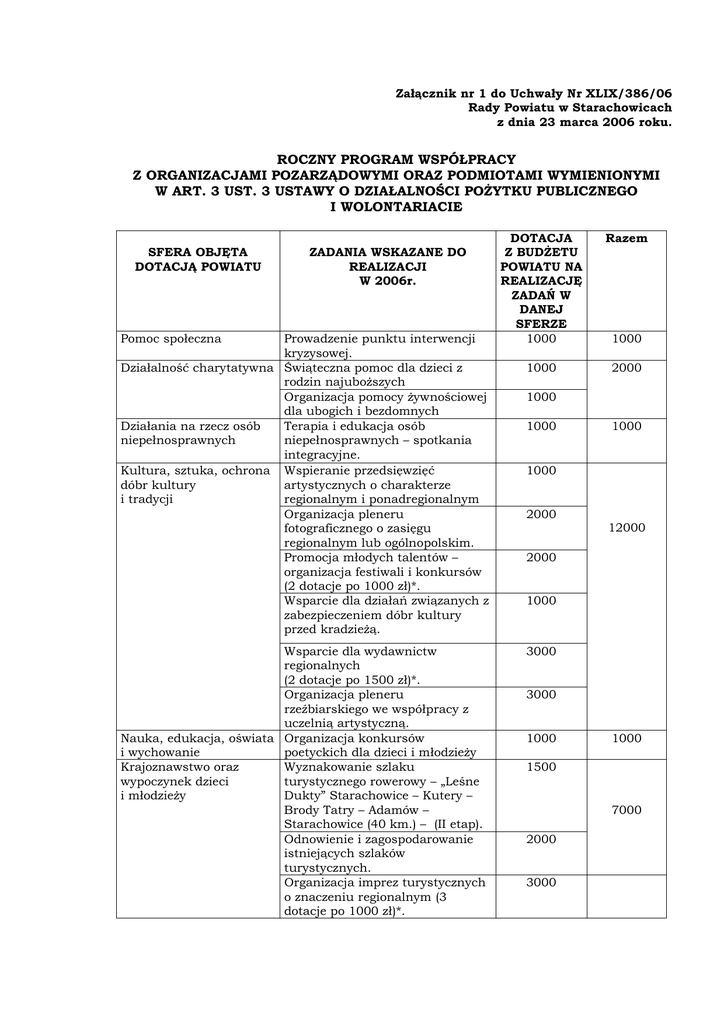 Załącznik nr 1 do Uchwały Nr XLIX/386/06 Rady Powiatu w Starachowicach z dnia 23 marca 2006 roku. ROCZNY PROGRAM WSPÓŁPRACY Z ORGANIZACJAMI POZARZĄDOWYMI ORAZ PODMIOTAMI WYMIENIONYMI W ART. 3 UST. 3 USTAWY O DZIAŁALNOŚCI POśYTKU PUBLICZNEGO I WOLONTARIACIE SFERA OBJĘTA DOTACJĄ POWIATU ZADANIA WSKAZANE DO REALIZACJI W 2006r. Pomoc społeczna Prowadzenie punktu interwencji kryzysowej. Działalność charytatywna Świąteczna pomoc dla dzieci z rodzin najuboŜszych Organizacja pomocy Ŝywnościowej dla ubogich i bezdomnych Działania na rzecz osób Terapia i edukacja osób niepełnosprawnych niepełnosprawnych – spotkania integracyjne. Kultura, sztuka, ochrona Wspieranie przedsięwzięć dóbr kultury artystycznych o charakterze i tradycji regionalnym i ponadregionalnym Organizacja pleneru fotograficznego o zasięgu regionalnym lub ogólnopolskim. Promocja młodych talentów – organizacja festiwali i konkursów (2 dotacje po 1000 zł)*. Wsparcie dla działań związanych z zabezpieczeniem dóbr kultury przed kradzieŜą. Wsparcie dla wydawnictw regionalnych (2 dotacje po 1500 zł)*. Organizacja pleneru rzeźbiarskiego we współpracy z uczelnią artystyczną. Nauka, edukacja, oświata Organizacja konkursów i wychowanie poetyckich dla dzieci i młodzieŜy Krajoznawstwo oraz Wyznakowanie szlaku wypoczynek dzieci turystycznego rowerowy – „Leśne i młodzieŜy Dukty” Starachowice – Kutery – Brody Tatry – Adamów – Starachowice (40 km.) – (II etap). Odnowienie i zagospodarowanie istniejących szlaków turystycznych. Organizacja imprez turystycznych o znaczeniu regionalnym (3 dotacje po 1000 zł)*. DOTACJA Z BUDśETU POWIATU NA REALIZACJĘ ZADAŃ W DANEJ SFERZE 1000 Razem 1000 2000 1000 1000 1000 1000 1000 2000 12000 2000 1000 3000 3000 1000 1000 1500 7000 2000 3000 Opracowanie i wyznakowanie szlaku spacerowego do dawnej kopalni Majówka Upowszechnianie kultury Upowszechnianie kultury fizycznej fizycznej i sportu poprzez organizację i sportu imprez sportowych i sportowo – rekreacyjnych dla dzieci, młodzieŜy i dorosłych (4 dotacje po 1000 zł)*. Prowadzenie zajęć sportowych z dziećmi i młodzieŜą w klubach sportowych (2 dotacje po 1500 zł)*. Organizacja masowych biegów przełajowych. Udział w krajowych i zagranicznych zawodach sportowych (2 dotacje po 1000 zł)*. Upowszechnianie wiedzy i Organizacja zajęć z młodzieŜą w umiejętności na rzecz klubach modelarskich obronności państwa (modelarstwo historyczno – militarne). Podtrzymywanie tradycji Przygotowanie programu słowno narodowych, muzycznego z okazji świąt pielęgnowanie polskości państwowych. oraz rozwój świadomości narodowej, obywatelskiej i kulturowej Działania na rzecz integracji europejskiej oraz rozwijania kontaktów i współpracy między społeczeństwami Promocja Powiatu Starachowickiego za granicą (2 dotacje po 1500 zł)*. RAZEM 500 4000 10000 3000 1000 2000 2000 2000 1000 1000 3000 3000 40000 40000 * - Dopuszcza się inny podział dotacji w ramach budŜetu przeznaczonego na realizację zadania. UZASADNIENIE Prowadzenie przez samorząd powiatowy działalności we współpracy z organizacjami pozarządowymi oraz podmiotami, o których mowa w art. 3 ust. 3 ustawy z dnia 24 kwietnia 2003r. o działalności poŜytku publicznego i o wolontariacie jest realizacją konstytucyjnej zasady pomocniczości, zgodnie z którą państwo i jego struktury powinno wykonywać tylko te zadania, które nie mogą być realizowane przez podmioty znajdujące się jak najbliŜej obywatela. Podmiotami znajdującymi się jak najbliŜej obywatela są przede wszystkim samorząd terytorialny i organizacje pozarządowe. Podmioty te stanowią podstawę współczesnego społeczeństwa. Obie te struktury łączy wspólny cel jakim jest zaspakajanie potrzeb mieszkańców. W świetle art. 5 ust. 1 ustawy z dnia 24 kwietnia 2003r. o działalności poŜytku publicznego i o wolontariacie „ Organy administracji publicznej prowadzą działalność w sferze zadań publicznych o której mowa w art. 4 tejŜe ustawy, we współpracy z organizacjami pozarządowymi oraz podmiotami wymienionymi w art. 3 ust. 3 prowadzącymi, odpowiednio do terytorialnego zakresu działania organów administracji publicznej działalność poŜytku publicznego w zakresie odpowiadającym zadaniom tych organów”. Działania organizacji pozarządowych stanowią istotne uzupełnienie działań Powiatu. ZauwaŜyć naleŜy, Ŝe organizacje te mogą mieć duŜy udział w rozwiązywaniu problemów społeczności lokalnej. Rada Powiatu Uchwałą Nr XXIV/197/04 z dnia 29 kwietnia 2004 r. określiła zasady współpracy z organizacjami pozarządowymi oraz podmiotami, o których mowa w art. 3 ust. 3 ustawy z dnia 24 kwietnia 2003 r. o działalności poŜytku publicznego i o wolontariacie. Zgodnie z przepisami § 5 tychŜe zasad Rada Powiatu określa uchwałą zadania do realizacji na dany rok budŜetowy w tzw. rocznym programie współpracy.