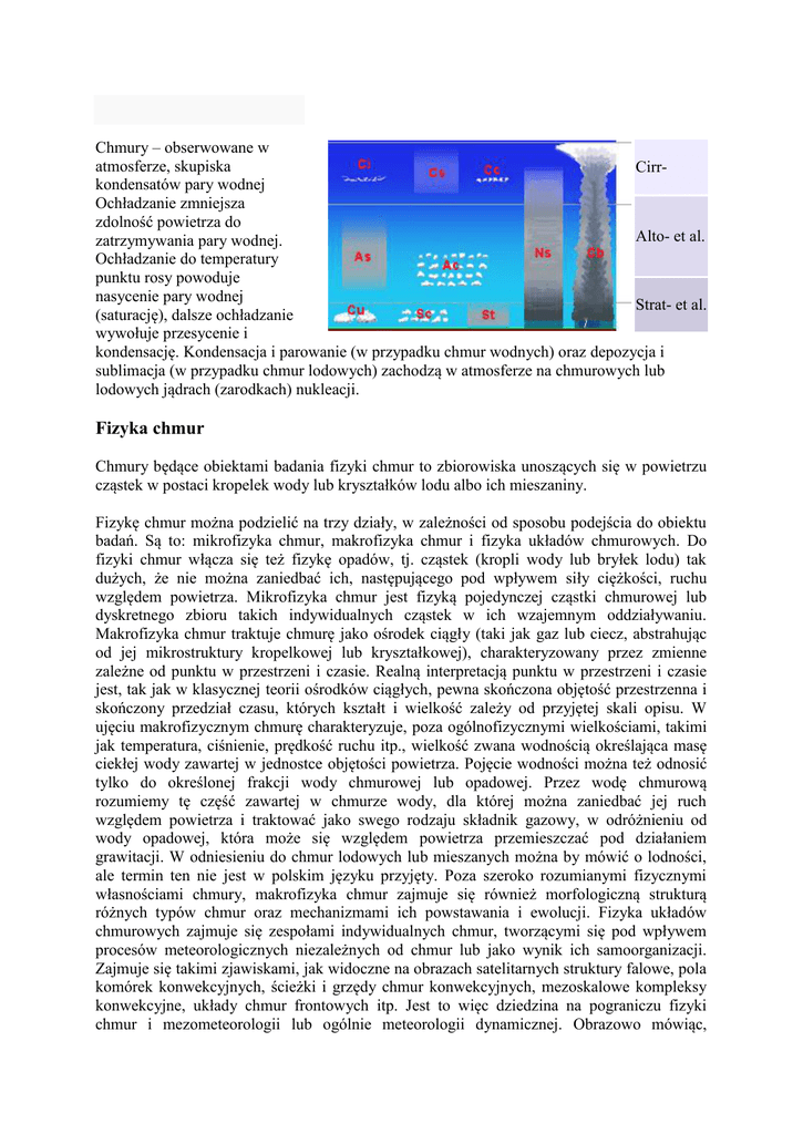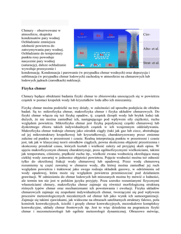 Chmury – obserwowane w atmosferze, skupiska Cirrkondensatów pary wodnej Ochładzanie zmniejsza zdolność powietrza do Alto- et al. zatrzymywania pary wodnej. Ochładzanie do temperatury punktu rosy powoduje nasycenie pary wodnej Strat- et al. (saturację), dalsze ochładzanie wywołuje przesycenie i kondensację. Kondensacja i parowanie (w przypadku chmur wodnych) oraz depozycja i sublimacja (w przypadku chmur lodowych) zachodzą w atmosferze na chmurowych lub lodowych jądrach (zarodkach) nukleacji. Fizyka chmur Chmury będące obiektami badania fizyki chmur to zbiorowiska unoszących się w powietrzu cząstek w postaci kropelek wody lub kryształków lodu albo ich mieszaniny. Fizykę chmur można podzielić na trzy działy, w zależności od sposobu podejścia do obiektu badań. Są to: mikrofizyka chmur, makrofizyka chmur i fizyka układów chmurowych. Do fizyki chmur włącza się też fizykę opadów, tj. cząstek (kropli wody lub bryłek lodu) tak dużych, że nie można zaniedbać ich, następującego pod wpływem siły ciężkości, ruchu względem powietrza. Mikrofizyka chmur jest fizyką pojedynczej cząstki chmurowej lub dyskretnego zbioru takich indywidualnych cząstek w ich wzajemnym oddziaływaniu. Makrofizyka chmur traktuje chmurę jako ośrodek ciągły (taki jak gaz lub ciecz, abstrahując od jej mikrostruktury kropelkowej lub kryształkowej), charakteryzowany przez zmienne zależne od punktu w przestrzeni i czasie. Realną interpretacją punktu w przestrzeni i czasie jest, tak jak w klasycznej teorii ośrodków ciągłych, pewna skończona objętość przestrzenna i skończony przedział czasu, których kształt i wielkość zależy od przyjętej skali opisu. W ujęciu makrofizycznym chmurę charakteryzuje, poza ogólnofizycznymi wielkościami, takimi jak temperatura, ciśnienie, prędkość ruchu itp., wielkość zwana wodnością określająca masę ciekłej wody zawartej w jednostce objętości powietrza. Pojęcie wodności można też odnosić tylko do określonej frakcji wody chmurowej lub opadowej. Przez wodę chmurową rozumiemy tę część zawartej w chmurze wody, dla której można zaniedbać jej ruch względem powietrza i traktować jako swego rodzaju składnik gazowy, w odróżnieniu od wody opadowej, która może się względem powietrza przemieszczać pod działaniem grawitacji. W odniesieniu do chmur lodowych lub mieszanych można by mówić o lodności, ale termin ten nie jest w polskim języku przyjęty. Poza szeroko rozumianymi fizycznymi własnościami chmury, makrofizyka chmur zajmuje się również morfologiczną strukturą różnych typów chmur oraz mechanizmami ich powstawania i ewolucji. Fizyka układów chmurowych zajmuje się zespołami indywidualnych chmur, tworzącymi się pod wpływem procesów meteorologicznych niezależnych od chmur lub jako wynik ich samoorganizacji. Zajmuje się takimi zjawiskami, jak widoczne na obrazach satelitarnych struktury falowe, pola komórek konwekcyjnych, ścieżki i grzędy chmur konwekcyjnych, mezoskalowe kompleksy konwekcyjne, układy chmur frontowych itp. Jest to więc dziedzina na pograniczu fizyki chmur i mezometeorologii lub ogólnie meteorologii dynamicznej. Obrazowo mówiąc, mikrofizyka chmur jest fizyką chmury widzianej przez mikroskop, makrofizyka – fizyką chmury oglądanej „nieuzbrojonym okiem” z powierzchni Ziemi lub pokładu samolotu, zaś fizyka układów chmurowych – fizyką chmur widzianych ze sztucznego satelity Ziemi lub na ekranie radaru. Typy chmur Podział chmur Chmury można podzielić na różne sposoby: ze względu na wysokość występowania na: o chmury wysokie, o chmury średnie, o chmury niskie, ze względu na kształt na: o chmury pierzaste, o chmury warstwowe, o chmury kłębiaste. ze względu na budowę wewnętrzną: o chmury o rozciągłości poziomej, o chmury rozbudowane w pionie (np. cumulus, cumulonimbus). ze względu na sposób powstania: o chmury falowe (np. stratus) o chmury konwekcyjne (np. cumulus) o chmury frontowe (np. altostratus) Wysokie o Cirrus — chmury pierzaste o Cirrostratus — chmura pierzasto-warstwowa o Cirrocumulus — chmury pierzasto-kłębiaste, tzw. „baranki”, jeden z rodzajów chmur lodowych Średnie o Altostratus — chmura średnia warstwowa, o mieszanym składzie Altocumulus — chmury średnie kłębiaste o Altocumulus lenticularis — chmura średnia kłębiasta soczewkowata (lub o kształcie wrzecionowatym), składająca się z przechłodzonej wody Niskie o Stratocumulus — chmura kłębiasto-warstwowa — chmura piętra niskiego, zbudowana z kropelek wody o Stratus, łac. 'rozciągnięty' — chmura warstwowa, w przypadku dużej grubości dająca gęstą, szarą okrywę, może obniżyć się do podłoża atmosfery jako mgła Niskie z pewnymi cechami budowy pionowej o Nimbostratus — chmura deszczowa bądź śniegowa — dość ciemna, gęsta chmura o składzie mieszanym, o rozciągłości nieraz dziesiątków kilometrów o Cumulus - chmura kłębiasta - chmura piętra niskiego z płaską podstawą, wypiętrzająca się w górę w wyniku ruchów konwekcyjnych Cumulus fractus — chmura kłębiasta powstała w wyniku rozpadu innego cumulusa Cumulus humilis — chmura kłębiasta pięknej pogody, gatunek o stosunkowo płaskiej górnej powierzchni, większej szerokości niż wysokości Cumulus medicoris — chmura kłębiasta średniej wielkości z szarą podstawą, może powodować przelotne opady o niskiej intensywności Niskie o wyraźnych cechach budowy pionowej o o Cumulus - chmura kłębiasta Cumulus congestus — chmura kłębiasta wyraźnie wypiętrzona z szarą podstawą, może powodować przelotne opady o zwiększonej intensywności Cumulonimbus — chmura kłębiasto-deszczowa, która może przekształcić się w gatunek chmury burzowej, a wtedy posiada w górnej części kowadło (łac. incus), zbudowane z kryształków lodu Znanych jest wiele rozmaitych odmian podstawowych rodzajów chmur. Odmiany te zostały sk