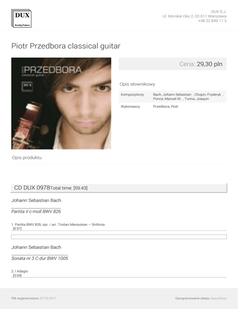 DUX S.J. Ul. Morskie Oko 2, 02-511 Warszawa +48 22 849 11 3 Piotr Przedbora classical guitar Cena: 29,30 pln Opis słownikowy Kompozytorzy Bach, Johann Sebastian ∎, Chopin, Fryderyk ∎, Ponce, Manuel M. ∎, Turina, Joaquin ∎ Wykonawcy Przedbora, Piotr ∎ Opis produktu CD DUX 0978Total time: [59:43] Johann Sebastian Bach Partita II c-moll BWV 826 1. Partita BWV 826, opr. / arr. Tristan Manoukian – Sinfonia [5:57] Johann Sebastian Bach Sonata nr 3 C-dur BWV 1005 2. I Adagio [3:54] Plik wygenerowano: 07-03-2017 Oprogramowanie sklepu: AptusShop DUX S.J. Ul. Morskie Oko 2, 02-511 Warszawa +48 22 849 11 3 3. II Fuga [9:23] 4. III Largo [3:01] 5. IV Allegro assai [5:26] Fryderyk Chopin Preludium Des-dur op. 28 nr 15 „Deszczowe” 6. Prelude Op. 28 No. 15 [6:24] Manuel M. Ponce Romantic Sonata in memoriam Franz Schubert 7. I Allegro moderato [7:00] 8. II Andante espressivo [4:43] 9. III Allegretto vivo [3:28] 10. IV Allegro non troppo serioso [6:17] Joaquin Turina Homenaje a Tarrega 11. I Garrotin [2:11] Plik wygenerowano: 07-03-2017 Oprogramowanie sklepu: AptusShop DUX S.J. Ul. Morskie Oko 2, 02-511 Warszawa +48 22 849 11 3 12. II Soleares [1:56] Wykonawcy: Piotr Przedbora /gitara/ Plik wygenerowano: 07-03-2017 Powered by TCPDF (www.tcpdf.org) Oprogramowanie sklepu: AptusShop