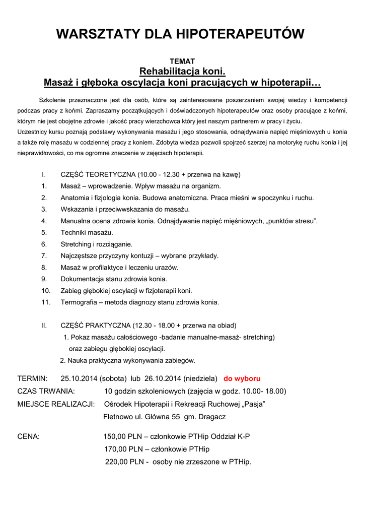 WARSZTATY DLA HIPOTERAPEUTÓW TEMAT Rehabilitacja koni. Masaż i głęboka oscylacja koni pracujących w hipoterapii… Szkolenie przeznaczone jest dla osób, które są zainteresowane poszerzaniem swojej wiedzy i kompetencji podczas pracy z końmi. Zapraszamy początkujących i doświadczonych hipoterapeutów oraz osoby pracujące z końmi, którym nie jest obojętne zdrowie i jakość pracy wierzchowca który jest naszym partnerem w pracy i życiu. Uczestnicy kursu poznają podstawy wykonywania masażu i jego stosowania, odnajdywania napięć mięśniowych u konia a także rolę masażu w codziennej pracy z koniem. Zdobyta wiedza pozwoli spojrzeć szerzej na motorykę ruchu konia i jej nieprawidłowości, co ma ogromne znaczenie w zajęciach hipoterapii. I. CZĘŚĆ TEORETYCZNA (10.00 - 12.30 + przerwa na kawę) 1. Masaż – wprowadzenie. Wpływ masażu na organizm. 2. Anatomia i fizjologia konia. Budowa anatomiczna. Praca mieśni w spoczynku i ruchu. 3. Wskazania i przeciwwskazania do masażu. 4. Manualna ocena zdrowia konia. Odnajdywanie napięć mięśniowych, „punktów stresu”. 5. Techniki masażu. 6. Stretching i rozciąganie. 7. Najczęstsze przyczyny kontuzji – wybrane przykłady. 8. Masaż w profilaktyce i leczeniu urazów. 9. Dokumentacja stanu zdrowia konia. 10. Zabieg głębokiej oscylacji w fizjoterapii koni. 11. Termografia – metoda diagnozy stanu zdrowia konia. II. CZĘŚĆ PRAKTYCZNA (12.30 - 18.00 + przerwa na obiad) 1. Pokaz masażu całościowego -badanie manualne-masaż- stretching) oraz zabiegu głębokiej oscylacji. 2. Nauka praktyczna wykonywania zabiegów. TERMIN: 25.10.2014 (sobota) lub 26.10.2014 (niedziela) do wyboru CZAS TRWANIA: 10 godzin szkoleniowych (zajęcia w godz. 10.00- 18.00) MIEJSCE REALIZACJI: Ośrodek Hipoterapii i Rekreacji Ruchowej „Pasja” Fletnowo ul. Główna 55 gm. Dragacz CENA: 150,00 PLN – członkowie PTHip Oddział K-P 170,00 PLN – członkowie PTHip 220,00 PLN - osoby nie zrzeszone w PTHip. - 2 PATRONAT SZKOLENIA: Oddział Kujawsko-Pomorski PTHip - Małgorzata Górniewicz ORGANIZATOR: Agnieszka Kuźnik-Królikowska tel. 509-152-401 PROWADZĄCY: DOROTA POLEWSKA fizjoterapeuta, terapeuta masażysta koni, specjalista zabiegów głębokiej oscylacji na koniach. Doświadczenie i wiedzę zdobywała pracując z końmi sportowymi i rekreacyjnymi w Anglii. ZGŁOSZENIE OSOBY NA SZKOLENIE: Rehabilitacja koni. Masaż i głęboka oscylacja koni pracujących w hipoterapii… 25.10.2014 (sobota) zajęcia w godz. 10.00 - 18.00 26.10.2014 (niedziela) zajęcia w godz. 10.00 – 18.00 (proszę wybrać jeden dogodny termin) 1. Imię i nazwisko 2. E-mail 3. Telefon kontaktowy 4. Wykształcenie / zawód wyuczony 5. Rok ukończenia kursu instruktora rekreacji ruchowej ze specjalnością hipoterapia 6. Nazwa organizatora kursu wymienionego w pkt 5 7. Nazwa reprezentowanego ośrodka / miejsce wykonywania zadań hipoterapeuty 8. Staż pracy w charakterze hipoterapeuty 9. Dane do rachunku: Nazwa firmy lub imię i nazwisko Adres (siedziba) Nr identyfikacyjny NIP 10. Informacja o przynależności do PTHip TAK NIE* niepotrzebne skreślić Płatności proszę dokonywać na konto Ośrodka „Pasja” WBK 58-1090-1678-0000-0001-1687-8417 Z dopiskiem - warsztaty - imię i nazwisko Warunkiem rezerwacji miejsca jest przesłanie formularza zgłoszeniowego na adres: [email protected] oraz uiszczenie opłaty.Liczba miejsc ograniczona, o przyjęciu na warsztaty decyduje kolejność zgłoszeń. Serdecznie zapraszamy do udziału w warsztatach!