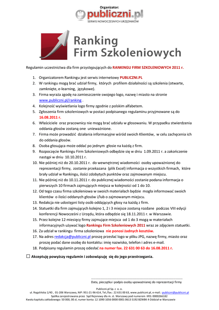 Organizator: Regulamin uczestnictwa dla firm przystępujących do RANKINGU FIRM SZKOLENIOWYCH 2011 r. 1. Organizatorem Rankingu jest serwis internetowy PUBLICZNI.PL 2. W rankingu mogą brać udział firmy, których profilem działalności są szkolenia (otwarte, zamknięte, e-learning, językowe). 3. Firma wyraża zgodę na zamieszczenie swojego logo, nazwę i miasto na stronie www.publiczni.pl/ranking . 4. Kolejność wyświetlania logo firmy zgodnie z polskim alfabetem. 5. Zgłoszenia firm szkoleniowych w postaci podpisanego regulaminu przyjmowane są do 16.08.2011 r. 6. Właściciele oraz pracownicy nie mogą brać udziału w głosowaniu. W przypadku stwierdzenia oddania głosów zostaną one unieważnione. 7. Firma może prowadzić działania informacyjne wśród swoich Klientów, w celu zachęcenia ich do oddania głosów. 8. Osoba głosująca może oddać po jednym głosie na każdą z firm. 9. Rozpoczęcie Rankingu Firm Szkoleniowych odbędzie się w dniu 1.09.2011 r. a zakończenie nastąpi w dniu 10.10.2011 r. 10. Nie później niż do 20.10.2011 r. do wewnętrznej wiadomości osoby upoważnionej do reprezentacji firmy, zostanie przekazana (plik Excel) informacja o wszystkich firmach, które brały udział w Rankingu, ilości zdobytych punktów oraz zajmowanym miejscu. 11. Nie później niż do 10.11.2011 r. do publicznej wiadomości zostanie podana informacja o pierwszych 10 firmach zajmujących miejsca w kolejności od 1 do 10. 12. Od tego czasu firma szkoleniowa w swoich materiałach będzie mogła informować swoich klientów o ilości oddanych głosów i/lub o zajmowanym miejscu. 13. Redakcja nie udostępni listy osób oddających głosy na każdą z firm. 14. Statuetki dla firm zajmujących kolejno 1, 2 i 3 miejsce zostaną rozdane podczas VIII edycji konferencji Nowocześni z Urzędu, która odbędzie się 18.11.2011 r. w Warszawie. 15. Przez kolejne 12 miesięcy firmy zajmujące miejsca od 1 do 3 mogą w materiałach informacyjnych używać logo Rankingu Firm Szkoleniowych 2011 wraz ze zdjęciem statuetki. 16. Za udział w rankingu firma szkoleniowa nie ponosi żadnych kosztów. 17. Na adres [email protected] proszę przesłać logo w pliku JPG, nazwę firmy, miasto oraz proszę podać dane osobę do kontaktu: imię nazwisko, telefon i adres e-mail. 18. Podpisany regulamin proszę odesłać na numer fax. 22 631 00 63 do 16.08.2011 r. □ Akceptuję powyższy regulamin i zobowiązuję się do jego przestrzegania. ………………………………………………………………………………………………………… Data, pieczątka i podpis osoby upoważnianej do reprezentacji firmy Publiczni.pl Sp. z o. o. ul. Rogalińska 1/40 , 01-206 Warszawa, NIP: 951-21-96-614, Tel./fax.: 22 631 00 63, www.publiczni.pl, e-mail.: [email protected] Spółka zarejestrowana przez Sąd Rejonowy dla m. st. Warszawy pod numerem KRS: 0000266182 Kwota kapitału zakładowego: 50 000, 00 zł, numer konta: 12 1090 1056 0000 0001 0613 5192 BZWBK 4 Oddział w Warszawie