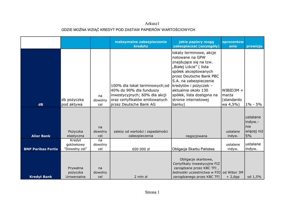 Arkusz1 GDZIE MOŻNA WZIĄĆ KREDYT POD ZASTAW PAPIERÓW WARTOŚCIOWYCH maksymalne zabezpieczenie kredytu dB Alior Bank BNP Paribas Fortis Kredyt Bank db pożyczka pod aktywa Pożyczka elastyczna Kredyt gotówkowy "Dowolny cel" Prywatna pożyczka Uniwersalna na dowolny cel na dowolny cel na dowolny cel na dowolny cel jakie papiery mogą oprocentow zabezpieczać (szczegóły) anie prowizja lokaty terminowe, akcje notowane na GPW znajdujące się na tzw. „Białej Liście” ( lista spółek akceptowanych przez Deutsche Bank PBC S.A. na zabezpieczenie 100% dla lokat terminowych;od kredytów i pożyczek – 40% do 90% dla funduszy aktualnie około 130 inwestycyjnych; 60% dla akcji spółek, lista dostępna na oraz certyfikatów emitowanych stronie internetowej przez Deutsche Bank AG banku) zależy od wartości i zapadalności zabezpieczenia 600 000 zł 2 mln zł Strona 1 negocjowana Obligacje Skarbu Państwa WIBID3M + marża (standardo wa 4,5%) 1% - 5% ustalane indyw. ustalane indyw.nie więcej niż 5% ustalane indyw. ustalane indyw. Obligacje skarbowe, Certyfikaty inwestycyjne FIZ zarządzane przez KBC TFI , Jednostki uczestnictwa w FIO od Wibor 3M zarządzanego przez KBC TFI + 2,6pp od 1,5% Arkusz1 Invest-bank BPH PKO BP BNP Paribas Fortis Nordea Bank Kredyt gotówkowy Kredyt Gotówkowy zabezpieczony aktywami finansowymi Kredyt gotówkowy Aurum lub Platinium Kredyt gotówkowy "Dowolny cel" na dowolny cel na dowolny cel na dowolny cel na dowolny cel na dowolny cel lub zakup Kredyt Nordea Polisa funduszy 150% 10 mln zł ustalane indyw. 600 000 zł 2,5 mln zł - do 120% wartości portfela Strona 2 papiery wartościowe emitowane przez Skarb Państwa i NBP, akcje notowane na GPW, jednostki uczestnictwa TFI obligacje skarbowe od 12,9% 0,5%-5% WIBOR/LIB OR 3M +marża od 4% od 1,5% ustalane indyw. ustalane indyw. ustalane indyw. Obligacje Skarbu Państwa ustalane indyw. ustalane indyw. 1) "kredyt pod polisę":max 50% polisy Nordea Inwestor, max 70% polisy Inwestor Bezpiecznego Inwestowania, max 90% składki Nordea Profit Plus; "kredyt na zakup funduszy"; max 250% polisy Nordea Program Bezpiecznego Inwestowania, WIBOR max 100% wartości składki 1M+ marża Nordea Inwestor od 0,2% 0-0,5%