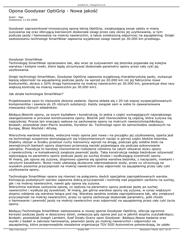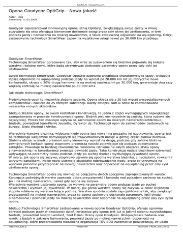 AutoRok.PL / DesignForum.PL Opona Goodyear OptiGrip - Nowa jakość Autor: Aga Zmieniony 11.03.2009. Goodyear zaprezentował innowacyjną oponę letnią OptiGrip, zwiększającą swoje zalety w miarę zużywania się oraz oferującą kierowcom doskonale osiagi przez caly okres jej uzytkowania, w tym podczas jazdy i hamowania na mokrej nawierzchni, a takze zwiekszoną odpornosc na aquaplaning. Dzięki zastosowaniu technologii SmartWear zapewnia wyjatkowe osiagi nawet po 30.000 km przebiegu. Goodyear SmartWear Technologię SmartWear opracowano tak, aby wraz ze zużywaniem się bieżnika pojawiała się kolejna warstwa i kolejne rowki, które będą utrzymywać doskonałe parametry opony przez cały cykl jej użytkowania. Dzięki technologii SmartWear, Goodyear OptiGrip zapewnia wyjątkową charakterystykę jazdy, wykazuje lepszą odporność na aquaplaning podczas jazdy na wprost po 20.000 km niż jej fabrycznie nowe konkurentki, skraca o 20% drogę hamowania na mokrej nawierzchni po 30.000 km, gwarantuje dwa razy większą kontrolę na mokrej nawierzchni po 30.000 km1. Jak działa technologia SmartWear? Projektowanie opon to niezwykle złożone zadanie. Opona składa się z 20 lub więcej wyspecjalizowanych komponentów i zawiera do 25 różnych substancji. Każdy związek sam w sobie to zaawansowana mieszanka różnych składników. „Bieżnik opony, ze swym kształtem i konstrukcją, to jedna z części wymagających największego zaangażowania w procesie konstruowania opony. Bieżnik jest równocześnie tą częścią, która zużywa się najszybciej. Proces ten znacząco wpływa na zachowanie opony na mokrych nawierzchniach” – powiedział Jean-Pierre Jeusette, Dyrektor ds. Technologii opon do samochodów osobowych na Europę, Bliski Wschód i Afrykę. Wierzchnia warstwa bieżnika, widoczna kiedy opona jest nowa i na początku jej użytkowania, oparta jest na technologii wzajemnie domykających się trójwymiarowych nacięć w górnej części bloków bieżnika. Stabilny obszar w środku przenosi ruchy kierownicy wprost na drogę, podczas gdy solidne bloki na zewnętrznych barkach opony stopniowo przenoszą naciski pojawiające się podczas pokonywania zakrętów. Powoduje to bardziej równomierne rozłożenie ciśnienia na całym obszarze styku opony z nawierzchnią i w konsekwencji zwiększa pewność jazdy. Taka konstrukcja nadaje bieżnikowi sztywność wpływającą na parametry opony podczas jazdy po suchej drodze i wydłużającą żywotność opony. W miarę, jak opona się zużywa, stopniowo ujawnia się spodnia warstwa bieżnika, z nacięciami, rowkami i ukrytymi kanalikami. Nowe rowki ułatwiają skuteczne odprowadzanie wody, przez co utrzymują na wysokim poziomie przyczepność na mokrej nawierzchni oraz odporność na aquaplaning przez cały cykl użytkowania opony. Technologia SmartWear opiera się również na połączeniu dwóch specjalnie zaprojektowanych warstw. Koncepcja podwójnych warstw zapewnia dobrą przyczepność i kontrolę nad pojazdem zarówno na suchej, jak i na mokrej nawierzchni, nawet gdy opona się zużywa. Wierzchnia warstwa usztywnia oponę, co wpływa na parametry opony podczas jazdy po suchej nawierzchni i wydłuża jej żywotność. W miarę, jak górna warstwa opony się zużywa, w coraz większym stopniu odsłania się warstwa leżąca pod nią. Warstwa spodnia została zaprojektowana tak, aby zwiększyć przyczepność na mokrej nawierzchni, przez co opona zachowuje doskonałe parametry, jeśli chodzi o hamowanie i pewność jazdy na mokrej nawierzchni oraz odporność na aquaplaning przez cały cykl życia opony. „Technologia SmartWear zastosowana w nowej oponie Goodyear OptiGrip, oferuje ogromne korzyści podczas jazdy w deszczowy dzień, zwłaszcza gdy opona jest już w jakimś stopniu zużyta” – powiedział Joseph Lambert, Szef Działu Oceny opon Goodyear. „Nasze badania oraz wyniki z badań w zakresie hamowania, pewności jazdy po mokrej nawierzchni i odporności na aquaplaning, które przeprowadziła niezależna organizacja TÜV SÜD Automotive potwierdzają, że udało http://mas.auto.pl Kreator PDF Utworzono 7 March, 2017, 02:10 AutoRok.PL / DesignForum.PL nam się opracować zupełnie innowacyjną technologię, dzięki której mogliśmy stworzyć bardzo wytrzymałą oponę, oferującą doskonałe parametry po 20.000, a nawet 30.000 kilometrów” – dodał Joseph Lambert. TÜV SÜD ocenia: Goodyear OptiGrip zapewnia krótszą drogę hamowania po 30.000 km Dzięki ponad trzydziestoletniemu doświadczeniu TÜV SÜD Automotive zyskał sobie miano uznanej, niezależnej instytucji w branży w dziedzinie certyfikacji oraz badań opon i kół. Po przeprowadzeniu testów jakości i parametrów, nowa letnia opona Goodyear OptiGrip zyskała aprobatę tej organizacji. Nowa opona oferuje znacznie lepsze parametry w porównaniu ze swoimi konkurentkami w testach mierzących odporność na aquaplaning oraz pewność jazdy i hamowanie na mokrej nawierzchni z wykorzystaniem opon nowych oraz tych z przebiegiem 20.000 i 30.000 kilometrów. „To zdumiewające wyniki. Droga hamowania w przypadku Goodyear OptiGrip jest – nawet po dwóch latach i 30.000 km – nadal tak samo dobra, jak była w przypadku najlepszej konkurentki, kiedy ta była fabrycznie nowa” – powiedział Jean-Pierre Jeusette, Dyrektor ds. Technologii opon do samochodów osobowych na Europę, Bliski Wschód i Afrykę. „Koncentrujemy się na tworzeniu opon o doskonałych parametrach bezpieczeństwa, takich jak hamowanie i pewność jazdy, szczególnie gdy dotyczy to jazdy w deszczu lub po mokrej nawierzchni. Dzięki naszej innowacyjnej technologii SmartWear, opona Goodyear OptiGrip wykazuje niezrównane parametry w zakresie pewności jazdy i hamowania na mokrej nawierzchni przez cały czas jej użytkowania, bez skracania żywotności opony, czy uszczerbku dla innych ważnych parametrów” – dodał Jean-Pierre Jeusette. Bezpieczeństwo: jedna z najważniejszych kwes