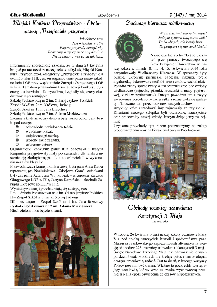Głos Siódemki 9 (147) / maj 2014 EkoSiódemka ________________________________________________________________________________________________________________________________________________________________________________________________________________________________________________________________________________________________________________________________________________________________________________________________________________________________________________________________ Miejski Konkurs Przyrodniczo - Ekologiczny „Przyjaciele przyrody” Jak dobrze nam Jest mieszkać w Pile Piękną przyrodą cieszyć się. Będziemy wszyscy strzec jej dzielnie Niech każdy z was czyni tak też… Informujemy społeczność szkolną, że w dniu 23 kwietnia br., już po raz trzeci w naszej szkole odbył się Miejski Konkurs Przyrodniczo-Ekologiczny „Przyjaciele Przyrody” dla uczniów klas I-III. Jest on organizowany przez nasze szkolne koła LOP przy współudziale Zarządu Okręgowego LOP w Pile. Tematem przewodnim trzeciej edycji konkursu była energia odnawialna. Do rywalizacji zgłosiły się cztery ekodrużyny reprezentujące: Szkołę Podstawową nr 2 im. Olimpijczyków Polskich Zespół Szkół nr 2 im. Królowej Jadwigi Zespół Szkół nr 1 im. Jana Brzechwy Szkołę Podstawową nr 7 im. Adama Mickiewicza Zadania i kryteria oceny drużyn były różnorodne. Jury brało pod uwagę: odpowiedzi udzielone w teście. wykonany plakat, zaśpiewaną piosenkę, ułożone dwie zagadki, uzbierane baterie Organizatorki konkursu: panie Rita Sadowska i Justyna Karpińska przygotowały mały poczęstunek i dla relaksu inscenizację ekologiczną pt. „List do człowieka” w wykonaniu uczniów klasy I c. Przewodniczącą komisji konkursowej była pani Anna Kałka reprezentująca Nadleśnictwo „Zdrojowa Góra”, członkami były zaś panie Katarzyna Wojtkowiak – wiceprezes Zarządu Okręgowego LOP w Pile, Justyna Karpińska – skarbnik Zarządu Okręgowego LOP w Pile. Wyniki rywalizacji przedstawiają się następująco: I m. – Szkoła Podstawowa nr 2 im. Olimpijczyków Polskich II – Zespół Szkół nr 2 im. Królowej Jadwigi III – ex aequo – Zespół Szkół nr 1 im. Jana Brzechwy i Szkoła Podstawowa nr 7 im. Adama Mickiewicza. Niech zielona moc będzie z nami. Zuchowy kiermasz wielkanocny Wielu ludzi – tylko jedna myśl! Jednym rytmem biją serca dziś! Dużo obcych, ale każdy brat … Tu połączył się harcerski świat Nasze dzielne zuchy ”Leśne Skrzaty” przy pomocy tworzącego się Koła Przyjaciół Harcerstwa w naszej szkole w dniach 10, 11, 14, 15, 16 kwietnia 2014 roku zorganizowały Wielkanocny Kiermasz. W sprzedaży były pyszne, lukrowane pierniczki, babeczki, mazurki, torcik z galaretką, dekorowane mufinki oraz sernik w czekoladzie. Ponadto zuchy sprzedawały własnoręcznie zrobione ozdoby wielkanocne (zajączki, pisanki, kraszanki z masy papierowej, kurki w wytłaczanek). Dużym powodzeniem cieszyły się również porcelanowe zwierzątka i różne ciekawe gadżety ofiarowane nam przez rodziców naszych zuchów. Artykuły, które sprzedawaliśmy zajmowały aż trzy stoliki. Klientami naszego sklepiku byli uczniowie, nauczyciele oraz pracownicy naszej szkoły, którym dziękujemy za hojność. Uzyskane przychody tym razem przeznaczymy na zakup proporca-totemu oraz na biwak zuchowy w Próchnówku. ```````````````````````````````````````````````````````````````````````` Obchody rocznicy uchwalenia Konstytucji 3 Maja na wesoło W sobotę, 26 kwietnia w auli naszej szkoły uczniowie klasy V a pod opieką nauczyciela historii i społeczeństwa pana Mariusza Frankowskiego zaprezentowali alternatywną wersję obchodów 223. rocznicy uchwalenia Konstytucji 3 maja. Święto Narodowe Trzeciego Maja jest jednym z nielicznych polskich świąt, w których nie króluje patos i martyrologia, a wręcz przeciwnie, radość. Jest to dzień, z którego wszyscy Polacy powinni być dumni. Właśnie to podkreślili występujący uczniowie, którzy wraz ze swoim wychowawcą przenieśli realia epoki oświecenia do czasów współczesnych. ________________________________________________________________________________________________________________________________________________________________________________________________________________________________________________________________________________________________________________________________________________________________________________________________________________________________________________________________________________________________________________________________________________________________________________ 7