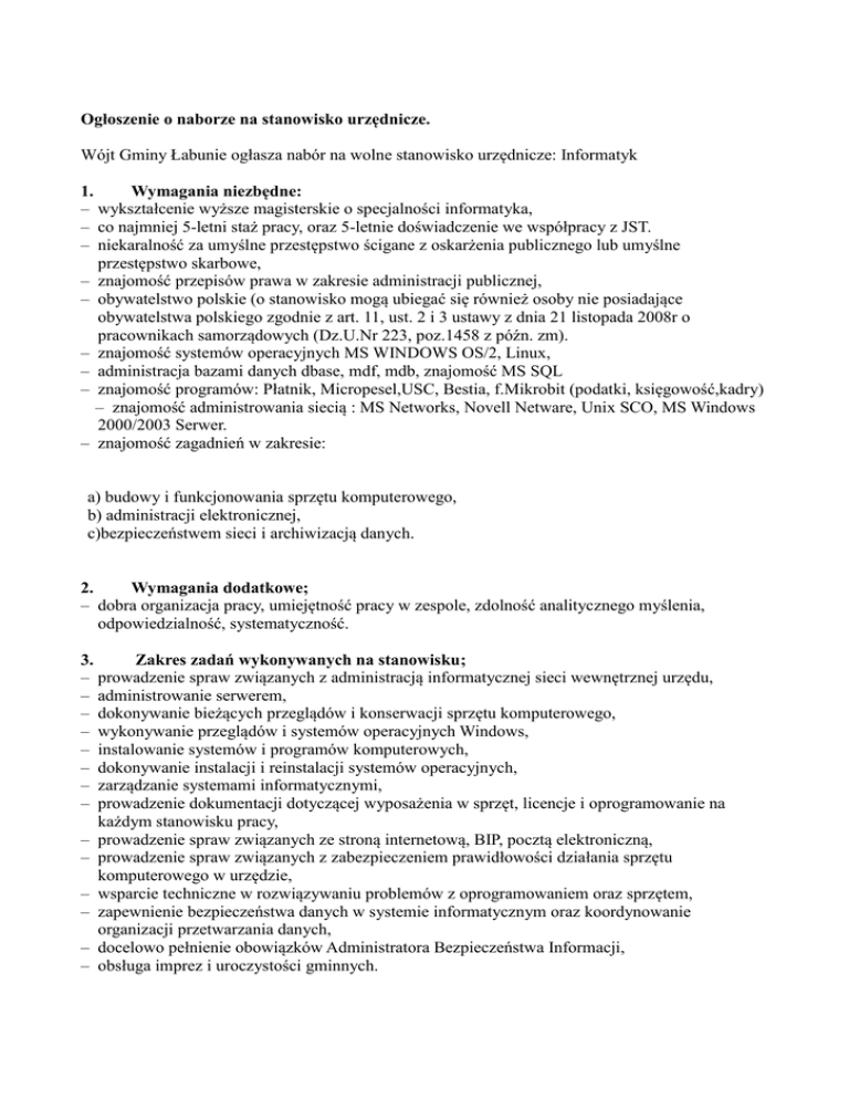 Ogłoszenie o naborze na stanowisko urzędnicze. Wójt Gminy Łabunie ogłasza nabór na wolne stanowisko urzędnicze: Informatyk 1. Wymagania niezbędne: – wykształcenie wyższe magisterskie o specjalności informatyka, – co najmniej 5-letni staż pracy, oraz 5-letnie doświadczenie we współpracy z JST. – niekaralność za umyślne przestępstwo ścigane z oskarżenia publicznego lub umyślne przestępstwo skarbowe, – znajomość przepisów prawa w zakresie administracji publicznej, – obywatelstwo polskie (o stanowisko mogą ubiegać się również osoby nie posiadające obywatelstwa polskiego zgodnie z art. 11, ust. 2 i 3 ustawy z dnia 21 listopada 2008r o pracownikach samorządowych (Dz.U.Nr 223, poz.1458 z późn. zm). – znajomość systemów operacyjnych MS WINDOWS OS/2, Linux, – administracja bazami danych dbase, mdf, mdb, znajomość MS SQL – znajomość programów: Płatnik, Micropesel,USC, Bestia, f.Mikrobit (podatki, księgowość,kadry) – znajomość administrowania siecią : MS Networks, Novell Netware, Unix SCO, MS Windows 2000/2003 Serwer. – znajomość zagadnień w zakresie: a) budowy i funkcjonowania sprzętu komputerowego, b) administracji elektronicznej, c)bezpieczeństwem sieci i archiwizacją danych. 2. Wymagania dodatkowe; – dobra organizacja pracy, umiejętność pracy w zespole, zdolność analitycznego myślenia, odpowiedzialność, systematyczność. 3. Zakres zadań wykonywanych na stanowisku; – prowadzenie spraw związanych z administracją informatycznej sieci wewnętrznej urzędu, – administrowanie serwerem, – dokonywanie bieżących przeglądów i konserwacji sprzętu komputerowego, – wykonywanie przeglądów i systemów operacyjnych Windows, – instalowanie systemów i programów komputerowych, – dokonywanie instalacji i reinstalacji systemów operacyjnych, – zarządzanie systemami informatycznymi, – prowadzenie dokumentacji dotyczącej wyposażenia w sprzęt, licencje i oprogramowanie na każdym stanowisku pracy, – prowadzenie spraw związanych ze stroną internetową, BIP, pocztą elektroniczną, – prowadzenie spraw związanych z zabezpieczeniem prawidłowości działania sprzętu komputerowego w urzędzie, – wsparcie techniczne w rozwiązywaniu problemów z oprogramowaniem oraz sprzętem, – zapewnienie bezpieczeństwa danych w systemie informatycznym oraz koordynowanie organizacji przetwarzania danych, – docelowo pełnienie obowiązków Administratora Bezpieczeństwa Informacji, – obsługa imprez i uroczystości gminnych. 4. Informacja o warunkach pracy na stanowisku: Zatrudnienie – pełny etat od 01-01-2013r Miejsce pracy: praca w budynku Urzędu Gminy. Stanowisko pracy: stanowisko pracy związane jest z pracą przy komputerze oraz z przemieszczaniem się w terenie. 5. Wskaźnik zatrudnienia osób niepełnosprawnych: W miesiącu poprzedzającym datę upublicznienia ogłoszenia wskaźnik zatrudnienia osób niepełnosprawnych w Urzędzie Gminy w rozumieniu przepisów o rehabilitacji zawodowej i społecznej oraz zatrudnianiu osób niepełnosprawnych, jest niższy niż 6 %. 6. Wymagane dokumenty: – kwestionariusz osobowy dla osoby ubiegającej się o zatrudnienie, – życiorys zawodowy (CV) – dokumenty potwierdzające wykształcenie, – dokumenty potwierdzające kwalifikacje, – oświadczenie o niekaralności za umyślne przestępstwa ścigane z oskarżenia publicznego lub umyślne przestępstwa skarbowe, – oświadczenie o pełnej zdolności do czynności prawnych oraz o korzystaniu w pełni z praw publicznych, – oświadczenie o wyrażeniu zgody na przetwarzanie danych osobowych. 7. Termin i miejsce składania wymaganych dokumentów: Wymagane dokumenty należy składać osobiście do Urzędu Gminy, ul. Zamojska 50, 22-437 Łabunie w zaklejonej kopercie lub pocztą na adres j.w. z dopiskiem: „Nabór na stanowisko - Informatyk” w terminie od dnia ogłoszenia do dnia 07 grudnia 2012r do godz.15.00 (decyduje data i godzina wpływu dokumentów do Urzędu Gminy Łabunie ). Dokumenty, które wpłynęły do Urzędu Gminy po wyżej określonym terminie nie będą rozpatrywane. Informacja o wyniku naboru będzie umieszczona na stronie BIP Gminy Łabunie oraz na tablicy ogłoszeń w Urzędzie. Wójt Gminy /-/ Antoni Wojciech Turczyn