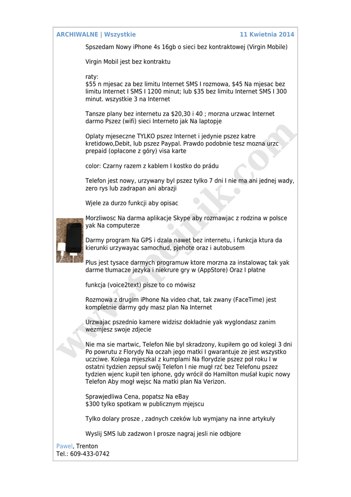 ARCHIWALNE | Wszystkie 11 Kwietnia 2014 Spszedam Nowy iPhone 4s 16gb o sieci bez kontraktowej (Virgin Mobile) Virgin Mobil jest bez kontraktu raty: $55 n mjesac za bez limitu Internet SMS I rozmowa, $45 Na mjesac bez limitu Internet I SMS I 1200 minut; lub $35 bez limitu Internet SMS I 300 minut. wszystkie 3 na Internet Tansze plany bez internetu za $20,30 i 40 ; morzna urzwac Internet darmo Pszez (wifi) sieci Interneto jak Na laptopje .c o m Oplaty mjeseczne TYLKO pszez Internet i jedynie pszez katre kretidowo,Debit, lub pszez Paypal. Prawdo podobnie tesz mozna urzc prepaid (opłacone z góry) visa karte color: Czarny razem z kablem I kostko do prádu jn ik Telefon jest nowy, urzywany byl pszez tylko 7 dni I nie ma ani jednej wady, zero rys lub zadrapan ani abrazji Wjele za durzo funkcji aby opisac Morzliwosc Na darma aplikacje Skype aby rozmawjac z rodzina w polsce yak Na computerze po Darmy program Na GPS i dzala nawet bez internetu, i funkcja ktura da kierunki urzywayac samochud, pjehote oraz i autobusem .s Plus jest tysace darmych programuw ktore morzna za instalowaç tak yak darme tłumacze jezyka i niekrure gry w (AppStore) Oraz I płatne funkcja (voice2text) pisze to co mówisz w w Rozmowa z drugim iPhone Na video chat, tak zwany (FaceTime) jest kompletnie darmy gdy masz plan Na Internet w Urzwajac pszednio kamere widzisz dokładnie yak wyglondasz zanim wezmjesz swoje zdjecie Nie ma sie martwic, Telefon Nie byl skradzony, kupiłem go od kolegi 3 dni Po powrutu z Florydy Na oczah jego matki I gwarantuje ze jest wszystko uczciwe. Kolega mjeszkal z kumplami Na florydzie pszez poł roku I w ostatni tydzien zepsuł swōj Telefon I nie mugł rzć bez Telefonu pszez tydzien wjenc kupił ten iphone, gdy wrócił do Hamilton muśał kupic nowy Telefon Aby mogł wejsc Na matki plan Na Verizon. Sprawjedliwa Cena, popatsz Na eBay $300 tylko spotkam w publicznym mjejscu Tylko dolary prosze , zadnych czeków lub wymjany na inne artykuły Wyslij SMS lub zadzwon I prosze nagraj jesli nie odbjore Pawel, Trenton Tel.: 609-433-0742