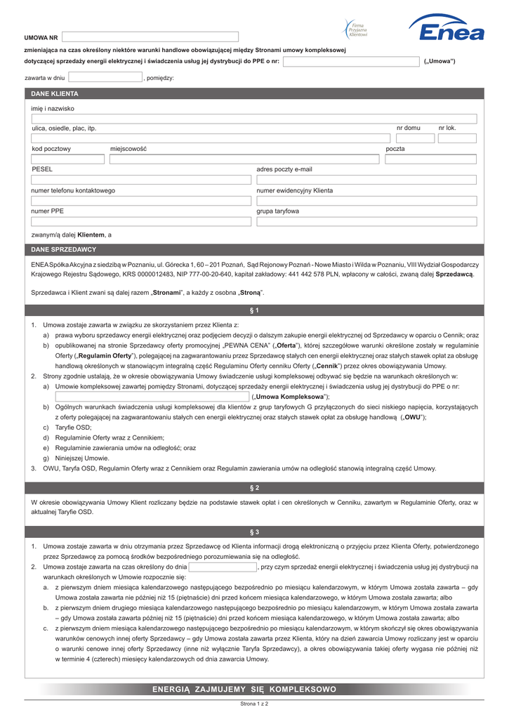 UMOWA NR zmieniająca na czas określony niektóre warunki handlowe obowiązującej między Stronami umowy kompleksowej dotyczącej sprzedaży energii elektrycznej i świadczenia usług jej dystrybucji do PPE o nr: („Umowa”) , pomiędzy: zawarta w dniu DANE KLIENTA imię i nazwisko nr domu ulica, osiedle, plac, itp. kod pocztowy miejscowość nr lok. poczta PESEL adres poczty e-mail numer telefonu kontaktowego numer ewidencyjny Klienta numer PPE grupa taryfowa zwanym/ą dalej Klientem, a DANE SPRZEDAWCY ENEA Spółka Akcyjna z siedzibą w Poznaniu, ul. Górecka 1, 60 – 201 Poznań, Sąd Rejonowy Poznań - Nowe Miasto i Wilda w Poznaniu, VIII Wydział Gospodarczy Krajowego Rejestru Sądowego, KRS 0000012483, NIP 777-00-20-640, kapitał zakładowy: 441 442 578 PLN, wpłacony w całości, zwaną dalej Sprzedawcą. Sprzedawca i Klient zwani są dalej razem „Stronami”, a każdy z osobna „Stroną”. §1 1. Umowa zostaje zawarta w związku ze skorzystaniem przez Klienta z: a) prawa wyboru sprzedawcy energii elektrycznej oraz podjęciem decyzji o dalszym zakupie energii elektrycznej od Sprzedawcy w oparciu o Cennik; oraz b) opublikowanej na stronie Sprzedawcy oferty promocyjnej „PEWNA CENA” („Oferta”), której szczegółowe warunki określone zostały w regulaminie Oferty („Regulamin Oferty”), polegającej na zagwarantowaniu przez Sprzedawcę stałych cen energii elektrycznej oraz stałych stawek opłat za obsługę handlową określonych w stanowiącym integralną część Regulaminu Oferty cenniku Oferty („Cennik”) przez okres obowiązywania Umowy. 2. Strony zgodnie ustalają, że w okresie obowiązywania Umowy świadczenie usługi kompleksowej odbywać się będzie na warunkach określonych w: a) Umowie kompleksowej zawartej pomiędzy Stronami, dotyczącej sprzedaży energii elektrycznej i świadczenia usług jej dystrybucji do PPE o nr: b) Ogólnych warunkach świadczenia usługi kompleksowej dla klientów z grup taryfowych G przyłączonych do sieci niskiego napięcia, korzystających c) Taryfie OSD; d) Regulaminie Oferty wraz z Cennikiem; e) Regulaminie zawierania umów na odległość; oraz g) Niniejszej Umowie. („Umowa Kompleksowa”); z oferty polegającej na zagwarantowaniu stałych cen energii elektrycznej oraz stałych stawek opłat za obsługę handlową („OWU”); 3. OWU, Taryfa OSD, Regulamin Oferty wraz z Cennikiem oraz Regulamin zawierania umów na odległość stanowią integralną część Umowy. §2 W okresie obowiązywania Umowy Klient rozliczany będzie na podstawie stawek opłat i cen określonych w Cenniku, zawartym w Regulaminie Oferty, oraz w aktualnej Taryfie OSD. §3 1. Umowa zostaje zawarta w dniu otrzymania przez Sprzedawcę od Klienta informacji drogą elektroniczną o przyjęciu przez Klienta Oferty, potwierdzonego 2. Umowa zostaje zawarta na czas określony do dnia przez Sprzedawcę za pomocą środków bezpośredniego porozumiewania się na odległość. , przy czym sprzedaż energii elektrycznej i świadczenia usług jej dystrybucji na warunkach określonych w Umowie rozpocznie się: a. z pierwszym dniem miesiąca kalendarzowego następującego bezpośrednio po miesiącu kalendarzowym, w którym Umowa została zawarta – gdy b. z pierwszym dniem drugiego miesiąca kalendarzowego następującego bezpośrednio po miesiącu kalendarzowym, w którym Umowa została zawarta c. z pierwszym dniem miesiąca kalendarzowego następującego bezpośrednio po miesiącu kalendarzowym, w którym skończył się okres obowiązywania Umowa została zawarta nie później niż 15 (piętnaście) dni przed końcem miesiąca kalendarzowego, w którym Umowa została zawarta; albo – gdy Umowa została zawarta później niż 15 (piętnaście) dni przed końcem miesiąca kalendarzowego, w którym Umowa została zawarta; albo warunków cenowych innej oferty Sprzedawcy – gdy Umowa została zawarta przez Klienta, który na dzień zawarcia Umowy rozliczany jest w oparciu o warunki cenowe innej oferty Sprzedawcy (inne niż wyłącznie Taryfa Sprzedawcy), a okres obowiązywania takiej oferty wygasa nie później niż w terminie 4 (czterech) miesięcy kalendarzowych od dnia zawarcia Umowy. ENERGIĄ ZAJMUJEMY SIĘ KOMPLEKSOWO Strona 1 z 2 3. Klientowi oraz Sprzedawcy przysługuje prawo odstąpienia od Umowy, jej wypowiedzenia lub rozwiązania, na warunkach szczegółowo określonych 4. W okresie obowiązywania Umowy, w przypadku sprzeczności postanowień Umowy z odpowiednimi postanowieniami Umowy Kompleksowej lub OWU, w Regulaminie zawierania umów na odległość, Regulaminie Oferty oraz OWU. zastosowanie mają postanowienia Umowy. W przypadku wygaśnięcia lub rozwiązania Umowy, określone w Umowie Kompleksowej standardowe zasady rozliczeń obowiązywać będą od dnia następującego po dniu wygaśnięcia lub rozwiązania Umowy. 5. Jeżeli którekolwiek z postanowień Umowy jest lub stanie się nieważne, nieskuteczne, wzruszalne lub nieegzekwowalne, bądź będzie wymagało zmiany na mocy decyzji właściwego organu lub regulatora, z jakichkolwiek przyczyn w świetle prawa polskiego, pozostanie to bez wpływu, w zakresie dozwolonym przepisami polskiego prawa, na ważność i skuteczność pozostałych postanowień Umowy oraz całości Umowy. §4 1. Wszelka korespondencja do Klienta, związaną z realizacją Umowy kierowana będzie na adres: nr domu ulica, osiedle, plac, itp. kod pocztowy miejscowość nr lok. poczta lub na adres e-mail 2. Dane kontaktowe Sprzedawcy: ulica, osiedle, plac, itp. kod pocztowy nr domu miejscowość telefon nr lok. poczta faks e-mail Dane kontaktowe OSD: nr domu ulica, osiedle, plac, itp. kod pocztowy miejscowość poczta telefon 3. 4. nr lok. e-mail Przed zawarciem Umowy Klient zapoznał się oraz zaakceptował treść udostępnionych dokumentów: a) OWU; b) Regulaminem Oferty wraz z Cennikiem; c) Regulaminem zawierania umów na odległość; d) Taryfą OSD. Klient nie jest przedsiębiorstwem energetycznym oraz nie posiada 