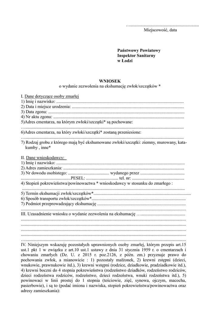 ….............................................................. Miejscowość, data Państwowy Powiatowy Inspektor Sanitarny w Łodzi WNIOSEK o wydanie zezwolenia na ekshumację zwłok/szczątków * I. Dane dotyczące osoby zmarłej 1) Imię i nazwisko: ................................................................................................................... 2) Data i miejsce urodzenia: ..................................................................................................... 3) Data zgonu: ........................................................................................................................... 4) Nr aktu zgonu: ...................................................................................................................... 5)Adres cmentarza, na którym zwłoki/szczątki* są pochowane: …............................................................................................................................................... 6)Adres cmentarza, na który zwłoki/szczątki* zostaną przeniesione: …............................................................................................................................................... 7) Rodzaj grobu z którego mają być ekshumowane zwłoki/szczątki: ziemny, murowany, katakumby , inne* II. Dane wnioskodawcy: 1) Imię i nazwisko: .................................................................................................................... 2) Adres zamieszkania: ............................................................................................................. 3) Nr dowodu osobistego: ..................................... wydanego przez ........................................ .............................................PESEL: ............................. tel. nr: ............................................... 4) Stopień pokrewieństwa/powinowactwa * wnioskodawcy w stosunku do zmarłego : ................................................................................................................................................... 5) Termin ekshumacji zwłok/szczątków*........................................................................................ 6) Sposób transportu zwłok/szczątków*..................................................................................... 7) Podmiot przeprowadzający ekshumację ................................................................................ ..................................................................................................................................................... III. Uzasadnienie wniosku o wydanie zezwolenia na ekshumację …........................................ ..................................................................................................................................................... ..................................................................................................................................................... ..................................................................................................................................................... ..................................................................................................................................................... …................................................................................................................................................. IV. Niniejszym wskazuję pozostałych uprawnionych osoby zmarłej, którym przepis art.15 ust.1 pkt 1 w związku z art.10 ust.1 ustawy z dnia 31 stycznia 1959 r. o cmentarzach i chowaniu zmarłych (Dz. U. z 2015 r. poz.2126, z późn. zm.) przyznaje prawo do pochowania zwłok, a mianowicie : 1) pozostały małżonek, 2) krewni zstępni (dzieci, wnukowie, prawnukowie itd.), 3) krewni wstępni (rodzice, dziadkowie, pradziadkowie itd.), 4) krewni boczni do 4 stopnia pokrewieństwa (rodzeństwo dziadków, rodzeństwo rodziców, dzieci rodzeństwa rodziców, rodzeństwo, dzieci rodzeństwa, wnuki rodzeństwa itd.), 5) powinowaci w linii prostej do 1 stopnia (teściowie, zięć, synowa, ojczym, macocha, pasierbowie), i są to (podać imiona i nazwiska, stopień pokrewieństwa/powinowactwa oraz adresy zamieszkania): 1)................................................................................................................................................, 2)................................................................................................................................................, 3)................................................................................................................................................, 4)................................................................................................................................................, 5)................................................................................................................................................, 6)................................................................................................................................................, 7)................................................................................................................................................, 8).…..........................................................................................................................................., 9)................................................................................................................................................, 10)................................................................................................................................................. Uwaga: W przypadku większej liczby osób uprawnionych do pochowania zwłok/szczątków* osoby zmarłej należy do wniosku dołączyć wykaz tych osób na odrębnych i ponumerowanych kartach, a pod treścią należy złoż