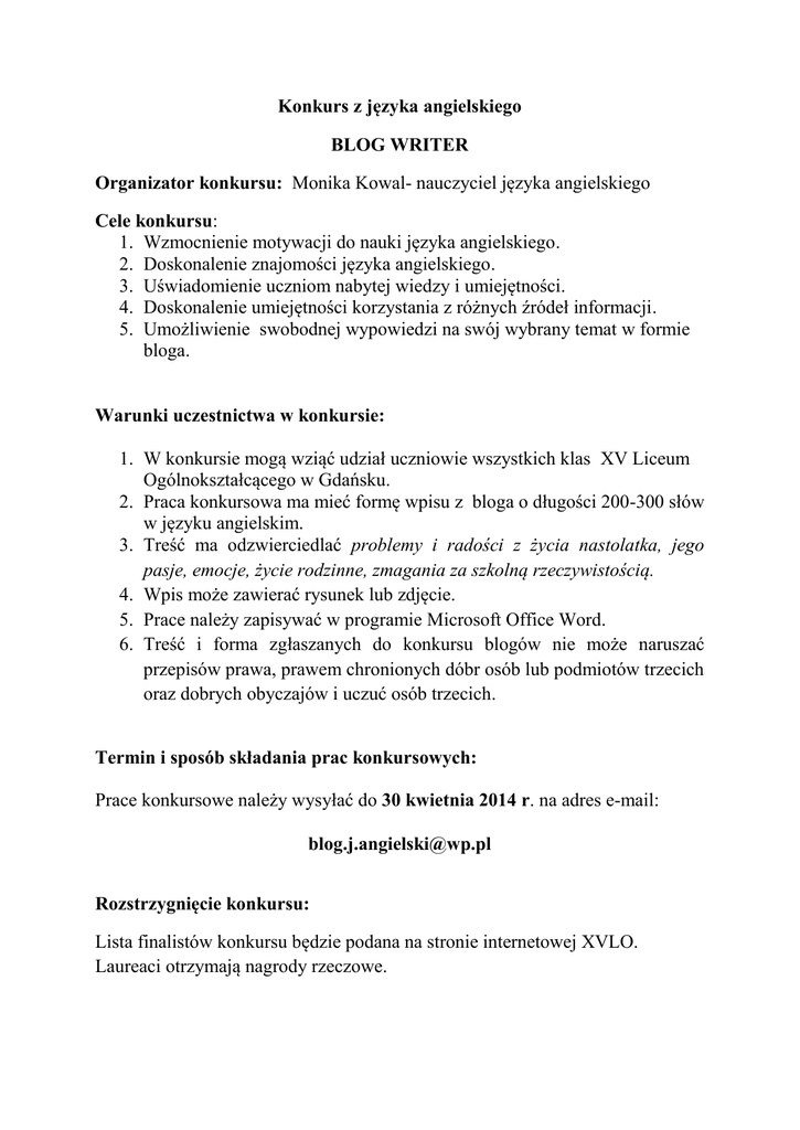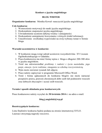 Konkurs z języka angielskiego BLOG WRITER Organizator konkursu: Monika Kowal- nauczyciel języka angielskiego Cele konkursu: 1. Wzmocnienie motywacji do nauki języka angielskiego. 2. Doskonalenie znajomości języka angielskiego. 3. Uświadomienie uczniom nabytej wiedzy i umiejętności. 4. Doskonalenie umiejętności korzystania z różnych źródeł informacji. 5. Umożliwienie swobodnej wypowiedzi na swój wybrany temat w formie bloga. Warunki uczestnictwa w konkursie: 1. W konkursie mogą wziąć udział uczniowie wszystkich klas XV Liceum Ogólnokształcącego w Gdańsku. 2. Praca konkursowa ma mieć formę wpisu z bloga o długości 200-300 słów w języku angielskim. 3. Treść ma odzwierciedlać problemy i radości z życia nastolatka, jego pasje, emocje, życie rodzinne, zmagania za szkolną rzeczywistością. 4. Wpis może zawierać rysunek lub zdjęcie. 5. Prace należy zapisywać w programie Microsoft Office Word. 6. Treść i forma zgłaszanych do konkursu blogów nie może naruszać przepisów prawa, prawem chronionych dóbr osób lub podmiotów trzecich oraz dobrych obyczajów i uczuć osób trzecich. Termin i sposób składania prac konkursowych: Prace konkursowe należy wysyłać do 30 kwietnia 2014 r. na adres e-mail: [email protected] Rozstrzygnięcie konkursu: Lista finalistów konkursu będzie podana na stronie internetowej XVLO. Laureaci otrzymają nagrody rzeczowe.