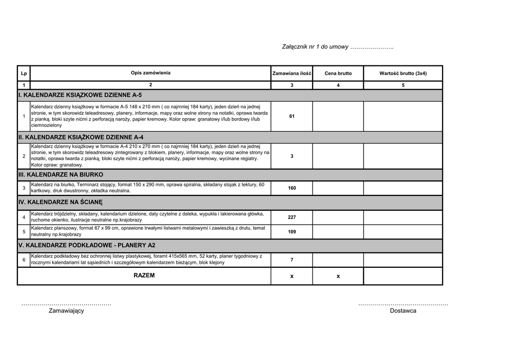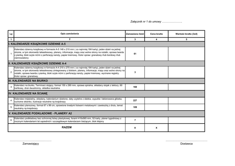 Załącznik nr 1 do umowy …………………. Lp Opis zamówienia Zamawiana ilość Cena brutto Wartość brutto (3x4) 1 2 3 4 5 Kalendarz dzienny książkowy w formacie A-5 148 x 210 mm ( co najmniej 184 karty), jeden dzień na jednej stronie, w tym skorowidz teleadresowy, planery, informacje, mapy oraz wolne strony na notatki, oprawa twarda z pianką, bloki szyte nićmi z perforacją naroży, papier kremowy. Kolor opraw: granatowy i/lub bordowy i/lub ciemnozielony 61 I. KALENDARZE KSIĄZKOWE DZIENNE A-5 1 II. KALENDARZE KSIĄŻKOWE DZIENNE A-4 2 Kalendarz dzienny książkowy w formacie A-4 210 x 270 mm ( co najmniej 184 karty), jeden dzień na jednej stronie, w tym skorowidz teleadresowy zintegrowany z blokiem, planery, informacje, mapy oraz wolne strony na notatki, oprawa twarda z pianką, bloki szyte nićmi z perforacją naroży, papier kremowy, wycinane regiatry. Kolor opraw: granatowy. 3 III. KALENDARZE NA BIURKO 3 Kalendarz na biurko, Terminarz stojący, format 150 x 290 mm, oprawa spiralna, składany stojak z tektury, 60 kartkowy, druk dwustronny, okładka neutralna. 160 IV. KALENDARZE NA ŚCIANĘ 4 Kalendarz trójdzielny, składany, kalendarium dzielone, daty czytelne z daleka, wypukła i lakierowana główka, ruchome okienko, ilustracje neutralne np.krajobrazy 227 5 Kalendarz planszowy, format 67 x 99 cm, oprawione trwałymi listwami metalowymi i zawieszką z drutu, temat neutralny np.krajobrazy 109 V. KALENDARZE PODKŁADOWE - PLANERY A2 6 Kalendarz podkładowy bez ochronnej listwy plastykowej, foramt 415x565 mm, 52 karty, planer tygodniowy z rocznymi kalendariami lat sąsiednich i szczegółowym kalendarzem bieżącym, blok klejony RAZEM ……………………………………… Zamawiający 7 x x ……………………………………… Dostawca