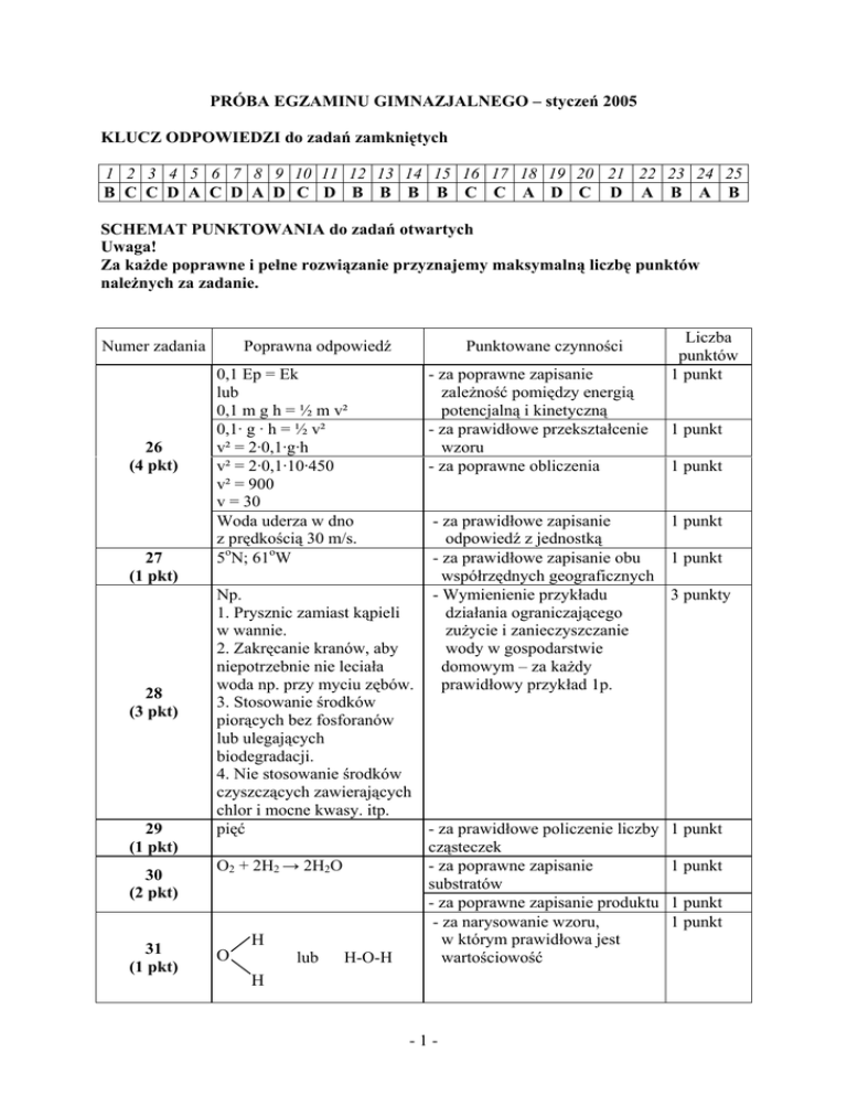 PRÓBA EGZAMINU GIMNAZJALNEGO – styczeń 2005 KLUCZ ODPOWIEDZI do zadań zamkniętych 1 2 3 4 5 6 7 8 9 10 11 12 13 14 15 16 17 18 19 20 21 22 23 24 25 B C C D A C D A D C D B B B B C C A D C D A B A B SCHEMAT PUNKTOWANIA do zadań otwartych Uwaga! Za każde poprawne i pełne rozwiązanie przyznajemy maksymalną liczbę punktów należnych za zadanie. Numer zadania 26 (4 pkt) 27 (1 pkt) 28 (3 pkt) 29 (1 pkt) 30 (2 pkt) 31 (1 pkt) Poprawna odpowiedź 0,1 Ep = Ek lub 0,1 m g h = ½ m v² 0,1· g · h = ½ v² v² = 2·0,1·g·h v² = 2·0,1·10·450 v² = 900 v = 30 Woda uderza w dno z prędkością 30 m/s. 5oN; 61oW Punktowane czynności - za poprawne zapisanie zależność pomiędzy energią potencjalną i kinetyczną - za prawidłowe przekształcenie wzoru - za poprawne obliczenia Liczba punktów 1 punkt 1 punkt 1 punkt - za prawidłowe zapisanie 1 punkt odpowiedź z jednostką - za prawidłowe zapisanie obu 1 punkt współrzędnych geograficznych - Wymienienie przykładu 3 punkty działania ograniczającego zużycie i zanieczyszczanie wody w gospodarstwie domowym – za każdy prawidłowy przykład 1p. Np. 1. Prysznic zamiast kąpieli w wannie. 2. Zakręcanie kranów, aby niepotrzebnie nie leciała woda np. przy myciu zębów. 3. Stosowanie środków piorących bez fosforanów lub ulegających biodegradacji. 4. Nie stosowanie środków czyszczących zawierających chlor i mocne kwasy. itp. pięć - za prawidłowe policzenie liczby cząsteczek O2 + 2H2 → 2H2O - za poprawne zapisanie substratów - za poprawne zapisanie produktu - za narysowanie wzoru, w którym prawidłowa jest H O lub H-O-H wartościowość H -1- 1 punkt 1 punkt 1 punkt 1 punkt Forma - za staranne narysowanie formy na poszycie parasola 1 punkt Ośmiokąt foremny -za podanie nazwy dwuczłonowej 1 punkt - za narysowanie w skali trójkąta 1 punkt równoramiennego 32 a) (2 pkt) C A 32 b) (3 pkt) B 3600 : 8 = 450 ∠ACB= 450 (1800 – 450) :2 = 67,50 ∠CAB = ∠ ABC= 67,50 CA=CB = 70 cm zmierzone AB= 53,5 cm - za obliczenie miar kątów (również bez uzasadnienia) - za podanie prawidłowych wymiarów trójkąta, Uwaga. Należy uwzględniać różnice w pomiarach podstawy ± 3,5 cm. c. Pokazane ułożenie klinów - za prawidłowe zaplanowanie dotyczy materiału rozłożenia klinów na tkaninie - podwójnej szerokości 32 c) (2 pkt) 33 (3 pkt) 1 punkt 1 punkt 1 punkt lub - pojedynczej szerokości d. materiał musi mieć - za poprawne podanie długości - 65 cm szerokości i szerokości materiału oraz 241 cm długości (po zaokrągleniu wymiarów lub do 1 cm) - 130 cm szerokości oraz 134 cm długości - za prawidłowe zapisanie 97,4 l – 2,6 l proporcji x – 1l x ≈ 37,46 - za poprawne obliczenia Na Ziemi na jeden litr wody - za prawidłowe zapisanie słodkiej przypada około odpowiedź z jednostką 37,46 litra wody słonej. -2- 1 punkt 1 punkt 1 punkt 1 punkt 34 (1 pkt) 35 (1 pkt) 36 (1 pkt) Np. sandacz i szczupak (o płoć), czapla i błotniak (o szczupaka) moczarka =>błotniarka => kaczka=> błotniak Glony => płoć => szczupak => błotniak Glony =>błotniarka => kaczka => szczupak lub inny łańcuch pokarmowy rozpoczynający się od glonów lub moczarki Np. - za właściwie dobraną parę konkurentów pokarmowych 1 punkt - za poprawne ułożenie łańcucha 1 punkt - za odpowiednią do łańcucha 1 punkt i poprawnie narysowaną piramidę błotniak szczupak płoć glony -3-