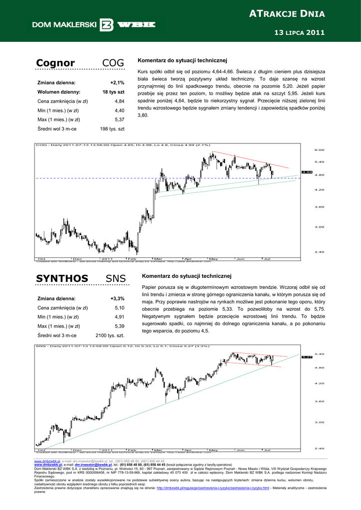 ATRAKCJE DNIA o Cognor Zmiana dzienna: Wolumen dzienny: Kurs spółki odbił się od poziomu 4,64-4,66. Świeca z długim cieniem plus dzisiejsza biała świeca tworzą pozytywny układ techniczny. To daje szansę na wzrost przynajmniej do linii spadkowego trendu, obecnie na pozomie 5,20. Jeżeli papier przebije się przez ten poziom, to możliwy będzie atak na szczyt 5,95. Jeżeli kurs spadnie poniżej 4,64, będzie to niekorzystny sygnał. Przecięcie niższej zielonej linii trendu wzrostowego będzie sygnałem zmiany tendencji i zapowiedzią spadków poniżej 3,80. +2,1% 18 tys szt 4,84 Min (1 mies.) (w zł) 4,40 Max (1 mies.) (w zł) Średni wol 3 m-ce Komentarz do sytuacji technicznej COG Cena zamknięcia (w zł) 13 LIPCA 2011 5,37 198 tys. szt COG - Daily 2011-07-13 13:56:00 Open 4.85, Hi 4.98, Lo 4.8, Clos e 4.94 (2.1%) 6.00 5.40 4.94 4.80 4.20 3.60 3.00 2.40 Oct Dec 2011 Feb Mar Apr May Jun Jul C reated with Am iBrok er - adv anc ed c harting and t echnic al analy sis s of t ware. ht t p: / /www. am ibrok er. com SYNTHOS Zmiana dzienna: Papier porusza się w długoterminowym wzrostowym trendzie. Wczoraj odbił się od linii trendu i zmierza w stronę górnego ograniczenia kanału, w którym porusza się od maja. Przy poprawie nastrojów na rynkach możliwe jest pokonanie tego oporu, który obecnie przebiega na poziomie 5,33. To pozwoliłoby na wzrost do 5,75. Negatywnym sygnałem będzie przecięcie wzrostowej linii trendu. To będzie sugerowało spadki, co najmniej do dolnego ograniczenia kanału, a po pokonaniu tego wsparcia, do poziomu 4,5. +3,3% Cena zamknięcia (w zł) 5,10 Min (1 mies.) (w zł) 4,91 Max (1 mies.) (w zł) 5,39 Średni wol 3 m-ce Komentarz do sytuacji technicznej SNS 2100 tys. szt. SNS - Daily 2011-07-13 13:58:00 Open 5.12, Hi 5.33, Lo 5.1, Clos e 5.27 (3.3%) 5.40 5.27 4.80 4.20 3.60 3.00 Oct Dec 2011 Feb Mar Apr May Jun Jul 2.40 C reated with Am iBrok er - adv anc ed c harting and t echnic al analy sis s of t ware. ht t p: / /www. am ibrok er. com www.dmbzwbk.pl, e-mail: [email protected], tel.: (061) 856 48 80, (061) 856 44 45 www.dmbzwbk.pl, e-mail: [email protected], tel.: (61) 856 48 80, (61) 856 44 45 (koszt połączenia zgodny z taryfą operatora) Dom Maklerski BZ WBK S.A. z siedzibą w Poznaniu, pl. Wolności 15, 60 - 967 Poznań, zarejestrowany w Sądzie Rejonowym Poznań - Nowe Miasto i Wilda, VIII Wydział Gospodarczy Krajowego Rejestru Sądowego, pod nr KRS 0000006408, nr NIP 778-13-59-968, kapitał zakładowy 45 073 400 zł w całości wpłacony. Dom Maklerski BZ WBK S.A. podlega nadzorowi Komisji Nadzoru Finansowego. Spółki zamieszczone w analizie zostały wyselekcjonowane na podstawie subiektywnej oceny autora, bazując na następujących kryteriach: zmiana dzienna kursu, wolumen obrotu, nadaktywność obrotu względem średniego obrotu z kilku poprzednich sesji. Zastrzeżenia prawne dotyczące charakteru opracowania znajdują się na stronie: http://dmbzwbk.pl/regulacje/zastrzezenia-i-ryzyko/zastrzezenia-i-ryzyko.html - Materiały analityczne - zastrzeżenia prawne Opracowanie: Rafał Bogusławski Analityk DM BZ WBK [email protected] Spółki zamieszczone w analizie zostały wyselekcjonowane na podstawie subiektywnej oceny autora, bazując na następujących kryteriach: zmiana dzienna kursu, wolumen obrotu, nadaktywność obrotu względem średniego obrotu z kilu poprzednich sesji. Wykres przygotowano za pomocą programu Metastock, AmiBroker lub Fibotrader. Dane do wykresów dostarcza GPW, Akcje.net i DM BZ WBK S.A. Źródłem pozostałych danych są GPW, PAP, Reuters, GUS, NBP, DM BZ WBK S.A., prasa finansowa i internetowe serwisy finansowo-ekonomiczne. Dane prezentowane w niniejszym raporcie zostały uzyskane lub zaczerpnięte ze źródeł uznanych przez DM BZ WBK S.A. za wiarygodne, jednakże DM BZ WBK S.A. nie może zagwarantować ich dokładności i pełności. Niniejsze opracowanie i zawarte w nim komentarze są wyrazem wiedzy oraz poglądów autorów i nie powinny być inaczej interpretowane. Dom Maklerski BZ WBK S.A. nie ponosi odpowiedzialności za szkody poniesione w wyniku decyzji podjętych na postawie informacji i opinii zawartych w niniejszym opracowaniu. Powielanie bądź publikowanie niniejszego opracowania lub jego części bez pisemnej zgody DM BZ WBK S.A. jest zabronione. FUNDUSZE INWESTYCYJNE RAPORT MIESIĘCZNY 2 www.dmbzwbk.pl, e-mail: [email protected], tel.: (061) 856 48 80, (061) 856 44 45 Dom Maklerski BZ WBK Spółka Akcyjna z siedzibą w Poznaniu, Pl. Wolności 15, 60-967 Poznań, wpisany do rejestru przedsiębiorców prowadzonego przez Sąd Rejonowy Poznań – Nowe Miasto i Wilda w Poznaniu, VIII Wydział Gospodarczy Krajowego Rejestru Sądowego, pod nr KRS 0000006408, o kapitale zakładowy w wysokości 45 029 000 zł w pełni wpłaconym, NIP 778-13-59-968, będący spółką zależną Banku Zachodniego WBK S.A., działający pod nadzorem Komisji Nadzoru Finansowego. Niniejszy dokument stanowi publikację handlową