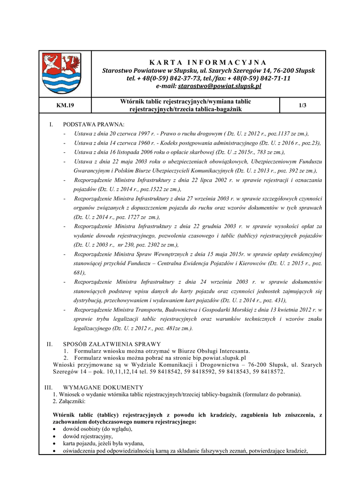KARTA INFORMACYJNA Starostwo Powiatowe w Słupsku, ul. Szarych Szeregów 14, 76-200 Słupsk tel. + 48(0-59) 842-37-73, tel./fax: + 48(0-59) 842-71-11 e-mail: [email protected] Wtórnik tablic rejestracyjnych/wymiana tablic rejestracyjnych/trzecia tablica-bagażnik KM.19 I. 1/3 PODSTAWA PRAWNA: - Ustawa z dnia 20 czerwca 1997 r. - Prawo o ruchu drogowym ( Dz. U. z 2012 r., poz.1137 ze zm.), - Ustawa z dnia 14 czerwca 1960 r. - Kodeks postępowania administracyjnego (Dz. U. z 2016 r., poz.23), - Ustawa z dnia 16 listopada 2006 roku o opłacie skarbowej (Dz. U .z 2015r., 783 ze zm.), - Ustawa z dnia 22 maja 2003 roku o ubezpieczeniach obowiązkowych, Ubezpieczeniowym Funduszu Gwarancyjnym i Polskim Biurze Ubezpieczycieli Komunikacyjnych (Dz. U. z 2013 r., poz. 392 ze zm.), - Rozporządzenie Ministra Infrastruktury z dnia 22 lipca 2002 r. w sprawie rejestracji i oznaczania pojazdów (Dz. U. z 2014 r., poz.1522 ze zm.), - Rozporządzenie Ministra Infrastruktury z dnia 27 września 2003 r. w sprawie szczegółowych czynności organów związanych z dopuszczeniem pojazdu do ruchu oraz wzorów dokumentów w tych sprawach (Dz. U. z 2014 r., poz. 1727 ze zm.), - Rozporządzenie Ministra Infrastruktury z dnia 22 grudnia 2003 r. w sprawie wysokości opłat za wydanie dowodu rejestracyjnego, pozwolenia czasowego i tablic (tablicy) rejestracyjnych pojazdów (Dz. U. z 2003 r., nr 230, poz. 2302 ze zm.), - Rozporządzenie Ministra Spraw Wewnętrznych z dnia 15 maja 2015r. w sprawie opłaty ewidencyjnej stanowiącej przychód Funduszu – Centralna Ewidencja Pojazdów i Kierowców (Dz. U. z 2015 r., poz. 681), - Rozporządzenie Ministra Infrastruktury z dnia 24 września 2003 r. w sprawie dokumentów stanowiących podstawę wpisu danych do karty pojazdu oraz czynności jednostek zajmujących się dystrybucją, przechowywaniem i wydawaniem kart pojazdów (Dz. U. z 2014 r., poz. 431), - Rozporządzenie Ministra Transportu, Budownictwa i Gospodarki Morskiej z dnia 13 kwietnia 2012 r. w sprawie trybu legalizacji tablic rejestracyjnych oraz warunków technicznych i wzorów znaku legalizacyjnego (Dz. U. z 2012 r., poz. 481ze zm.). II. III. SPOSÓB ZAŁATWIENIA SPRAWY 1. Formularz wniosku można otrzymać w Biurze Obsługi Interesanta. 2. Formularz wniosku można pobrać na stronie bip.powiat.slupsk.pl Wnioski przyjmowane są w Wydziale Komunikacji i Drogownictwa – 76-200 Słupsk, ul. Szarych Szeregów 14 – pok. 10,11,12,14 tel. 59 8418542, 59 8418592, 59 8418543, 59 8418572. WYMAGANE DOKUMENTY 1. Wniosek o wydanie wtórnika tablic rejestracyjnych/trzeciej tablicy-bagażnik (formularz do pobrania). 2. Załączniki: Wtórnik tablic (tablicy) rejestracyjnych z powodu ich kradzieży, zagubienia lub zniszczenia, z zachowaniem dotychczasowego numeru rejestracyjnego: dowód osobisty (do wglądu), dowód rejestracyjny, karta pojazdu, jeżeli była wydana, oświadczenia pod odpowiedzialnością karną za składanie fałszywych zeznań, potwierdzające kradzież, KM.19 Wtórnik tablic rejestracyjnych/wymiana tablic rejestracyjnych Nr strony 2/3 zagubienie bądź zniszczenie tablic (tablicy) rejestracyjnych, w przypadku wniosku o wydanie wtórnika jednej tablicy rejestracyjnej do odbioru tablicy konieczne jest przedłożenie drugiej tablicy rejestracyjnej, Wymiana tablic rejestracyjnych (zmiana numeru rejestracyjnego): wniosek o wymianę tablic rejestracyjnych, (do pobrania) dowód rejestracyjny, karta pojazdu (jeśli była wydana), ubezpieczenie OC (do wglądu), dowód osobisty (do wglądu), zaświadczenie wydane przez właściwy organ Policji potwierdzające zgłoszenie kradzieży tablic/tablicy rejestracyjnej – w przypadku kradzieży tablic/tablicy rejestracyjnej, stosowne oświadczenie pod odpowiedzialnością karną złożone przez właściciela – w przypadku zgubienia tablic/tablicy rejestracyjnej, zwrot uszkodzonych tablic rejestracyjnych – w przypadku zniszczenia tablic/tablicy rejestracyjnej. Wydanie trzeciej tablicy rejestracyjnej (do oznaczenia bagażnika zakrywającego tylną tablicę rejestracyjną): wniosek o wydanie tablicy (do pobrania), dowód rejestracyjny, karta pojazdu (jeżeli była wydana), dowód osobisty (do wglądu). IV. OPŁATY Opłata skarbowa: brak Opłaty administracyjne: wtórnik tablic rejestracyjnych: - samochodowe - 80,00 zł, 1 szt. – 40 zł - motocyklowe - 40,00 zł, - motorowerowe - 30,00 zł, - indywidualne samochodowe- 80,00 zł, - indywidualne motocyklowe- 40,00 zł, - zabytkowe samochodowe - 100,00 zł, - zabytkowe motocyklowe - 50,00 zł trzecia tablica-bagażnik – 40 zł. pozwolenie czasowe-13,50 dowód rejestracyjny-54,00 nalepka kontrolna na szybę-18,50 znaki legalizacyjne - 12,50 zł Opłata ewidencyjna: zalegalizowane tablice (tablicy) rejestracyjne - 0,50 zł pozwolenie czasowe-0,50 dowód rejestracyjny-0,50 nalepka kontrolna na szybę-0,50 KM.19 Wtórnik tablic rejestracyjnych/wymiana tablic rejestracyjnych Nr strony 3/3 Opłata administracyjna: - wpłata w kasie Urzędu - wpłata przelewem na konto: Starostwo Powiatowe w Słupsku 76-200 Słupsk ul. Szarych Szeregów 14 Bank Spółdzielczy w Ustce konto Nr 63 9315 0004 0050 6818 2000 0050 (z dopiskiem dokonywanej operacji, np. "Opłata za tablice rejestracyjne") Dowód wpłaty prosimy dołączyć do danej procedury. Informujemy, że w/w konto dotyczy tylko i wyłącznie opłat administracyjnych oraz danej procedury urzędowej V. TERMIN ZAŁATWIENIA SPRAWY Niezwłoczne rozpatrzenie wniosku. Czas oczekiwania na tablicę (wtórnik/bagażnik) ok. 2-3 dni. VI. VII. TRYB ODWOŁAWCZY Nie przysługuje. INFORMACJE DODATKOWE Pojazd, dla którego właściciel wnioskuje o wydanie trzeciej tablicy rejestracyjnej (na bagażnik) powinien posiadać tablice rejestracyjne zgodne ze wzorem określonym rozporządzeniem (rozporządzenie w sprawie rejestracji i oznaczania pojazdów Dz. U. z 2014 r. poz. 1522 ze zm.). W przypadku gdy właściciela pojazdu reprezentuje ustanowiony pełnomocnik winien on przedłożyć do wniosku o re