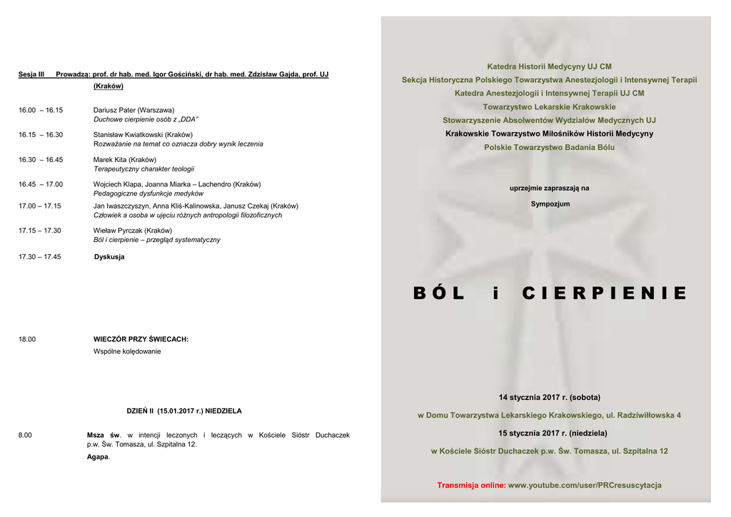 Sesja III Prowadzą: prof. dr hab. med. Igor Gościński, dr hab. med. Zdzisław Gajda, prof. UJ (Kraków) Katedra Historii Medycyny UJ CM Sekcja Historyczna Polskiego Towarzystwa Anestezjologii i Intensywnej Terapii Katedra Anestezjologii i Intensywnej Terapii UJ CM 16.00 – 16.15 Dariusz Pater (Warszawa) Duchowe cierpienie osób z „DDA” 16.15 – 16.30 Stanisław Kwiatkowski (Kraków) Rozważanie na temat co oznacza dobry wynik leczenia 16.30 – 16.45 Marek Kita (Kraków) Terapeutyczny charakter teologii 16.45 – 17.00 Wojciech Klapa, Joanna Miarka – Lachendro (Kraków) Pedagogiczne dysfunkcje medyków 17.00 – 17.15 Jan Iwaszczyszyn, Anna Kliś-Kalinowska, Janusz Czekaj (Kraków) Człowiek a osoba w ujęciu różnych antropologii filozoficznych 17.15 – 17.30 Wieław Pyrczak (Kraków) Ból i cierpienie – przegląd systematyczny 17.30 – 17.45 Dyskusja Towarzystwo Lekarskie Krakowskie Stowarzyszenie Absolwentów Wydziałów Medycznych UJ Krakowskie Towarzystwo Miłośników Historii Medycyny Polskie Towarzystwo Badania Bólu uprzejmie zapraszają na Sympozjum BÓL 18.00 i CIERPIENIE WIECZÓR PRZY ŚWIECACH: Wspólne kolędowanie 14 stycznia 2017 r. (sobota) DZIEŃ II (15.01.2017 r.) NIEDZIELA 8.00 Msza św. w intencji leczonych i leczących w Kościele Sióstr Duchaczek p.w. Św. Tomasza, ul. Szpitalna 12. Agapa. w Domu Towarzystwa Lekarskiego Krakowskiego, ul. Radziwiłłowska 4 15 stycznia 2017 r. (niedziela) w Kościele Sióstr Duchaczek p.w. Św. Tomasza, ul. Szpitalna 12 Transmisja online: www.youtube.com/user/PRCresuscytacja Komitet Organizacyjny: Dr hab. med. Zdzisław Gajda, prof. UJ Prezes Stowarzyszenia Absolwentów Wydziałów Medycznych UJ Dr med. Alicja Macheta Przewodnicząca Sekcji Historycznej Polskiego Towarzystwa Anestezjologii i Intensywnej Terapii Dr M. Dorota Schmidt - Pospuła Katedra Historii Medycyny UJ CM Prezes Krakowskiego Towarzystwa Miłośników Historii Medycyny Dr hab. Ryszard W. Gryglewski, prof. UJ Kierownik Katedry Historii Medycyny UJ CM Prof. dr hab. med. Jerzy Wordliczek Kierownik Kliniki Intensywnej Terapii Interdyscyplinarnej UJ CM Prof. dr hab. med. Jan Dobrogowski Prezes Polskiego Towarzystwa Badania Bólu Prof. dr hab. med. Igor Gościński Prezes Towarzystwa Lekarskiego Krakowskiego Prof. dr hab. med. Janusz Andres Kierownik Katedry Anestezjologii i Intensywnej Terapii UJ CM DZIEŃ I (14.01. 2017r.) SOBOTA 9.00 – Sesja I 9.15 Prowadzą: prof. dr hab. med. Jan Dobrogowski, prof. dr hab. med. Ryszard Gajdosz, dr med. Alicja Macheta (Kraków) 9.15 – 9.35 Ryszard Witold Gryglewski (Kraków) Ból jako problem teoretyczny i praktyczny w dziejach medycyny 9.35 – 9.55 Anna Przeklasa-Muszyńska (Kraków) Zastosowanie metod alternatywnych i komplementarnych w leczeniu bólu 9.55 – 10.10 Magdalena Kocot-Kępska (Kraków) Czy jest miejsce na toksynę botulinową w leczeniu bólu neuropatycznego 10.10 – 10.25 Renata Zajączkowska (Kraków) Ból fantomowy 10.25 – 10.45 Ryszard Gajdosz (Kraków) Ból ostry i przewlekły – postępowanie medyczne 10.45 – 11.00 Dyskusja 11.00 – 11.30 Przerwa na kawę. Sesja Plakatowa Prowadzą: dr M. Dorota Schmidt-Pospuła, mgr Wiesław Pyrczak (Kraków) Sesja II Prowadzą: dr med. Małgorzata Szerla (Kielce), dr Krzysztof Duda 11.30 – 11.45 Krzysztof Duda (Kraków) Cierpienie i twórczość 11.45 – 12.05 Miłosz Jankowski (Kraków) Ból, pobudzenie, majaczenie na oddziale intensywnej terapii 12.05 – 12.20 Sympozjum opiekują się: Polskie Towarzystwo Badania Bólu 12.20 – 12.35 Akademia Ignatianum w Krakowie Scientia Plus Sp.z o.o. w oparciu o rozporz. min. zdr. z 6 października 2004 r.-Dziennik Ustaw nr 231 poz.2326. – czynny udział: 10 punktów, bierny: 1 punkt za 1 godz. Małgorzata Szerla(Kielce), D. Ortenburger (Częstochowa), P. Skonieczna, A. Michalska, S. Iwan (Kielce) Oblicza przemocy wobec pracowników opieki zdrowotnej w szpitalu Małgorzata Knap (Kielce) Cierpienie chorego z zanikiem mięśni międzyżebrowych. Opis przypadku 12.35 – 12.55 Ewa Podwińska (Bytom) Praca jako cierpienie 12.55 – 13.20 Dyskusja 13.20 - 16.00 Przerwa międzysesyjna Molteni Farmaceutici Udział w sympozjum jest bezpłatny. Uczestnicy otrzymują punkty edukacyjne Otwarcie: dr hab. med. Zdzisław Gajda, prof. UJ (Kraków) Sesja IV - Plakatowa 14.01.2017 r. (sobota) godz. 11.00 Prowadzi: dr Dorota M. Schmidt-Pospuła (Kraków) mgr Wiesław Pyrczak (Kraków) 1. Monika Majoch (Kraków) Cierpienie osób doświadczonych niepłodnością. 2. Anna Kotlińska (Kraków) Ból i cierpienie matek w okresie laktacji. 3. Urszula Drabik, Jowita Słowik, Joanna Miarka, Katarzyna Jurkiewicz (Kraków) Opinie pielęgniarek o zagrożeniach ze trony pacjentów agresywnych. 4. Katarzyna Jurkiewicz, Wojciech Klapa, ss. Kanoniczki Ducha Świętego de Saxia (Kraków) Cierpienie w fotografii ze zbiorów Zgromadzenia Sióstr Kanoniczek Ducha Świętego. 5. Jurkiewicz Katarzyna (Kraków) Oddziaływanie reklam leków i parafarmaceutyków na pacjenta w podeszłym wieku.