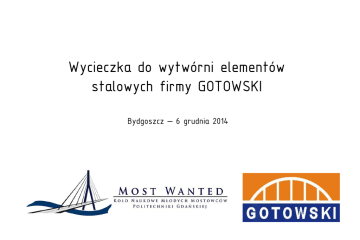 Wycieczka do wytwórni elementów stalowych firmy GOTOWSKI Bydgoszcz – 6 grudnia 2014 W ostatnie Mikołajki nasze koło wybrało się na wycieczkę! Celem naszej podróży stała się Bydgoszcz – to właśnie tam mieści się fabryka konstrukcji stalowych, która miała niebawem odkryć skrywane przez nią tajemnice... Na miejscu przywitał nas bardzo serdecznie Pan Roman Michalczuk – dyrektor techniczny firmy GOTOWSKI. To właśnie dzięki niemu mogliśmy zobaczyć produkcję konstrukcji od kuchni. Najpierw zwiedziliśmy plac składowy przed fabryką – część osób nie zdawała sobie sprawy, jak bardzo intrygujący może być arkusz blachy... ...rzędy sworzni na blachownicy mostowej... ...naprawdę gruba półka dwuteownika... ...bądź detale w obrębie węzłów. Przed wejściem do fabryki dostaliśmy prezenty mikołajkowe! A potem kierownik produkcji pokazał nam jak sprawdzać spoiny i konstruować połączenia spawane... ...i ruszyliśmy dalej... ...zobaczyć jak powstaje spawany dwuteownik. Części składowe konstrukcji wycinane są za pomocą numerycznie sterowanego palnika – dzięki temu wszystko przebiega szybko i bezproblemowo. Pokazano nam dokładnie w jaki sposób elementy są wycinane. Prawie gotowe! A co takiego przedstawia to zdjęcie? Otóż jest to... ...wypiaskowany element konstrukcji! W taki sposób czyści się elementy stalowe przed zabezpieczeniem ich przed korozją... UWAGA! ŚWIEŻO MALOWANE! Po pomalowaniu elementy odpoczywają sobie na placu, czekając aż ktoś zabierze je na budowę i zrobi z nich most albo halę. Po zwiedzeniu wytwórni, szybkim krokiem ruszyliśmy na budowę wiaduktów tramwajowych. Jest to aktualnie największa realizowana inwestycja w Bydgoszczy... ...która połączy Fordon z centrum miasta. Na zakończenie udaliśmy się na kładkę nad trasą Uniwersytecką... ...z której mogliśmy podziwiać nowy Bydgoski most w ciągu tej trasy. Zarówno kładka jak i most zostały wykonane przez firmę GOTOWSKI. Pozdrawiamy! Autorzy Magdalena Ozimek, Krzysztof Puzdrowski