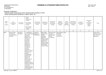 STAROSTWO POWIATOWE W GRYFICACH ul. Pl. Zwycięstwa 37 72-300 Gryfice Data: 2016-12-29 godz. 10:20:01 Parametry zestawienia: Wybrany rejestr stowarzyszeń równe: Stowarzyszenia Zwykłe od 2016r. Pokaż stowarzyszenia wykreślone z rejestru równe: nie 1 Cel/cele działania stowarzyszenia zwykłego Numer kolejny w ewidencji Nazwa stowarzyszenia zwykłego Daty wpisów do ewidencji 2 Teren działania stowarzyszenia zwykłego Adres siedziby stowarzyszenia zwykłego Reprezentacja stowarzyszenia zwykłego Organ kontroli wewnętrznej stowarzyszenia zwykłego Regulamin działalności stowarzyszenia zwykłego Status organizacji pożytku publicznego Przekształcenie lub rozwiązanie stowarzyszenia zwykłego Likwidator stowarzyszenia zwykłego Zastosowanie wobec stowarzyszenia zwykłego środków nadzoru Uwagi 5 6 7 8 9 10 11 12 13 Bożena Biłyj funkcja: Prezes Zarządu Agnieszka Smolińska funkcja: członek Zarządu Danuta Prusakiewicz funkcja: członek Zarządu Waleria Szulc funkcja: członek Zarządu Stowarzyszenie zwykłe nie posiada organu kontroli wewnętrznej. 3 Środki działania stowarzyszenia zwykłego 1 0001 2 3 Stowarzyszenie data wpisu: Uniweersytet 2016.09.20 Trzeciego Wieku w Gryficach Arisco Sp. z o.o (c) - RESTO 4 1.a. działalność na ul. Wojska rzecz wszechstronnej Polskiego 23 aktywizacji 72300 Gryfice społeczności lokalnej, w tym aktywizacji zawodowej, kulturalnej, naukowej i sportowej, b. podnoszenie kwalifikacji zawodowych członków społeczności lokalnej, c. dążenie do podnoszenia poziomu intelektualnego i komfortu życia społeczności lokalnej, d. przeciwdziałanie wykluczeniu społecznemu, e. działaność naukowa, naukowo-techniczna , oświatowa i edukacyjna, w tym również polegająca na kształceniu data uchwalenia: NIE 2016.09.09 nr uchwały: Uchwała Nr 2 numer teczki: 1 kadencja zarządu: 4 lata - §3 ust.4 Rgulaminu; strona 1 z 6 1 2 3 4 5 6 7 8 9 10 11 12 13 studentów, f. włączanie społeczności lokalnej, w tym osób starszych i niepełnosprawnych, do systemu kształcenia ustawicznego, stymulowanie rozwoju osobowego oraz sprawności intelektualnej i fizycznej, g. działaność twórcza i krajoznawczo-turyst yczna, i. działalność w zakresie kultury fizycznej i sportu promowanie aktywnych form spędzania wolnego czasu, j. działalność w zakresie ochrony środowiska. 2. Rzeczpospolita Polska 3. a. prowadzenie wykładów, seminariów,lektorató w języków obcych oraz zajęć w zespołach twórczych i sekcjach tematycznych; b. organizowanie konferencji i sesji naukowych oraz spotkań tematycznych; c. organizowanie imprez kulturalnych, takich jak: konkursy, spektakle, warsztaty twórcze i inne formy działalności edukacyjno-artystyc znej; d. organizowanie klubów dyskusyjnych, filmowych i innych Arisco Sp. z o.o (c) - RESTO strona 2 z 6 1 2 3 4 5 6 7 8 9 10 11 12 13 klubów zainteresowań; e. organizowanie wystaw prac artystycznych; f. organizację form doskonalenia zawodowego oraz uczestnictwo jego członków i beneficjentów w formach doskonalenia zawodowego; g. działalność edytorsko-wydawnic zą; h. organizowanie wycieczek i innych form działalności turystyczno-krajozna wczej; i. prowadzenie zajęć ruchowych i rehabilitację zdrowotną; j. prowadzenie działalności promocyjno-informa cyjnej, szkoleniowej i wydawniczej; k. współdziałanie z organami samorządowymi i instytucjami zajmującymi sie problematyką społeczności loaklnej oraz problematyką osób starszych; Arisco Sp. z o.o (c) - RESTO strona 3 z 6 1 0002 2 Stowarzyszenie Ochrony Plaż i Klifów 3 data wpisu: 2016.09.30 4 5 1.a0 zachowanie ul. Mickiewicza 9 walorów naturalnych Rewal i krajobrazowych, b0 72-344 realizacja i ochrona prawa obywatelskich, c0 ochrona środowiska naturalnego, a w szczególności plaż, klifów, wydm, krajobrazu, terenów zielonych i wód przybrzeżnych, d0 edukacja i wzrost świadomości obywatelskiej, e0 rozwój kultury i oświaty, f0 opracowanie kierunku rozwoju Rewala w zgodzie z potrzebami większości mieszkańców i możliwościami środowiska naturalnego. 2. Rzeczpospolita Polska 6 7 Stowarzyszenie zwykłe jest reprezentowane przez przedstawiciela : Wioletta Mackiewicz-Pietr asik Stowarzyszenie zwykłe nie posiada organu kontroli wewnętrznej. 8 data uchwalenia: NIE 2016.09.24 nr uchwały: Uchwała Nr 2/2016 9 10 11 12 13 numer teczki: 2 kadencja przedstawiciela: pkt. 22 Rgulaminu- do czasu odwołania przez zebranie członków; 3. a0 współpraca ze wszystkimi organizacjami, instutucjami i stowarzyszeniami, których działaność jest zbieżna z przyjętymi celami stowarzyszenia, b0 udział w wyborach do ciał przedstawicielskich wszystkich szczebli, c0 działaność interwencyjna i mediacyjna, d0 działaność informacyjna, wydawnicza i doradcza. Arisco Sp. z o.o (c) - RESTO strona 4 z 6 1 0003 2 Gryfickie Towarzystwo Brydżowe 3 data wpisu: 2016.12.14 4 5 1.1. Popularyzacja ul. Bankowa 7 brydża sportowego. 72-300 Gryfice 2. Edukacja członków stowarzyszenia w zakresie wiedzy brydżowej. 3. Promocja Gminy i Powiatu Gryfickiego. 6 7 Stowarzyszenie zwykłe jest reprezentowane przez przedstawiciela : Mirosław Zieliński Stowarzyszenie zwykłe nie posiada organu kontroli wewnętrznej. 8 data uchwalenia: NIE 2016.10.17 nr uchwały: Uchwała Nr 1/2016 9 10 11 12 13 numer teczki: 3 kadencja przedstawiciela: § 19. regulaminu - 3 lata; 2. Rzeczpospolita Polska 3. 1. Organizacja treningow i rozgrywek klubowych. 5. Udział w rozgrywkach organizowanych przez Związki Brydża Sportowego. 3. Udzial w otwartych sportowych turniejach brydżowych organizowanych przez Związki Brydźa Sportowego. 4. Organizacja turniejów brydźa sportowego na terenie Powiatu Gryfickiego. Arisco Sp. z o.o (c) - RESTO strona 5 z 6 1 0004 2 Klub Czerwonej Wieży 3 data wpisu: 2016.12.29 późniejsze zmiany: 2016.12.29 4 5 1.Gromadzenie i ul. Niecała 1 popularyzowanie Pobierowo wśród społeczeństwa 72-346 wiedzy z zakresu historii i bieżącej polityki Polski, a także s