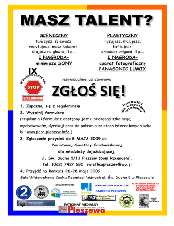 SCENICZNY PLASTYCZNY tańczysz, śpiewasz, recytujesz, masz kabaret, stajesz na głowie, itp.... rysujesz, malujesz, haftujesz, składasz origami, itp.... I NAGRODA– miniwieŜa SONY I NAGRODA– aparat fotograficzny PANASONIC LUMIX indywidualnie lub zbiorowo 1. Zapoznaj się z regulaminem 2. Wypełnij formularz (regulamin i formularz dostępny jest u pedagoga szkolnego, wychowawców, dyrekcji oraz do pobrania ze stron internetowych szkoły i www.pcpr-pleszew.info ) 3. Zgłoszenie przynieś do 8 MAJA 2009 do Powiatowej Świetlicy Środowiskowej dla młodzieŜy dojeŜdŜającej, ul. Św. Ducha 5/13 Pleszew (Dom Rzemiosła), Tel. (062) 7427 680 [email protected] 4. Przyjdź na konkurs 26-28 maja 2009 Sala Widowiskowa Cechu Rzemiosł RóŜnych ul. Św. Ducha 5 w Pleszewie SANEPID PLESZEW