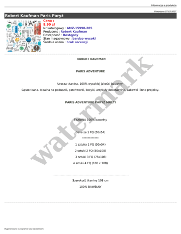 Informacje o produkcie Utworzono 07-03-2017 Robert Kaufman Paris Paryż Cena : 9,90 zł Nr katalogowy : AMZ-15998-205 Producent : Robert Kaufman Dostępność : Dostępny Stan magazynowy : bardzo wysoki Średnia ocena : brak recenzji er m ar k ROBERT KAUFMAN PARIS ADVENTURE Urocza tkanina, 100% wysokiej jakości bawełny. Gęsto tkana. Idealna na poduszki, patchworki, kocyki, artykuły dekoracyjne, zabawki i inne projekty. PARIS ADVENTURE PARYŻ MULTI TKANINA 100% bawełny at Cena za 1 FQ (50x54) ************ 1 sztuka 1 FQ (50x54) w 2 sztuki 2 FQ (50x108) 3 sztuki 3 FQ (75x108) 4 sztuki 4 FQ (100 x 108) ........................................................................................ Szerokość tkaniny 108 cm 100% BAWEŁNY Wygenerowano w programie www.oscGold.com