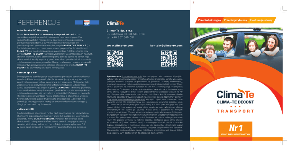 B B REFERENCJE Przeciwbakteryjny Auto Service SC Warowny Przeciwgrzybiczny Inaktywuje wirusy Clima-Te Sp. z o.o. ul. Lubelska 31, 08-500 Ryki tel. +48 667 665 051 Firma Auto Service s. c. Warowny istnieje od 1983 roku i od początku swojej działalności zajmuje się naprawami pojazdów samochodowych (...) Pracujemy w oparciu otechnologie napraw producentów pojazdów, o czym świadczy przynależność do prestiżowej sieci serwisów samochodowych BOSCH CAR SERVICE (...) Spośród stosowanych przez nasz serwis preparatów, środek [firmy] CLIMA-TE jest najskuteczniejszym preparatem (...) Dezynfekcje przy użyciu CLIMA-TE DECONT przeprowadzaliśmy w samochodach naszych stałych klientów, dzięki czemu mogliśmy zebrać opinie na temat jego skuteczności. Każdy zapytany przez nas klient potwierdził skuteczność działania zastosowanego środka. Biorąc pod uwagę powyższe czynniki (argumenty), zdecydowanie polecam stosowanie środka CLIMA-TE DECONT do dezynfekcji układów klimatyzacji www.clima-te.com [email protected] Carstar sp. z o.o. Sposób użycia: Przy pomocy areozolu: Wyczyść pojazd i wlot powietrza. Wyjmij filtr pyłkowy aby umożliwić swobodny przepływ. Wtryśnij preparat do kanału wlotowego (najlepiej nanieść preparat bezpośrednio na parownik i kanały wewnętrzne), stosować stopniowo celem uniknięcia zamoczenia instalacji elektrycznej. Włącz silnik i pozostaw na wolnych obrotach na 20 min. z klimatyzacją i wentylacją włączoną na 2-bieg oraz z włączonym obiegiem wewnętrznym. Następnie zgaś silnik, otwórz wszystkie drzwi (celem przewietrzenia) pozostaw pojazd na 40 min. Dla pojazdów osobowych typu sedan, hatchback, kombi stosować dawkę 100ml, dla pojazdów SUV, dostawczych itp. stosować dawkę 200ml. Przy pomocy urządzenia ultradźwiękowego (zalecane): Wyczyść pojazd, wlot powietrza i usuń dywaniki. Jeżeli filtr przeciwpyłowy jest usytuowany wewnątrz pojazdu, usuń go. Jeżeli filtr przeciwpyłowy jest usytuowany w części przedniej pojazdu, pod maską silnika i nie przepływa przez niego powietrze przy włączonym obiegu wewnętrznym, nie trzeba go usuwać. Włącz silnik i pozostaw na wolnych obrotach na minimum 20min. z klimatyzacją i wentylacją włączoną na 2-bieg oraz z włączonym obiegiem wewnętrznym i uruchomionym urządzeniem rozpylającym preparat. Dla polepszenia skuteczności działania w trakcie zabiegu pozostaw nowy filtr przeciw pyłkowy w kabinie pojazdu. Następnie zgaś silnik, otwórz wszystkie drzwi (celem przewietrzenia) pozostaw pojazd na 40 min. W przypadku dużego zagrzybienia i możliwości dostępu do parownika klimatyzacji przed rozpoczęciem dezynfekcji, należy nanieść preparat bezpośrednio na parownik. Dla pojazdów osobowych typu sedan, hatchback, kombi stosować dawkę 100ml, Projekt i wykonanie: dla pojazdów SUV, dostawczych itp. stosować dawkę 200ml. www.firesun.pl Ze względu na standaryzację wyposażenia pojazdów samochodowych w układy klimatyzacyjne od kilku lat obserwujemy znaczny wzrost zapotrzebowania na usługi związane z ich serwisem. Dlatego też tak ważne stało się dezynfekowanie układu klimatyzacji. Od pewnego czasu stosujemy więc preparat [firmy] CLIMA-TE - i musimy przyznać, iż spośród wielu obecnych na rynku produktów o podobnym spektrum działania ten okazał się „strzałem w dziesiątkę”. Zebrane od naszych klientów opinie utwierdzają nas w przekonaniu o słuszności wyboru. Klienci potwierdzają jego długotrwałą skuteczność (...) środek nie powoduje nieprzyjemnych reakcji ze strony układu oddechowego tj. alergii, podrażnień czy łzawienia. Jublewscy SC Środki dostępne obecnie na rynku, czyli ozonowanie czy dezynfekcja chemiczna przynoszą krótkotrwały efekt (...) Inaczej jest w przypadku preparatu firmy CLIMA-TE DECONT. Perparat ten cechuje duża skuteczność i długotrwały efekt, na co zwrócili uwagę pracownicy serwisu jak i klienci, u których dezynfekcja została wykonana. (...) W aucie czuć świeżość a nieprzyjemny zapach długo nie powraca. B CLIMA-TE DECONT TRANSPORT Nr 1 JEDYNY TAKI PRODUKT NA RYNKU B B B CLIMA-TE DECONT ATEST HIGIENICZNY TRANSPORT Produkt posiada atest higieniczny Państwowego Zakładu Higieny (PZH). ZAGROŻENIE LEGIONELOZĄ 12 do Prof. dr hab. med. Tadeusz Płusa MIESIĘCY CIĄGŁEGO DZIAŁANIA Kierownik Kliniki Chorób Wewnętrznych, Pneumonologii i Alergologii, Centralnego Szpitala Klinicznego Ministerstwa Obrony Narodowej, Wojskowego Instytutu Medycznego w Warszawie. Wziewne zakażenia układu oddechowego stanowią wciąż istotny problem medyczny, bowiem większość patogenów (bakterii, wirusów, grzybów) może być rozprzestrzeniana ta drogą. Z tego powodu istnieje konieczność ochrony człowieka przed inhalowanymi do dróg oddechowych czynnikami biologicznymi, które mogą wywoływać ostre i przewlekłe stany zapalne, zagrażające zdrowiu i życiu (...) Średnia zapadalność w państwach Unii Europejskiej osiągnęła 11,8 na milion mieszkańców. Według danych Europejskiej Grupy Roboczej do spraw Zakażeń Legionella (European Group for Legionella Infection - EWGLI), w latach 2007 i 2008 notowano po prawie 6000 przypadków choroby legionistów (dane odpowiednio z 35 i 34 krajów). Około 42% stanowiły zakażenia zewnątrzszpitalne, 11% wewnątrzszpitalne, a 46% zachorowań było związanych z podróżami, zwłaszcza poza granice kraju (...) Do zakażenie pałeczkami Legionella dochodzi drogą powietrzno-pochodną, najczęściej przez wdychanie zakażonych aerozoli wodnych. Obecność w otoczeniu źródeł wody, w których, często razem z pierwotniakami, bytują pałeczki Legionella: urządzenia do klimatyzacji, wieże chłodnicze, baseny wirowe, czy inne systemy wodne, w których może dochodzić do namnażania, a następnie rozprzestrzeniania się bakterii (...) CLIMA-TE DECONT dla Transportu jest preparatem o właściwościach bakteriobójczych, grzybobójczych i wirusobójczych, przeznaczo