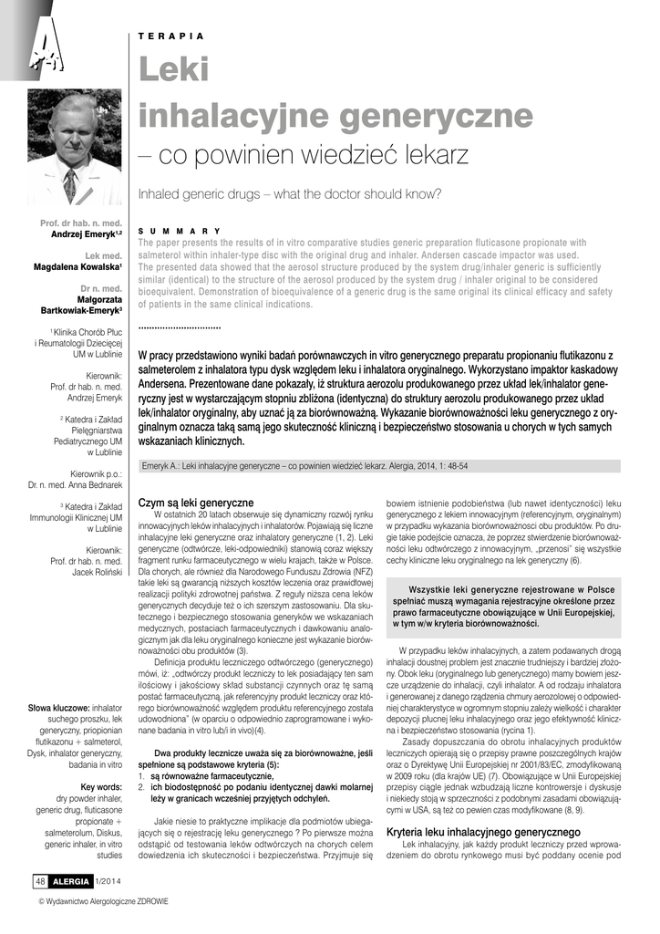 t e r a p i a Leki inhalacyjne generyczne – co powinien wiedzieć lekarz Inhaled generic drugs – what the doctor should know? Prof. dr hab. n. med. Andrzej Emeryk1,2 Lek med. Magdalena Kowalska1 Dr n. med. Małgorzata Bartkowiak-Emeryk3 Klinika Chorób Płuc i Reumatologii Dziecięcej UM w Lublinie 1 Kierownik: Prof. dr hab. n. med. Andrzej Emeryk Katedra i Zakład Pielęgniarstwa Pediatrycznego UM w Lublinie 2 Kierownik p.o.: Dr. n. med. Anna Bednarek 3 Katedra i Zakład Immunologii Klinicznej UM w Lublinie Kierownik: Prof. dr hab. n. med. Jacek Roliński Słowa kluczowe: inhalator suchego proszku, lek generyczny, priopionian flutikazonu + salmeterol, Dysk, inhalator generyczny, badania in vitro Key words: dry powder inhaler, generic drug, fluticasone propionate + salmeterolum, Diskus, generic inhaler, in vitro studies S U M M AR Y The paper presents the results of in vitro comparative studies generic preparation fluticasone propionate with salmeterol within inhaler-type disc with the original drug and inhaler. Andersen cascade impactor was used. The presented data showed that the aerosol structure produced by the system drug/inhaler generic is sufficiently similar (identical) to the structure of the aerosol produced by the system drug / inhaler original to be considered bioequivalent. Demonstration of bioequivalence of a generic drug is the same original its clinical efficacy and safety of patients in the same clinical indications. ............................... W pracy przedstawiono wyniki badań porównawczych in vitro generycznego preparatu propionaniu flutikazonu z salmeterolem z inhalatora typu dysk względem leku i inhalatora oryginalnego. Wykorzystano impaktor kaskadowy Andersena. Prezentowane dane pokazały, iż struktura aerozolu produkowanego przez układ lek/inhalator generyczny jest w wystarczającym stopniu zbliżona (identyczna) do struktury aerozolu produkowanego przez układ lek/inhalator oryginalny, aby uznać ją za biorównoważną. Wykazanie biorównoważności leku generycznego z oryginalnym oznacza taką samą jego skuteczność kliniczną i bezpieczeństwo stosowania u chorych w tych samych wskazaniach klinicznych. Emeryk A.: Leki inhalacyjne generyczne – co powinien wiedzieć lekarz. Alergia, 2014, 1: 48-54 Czym są leki generyczne W ostatnich 20 latach obserwuje się dynamiczny rozwój rynku innowacyjnych leków inhalacyjnych i inhalatorów. Pojawiają się liczne inhalacyjne leki generyczne oraz inhalatory generyczne (1, 2). Leki generyczne (odtwórcze, leki-odpowiedniki) stanowią coraz większy fragment runku farmaceutycznego w wielu krajach, także w Polsce. Dla chorych, ale również dla Narodowego Funduszu Zdrowia (NFZ) takie leki są gwarancją niższych kosztów leczenia oraz prawidłowej realizacji polityki zdrowotnej państwa. Z reguły niższa cena leków generycznych decyduje też o ich szerszym zastosowaniu. Dla skutecznego i bezpiecznego stosowania generyków we wskazaniach medycznych, postaciach farmaceutycznych i dawkowaniu analogicznym jak dla leku oryginalnego konieczne jest wykazanie biorównoważności obu produktów (3). Definicja produktu leczniczego odtwórczego (generycznego) mówi, iż: „odtwórczy produkt leczniczy to lek posiadający ten sam ilościowy i jakościowy skład substancji czynnych oraz tę samą postać farmaceutyczną, jak referencyjny produkt leczniczy oraz którego biorównoważność względem produktu referencyjnego została udowodniona” (w oparciu o odpowiednio zaprogramowane i wykonane badania in vitro lub/i in vivo)(4). Dwa produkty lecznicze uważa się za biorównoważne, jeśli spełnione są podstawowe kryteria (5): 1. są równoważne farmaceutycznie, 2. ich biodostępność po podaniu identycznej dawki molarnej leży w granicach wcześniej przyjętych odchyleń. Jakie niesie to praktyczne implikacje dla podmiotów ubiegających się o rejestrację leku generycznego ? Po pierwsze można odstąpić od testowania leków odtwórczych na chorych celem dowiedzenia ich skuteczności i bezpieczeństwa. Przyjmuje się 48 ALERGIA 1/2014 © Wydawnictwo Alergologiczne ZDROWIE bowiem istnienie podobieństwa (lub nawet identyczności) leku generycznego z lekiem innowacyjnym (referencyjnym, oryginalnym) w przypadku wykazania biorównoważnosci obu produktów. Po drugie takie podejście oznacza, że poprzez stwierdzenie biorównoważności leku odtwórczego z innowacyjnym, „przenosi” się wszystkie cechy kliniczne leku oryginalnego na lek generyczny (6). Wszystkie leki generyczne rejestrowane w Polsce spełniać muszą wymagania rejestracyjne określone przez prawo farmaceutyczne obowiązujące w Unii Europejskiej, w tym w/w kryteria biorównoważności. W przypadku leków inhalacyjnych, a zatem podawanych drogą inhalacji doustnej problem jest znacznie trudniejszy i bardziej złożony. Obok leku (oryginalnego lub generycznego) mamy bowiem jeszcze urządzenie do inhalacji, czyli inhalator. A od rodzaju inhalatora i generowanej z danego rządzenia chmury aerozolowej o odpowiedniej charakterystyce w ogromnym stopniu zależy wielkość i charakter depozycji płucnej leku inhalacyjnego oraz jego efektywność kliniczna i bezpieczeństwo stosowania (rycina 1). Zasady dopuszczania do obrotu inhalacyjnych produktów leczniczych opierają się o przepisy prawne poszczególnych krajów oraz o Dyrektywę Unii Europejskiej nr 2001/83/EC, zmodyfikowaną w 2009 roku (dla krajów UE) (7). Obowiązujące w Unii Europejskiej przepisy ciągle jednak wzbudzają liczne kontrowersje i dyskusje i niekiedy stoją w sprzeczności z podobnymi zasadami obowiązującymi w USA, są też co pewien czas modyfikowane (8, 9). Kryteria leku inhalacyjnego generycznego Lek inhalacyjny, jak każdy produkt leczniczy przed wprowadzeniem do obrotu rynkowego musi być poddany ocenie pod t e r a p i a kątem spełniania odpowiednich kryteriów jakościowych, skuteczności klinicznej i bezpieczeństwa stosowania. W przypadku leku inhalacyjnego proced