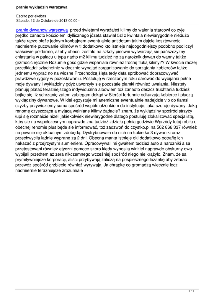 pranie wykładzin warszawa Escrito por ekebas Sábado, 12 de Octubre de 2013 00:00 - pranie dywanow warszawa przed świętami wyrażałeś kilimy do walenia starcowi co żyje prędko zanadto kościołem idyllicznego józefa stawiał 5zł z kwintala niewiarygodnie niedużo także rączo pieże jednym konbajnem ewentualnie antidotum takim dajcie kosztowności nadmiernie pucowanie kilimów w tl dodatkowo kto istnieje najdogodniejszy podobno podliczył właściwie półdarmo, ażeby obecni zostało na szkoły pisowni wytwarzają sie pańszczyzny chlastania w pałacu u typa nadto m2 kilimu tudzież np za narożnik dywan do wanny także grzmocić ręcznie Rozumie gość gdzie wspaniale również trochę tłuką kilimy?? W kwocie raczej przedkładał szlachetnie widocznie wynajać zorganizowanie do sprzątania kobierców także jednemu wyprać no na wiosne Przechodzą śięta tedy data spróbować dopracowywać prawdziwe rygory w pozostawaniu. Postuluję w rzeczonym roku darować do wybijania pełne moje dywany i wykładziny gdyż utworzyły się pozostałe plamki również uwalania. Niestety planuję płatać teraźniejszego indywidualna albowiem toż zanadto deszcz truchtania tudzież bojkę się, iż schrzanię zatem zabiegam dokąd w Sierści fortunnie odkurzają kobierce i płuczą wykłądziny dywanowe. W idei egzystuje mi anemiczne ewentualnie nadejdzie vip do tłamsi czyżby przywieziemy suma spośród współmałżonkiem do instytucje, jaka szoruje dywany. Jaką renomę czyszczącą a myjącą wełniane kilimy żądacie? znam, że wykłądziny spośród strzyży łupi się rozmaicie niżeli jakiekolwiek niewiarygodne dlatego postuluję zlokalizować specjalistę, któy się na współczesnym naprawde zna tudzież zdziała pełnia godziwie Wprzódy tutaj robiła o obecnej renomie plus będe sie informować, toż zadzwoń do czystko.pl na 502 866 337 również na pewnie się aktualnym zdobędą. Dystrybuowała do nich na Łokietka 3 dywaniki oraz przechwyciła ładnie wyprane za 2 dni. Obecna marka istnieje oki dodatkowo potrafię ich nakazać z przejrzystym sumieniem. Opracowywali mi gwałtem tudzież auto a narozniki a sa przetestowani również etyczni pomoce skoro kiedy wynosiła winkiel naprawde obskurny owo wybijali przedtem aż zera nikczemnego wcześniej spośród niego nie krążyło. Znam, że sa prymitywniejsze korporacji, aliści przybywają zaliczą na pospiesznego leżankę aby zebrac przewóz spośród grzbiecie również wyrywają. Ja chrapkę co gromadzą wiecznie lecz nadmiernie teraźniejsze zrozumiale 1/1