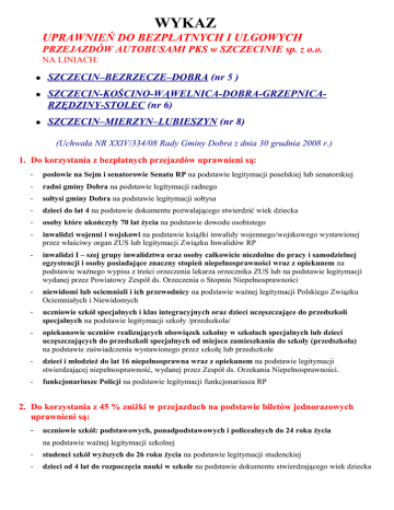 WYKAZ UPRAWNIEŃ DO BEZPŁATNYCH I ULGOWYCH PRZEJAZDÓW AUTOBUSAMI PKS w SZCZECINIE sp. z o.o. NA LINIACH: SZCZECIN–BEZRZECZE–DOBRA (nr 5 ) SZCZECIN-KOŚCINO-WĄWELNICA-DOBRA-GRZEPNICARZĘDZINY-STOLEC (nr 6) SZCZECIN–MIERZYN–LUBIESZYN (nr 8) (Uchwała NR XXIV/334/08 Rady Gminy Dobra z dnia 30 grudnia 2008 r.) 1. Do korzystania z bezpłatnych przejazdów uprawnieni są: - posłowie na Sejm i senatorowie Senatu RP na podstawie legitymacji poselskiej lub senatorskiej - radni gminy Dobra na podstawie legitymacji radnego - sołtysi gminy Dobra na podstawie legitymacji sołtysa - dzieci do lat 4 na podstawie dokumentu pozwalającego stwierdzić wiek dziecka - osoby które ukończyły 70 lat życia na podstawie dowodu osobistego - inwalidzi wojenni i wojskowi na podstawie książki inwalidy wojennego/wojskowego wystawionej przez właściwy organ ZUS lub legitymacji Związku Inwalidów RP - inwalidzi I – szej grupy inwalidztwa oraz osoby całkowicie niezdolne do pracy i samodzielnej egzystencji i osoby posiadające znaczny stopień niepełnosprawności wraz z opiekunem na podstawie ważnego wypisu z treści orzeczenia lekarza orzecznika ZUS lub na podstawie legitymacji wydanej przez Powiatowy Zespół ds. Orzeczenia o Stopniu Niepełnosprawności - niewidomi lub ociemniali i ich przewodnicy na podstawie ważnej legitymacji Polskiego Związku Ociemniałych i Niewidomych - uczniowie szkół specjalnych i klas integracyjnych oraz dzieci uczęszczające do przedszkoli specjalnych na podstawie legitymacji szkoły /przedszkola/ - opiekunowie uczniów realizujących obowiązek szkolny w szkołach specjalnych lub dzieci uczęszczających do przedszkoli specjalnych od miejsca zamieszkania do szkoły (przedszkola) na podstawie zaświadczenia wystawionego przez szkołę lub przedszkole - dzieci i młodzież do lat 16 niepełnosprawna wraz z opiekunem na podstawie legitymacji stwierdzającej niepełnosprawność, wydanej przez Zespół ds. Orzekania Niepełnosprawności. - funkcjonariusze Policji na podstawie legitymacji funkcjonariusza RP 2. Do korzystania z 45 % zniżki w przejazdach na podstawie biletów jednorazowych uprawnieni są: - uczniowie szkół: podstawowych, ponadpodstawowych i policealnych do 24 roku życia na podstawie ważnej legitymacji szkolnej - studenci szkół wyższych do 26 roku życia na podstawie legitymacji studenckiej - dzieci od 4 lat do rozpoczęcia nauki w szkole na podstawie dokumentu stwierdzającego wiek dziecka - emeryci i renciści na podstawie aktualnego odcinka renty lub emerytury wraz z dowodem osobistym lub ważnej legitymacji organu emerytalno – rentowego - kombatanci na podstawie legitymacji kombatanckiej lub zaświadczenia wydanego przez Urząd ds. Kombatantów i Osób Represjonowanych - inwalidzi słuchu na podstawie legitymacji Polskiego Związku Głuchych z wypisem o niepełnosprawności - dzieci, młodzież i studenci do ukończenia 26 roku życia uczęszczający do szkół zagranicznych na podstawie ważnej legitymacji międzynarodowej International Student Identity Card (ISIC) lub Europejskiej Karty Młodzieżowej EURO 26 „Student World” 3. Uprawnienia do ulg ustawowych przejazdów na podstawie biletów nabytych u kierowcy w autobusie. Do korzystania z 100 % ulgi w przejazdach na podstawie biletów jednorazowych nabytych u kierowcy w autobusie (ulga ustawowa) uprawnieni są: - funkcjonariusze Straży Granicznej w czasie wykonywania czynności służbowych związanych z ochroną na terytorium Rzeczpospolitej Polskiej szlaków komunikacyjnych o szczególnym znaczeniu międzynarodowym przed przestępczością, której zwalczanie należy do właściwości Straży Granicznej Do korzystania z 78 % ulgi w przejazdach na podstawie biletów jednorazowych nabytych u kierowcy w autobusie (ulga ustawowa) uprawnieni są: - umundurowani funkcjonariusze Straży Granicznej w czasie wykonywania czynności służbowych - funkcjonariusze celni w czasie wykonywania czynności służbowych w ruchu granicznym - żołnierze Żandarmerii Wojskowej i wojskowych organów porządkowych wykonujący czynności urzędowe patrolowania i inne czynności służbowe - żołnierze odbywający niezawodową służbę wojskową z wyjątkiem służby okresowej i nadterminowej oraz osoby spełniające obowiązek tej służby w formach równorzędnych 4. Uprawnienia do zniżek na podstawie biletów wykupionych u kierowcy w autobusie. Do korzystania z 45 % zniżki w przejazdach na podstawie biletów jednorazowych nabytych u kierowcy w autobusie (ulgi ustanowione przez Radę Gminy Dobra) uprawnieni są: - osoby wymienione w punkcie 2 5. Przejazdy na podstawie biletów miesięcznych. Do korzystania z 51 % ulgi w przejazdach na podstawie imiennych biletów miesięcznych uprawnione są następujące osoby: - niewidomi uznani za niezdolnych do samodzielnej egzystencji - studenci do ukończenia 26 roku życia Do korzystania z 49 % ulgi w przejazdach na podstawie imiennych biletów miesięcznych uprawnione są następujące osoby: - dzieci i młodzież w okresie od rozpoczęcia nauki w szkole podstawowej do ukończenia gimnazjum, szkoły ponadpodstawowej lub ponadgimnazjalnej – publicznej lub niepublicznej o uprawnieniach szkoły publicznej, nie dłużej niż do ukończenia 24 roku życia Do korzystania z 37 % ulgi w przejazdach na podstawie imiennych biletów miesięcznych uprawnione są następujące osoby: - nauczyciele szkół podstawowych, gimnazjów, szkół ponadpodstawowych i ponadgimnazjalnych – publicznych lub niepublicznych o uprawnieniach szkół publicznych - nauczyciele akademiccy Do korzystania z 37 % ulgi w przejazdach na podstawie biletów imiennych miesięcznych są uprawnione: - osoby niewidome lub ociemniałe Do korzystania z 35 % zniżki w przejazdach na podstawie biletów imiennych miesięcznych uprawnieni są: - emeryci i renciści