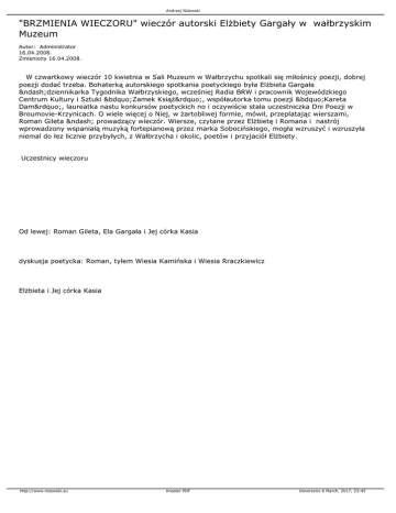 Andrzej Niżewski "BRZMIENIA WIECZORU" wieczór autorski Elżbiety Gargały w wałbrzyskim Muzeum Autor: Administrator 16.04.2008. Zmieniony 16.04.2008. W czwartkowy wieczór 10 kwietnia w Sali Muzeum w Wałbrzychu spotkali się miłośnicy poezji, dobrej poezji dodać trzeba. Bohaterką autorskiego spotkania poetyckiego była Elżbieta Gargała –dziennikarka Tygodnika Wałbrzyskiego, wcześniej Radia BRW i pracownik Wojewódzkiego Centrum Kultury i Sztuki „Zamek Książ”, współautorka tomu poezji „Kareta Dam”, laureatka nastu konkursów poetyckich no i oczywiście stała uczestniczka Dni Poezji w Broumovie-Krzynicach. O wiele więcej o Niej, w żartobliwej formie, mówił, przeplatając wierszami, Roman Gileta – prowadzący wieczór. Wiersze, czytane przez Elżbietę i Romana i nastrój wprowadzony wspaniałą muzyką fortepianową przez marka Sobocińskiego, mogła wzruszyć i wzruszyła niemal do łez licznie przybyłych, z Wałbrzycha i okolic, poetów i przyjaciół Elżbiety. Uczestnicy wieczoru Od lewej: Roman Gileta, Ela Gargała i Jej córka Kasia dyskusja poetycka: Roman, tyłem Wiesia Kamińska i Wiesia Rraczkiewicz Elżbieta i Jej córka Kasia http://www.nizewski.eu Kreator PDF Utworzono 6 March, 2017, 23:45